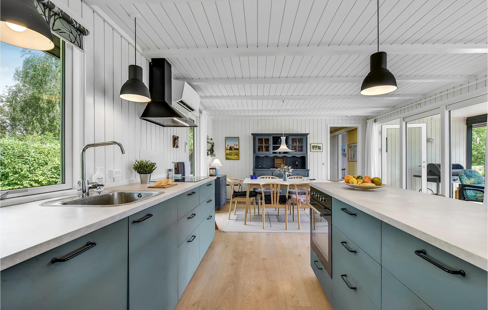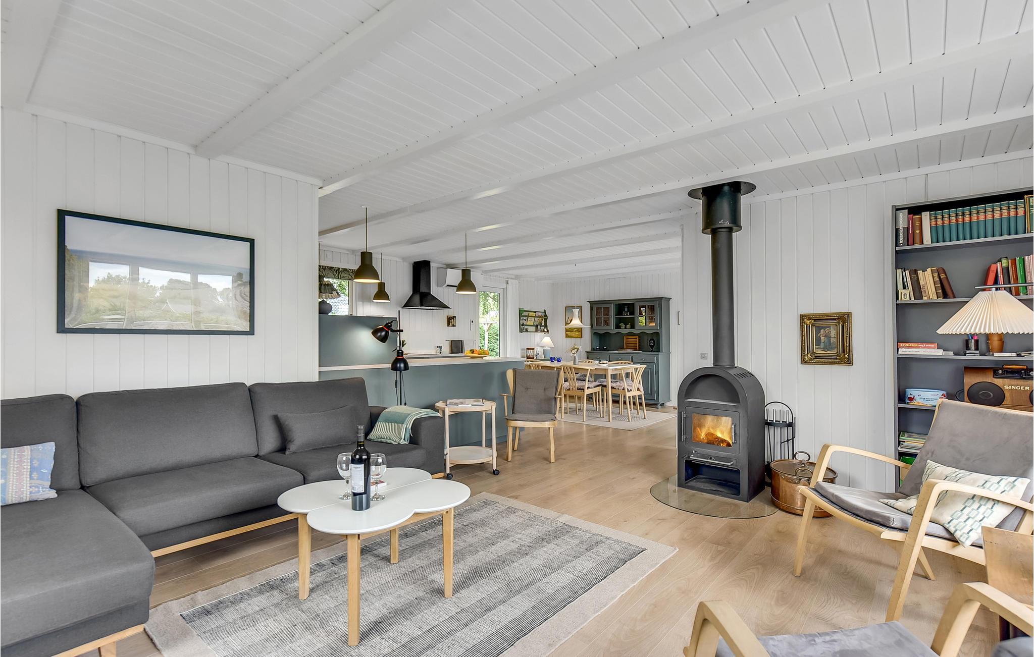 Sommerhuset blev renoveret i 2020, er komfortabelt indrettet og skaber ideelle rammer for et ophold, I vil huske med glæde i lang tid fremover. Her er der tre værelser med gode senge og et stort spisekøkken i forbindelse med stuen. Om aftenen kan I slappe af foran brændeovnen og lytte til flammenes knitren.