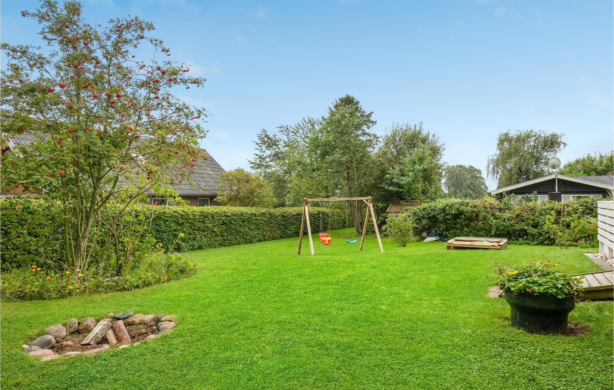 Slap af på terrassen i husets have. I haven er der gynger og en sandkasse til de mindste.