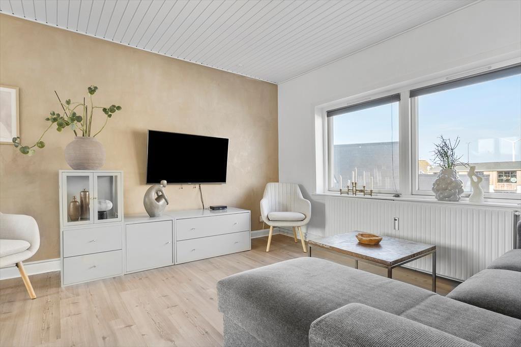 Denne lækre lejlighed byder på en moderne, stilfuld indretning, og med to værelser er her plads til børnefamilien eller to vennepar. Feriehyggen får en hyggelig ramme i den velindrettede opholdsafdeling, og I kan også glæde jer til at trække ud i solen på en stemningsfuld tagterrasse. Placeringen midt i Hvide Sandes centrum giver jer nem adgang til butikkerne, spisestederne og byens stemningsfulde havnemiljø, og I har ligeledes kort gåafstand til Ringkøbing Fjord samt blot 800 meter til badestranden ved Vesterhavet.
