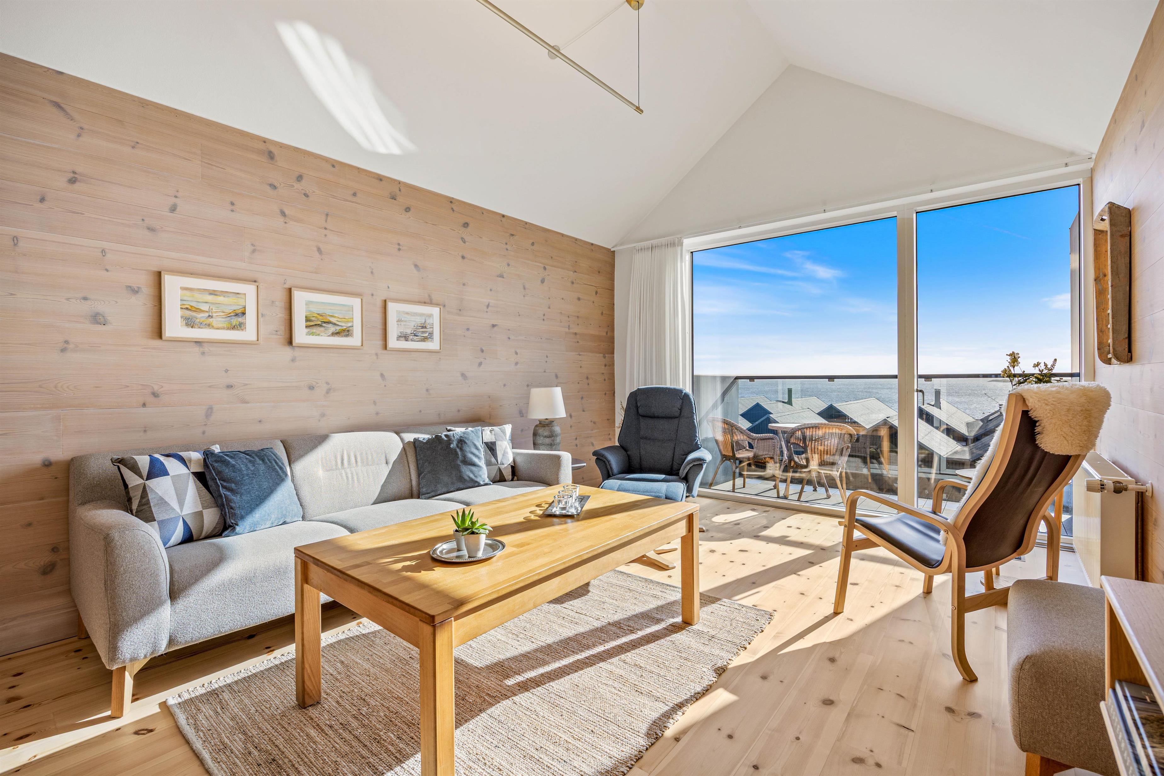 Ferielejligheden fordeler sig på to etager, den er smagfuldt indrettet med masser af fine faciliteter og med store flotte panoramavinduer, der åbner op for den smukke udsigt. Med 2 gode soverum, begge med dobbeltsenge, egner den sig både for familien og for en hyggelig by- eller fiskeferie med et vennepar.