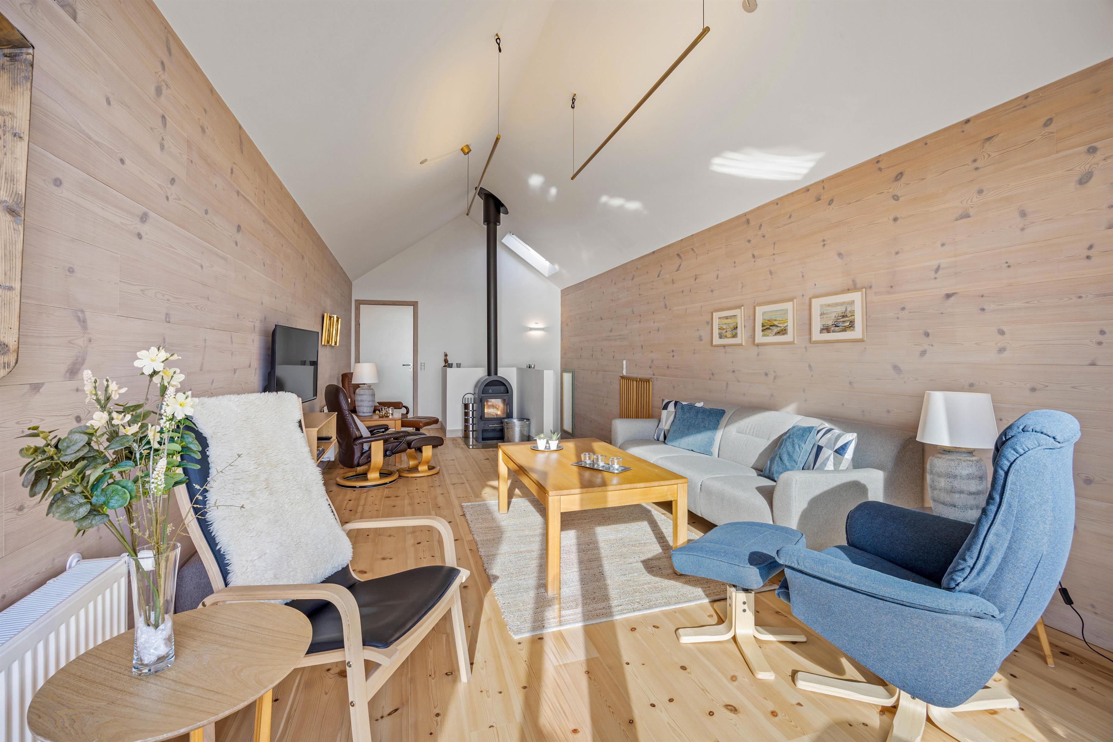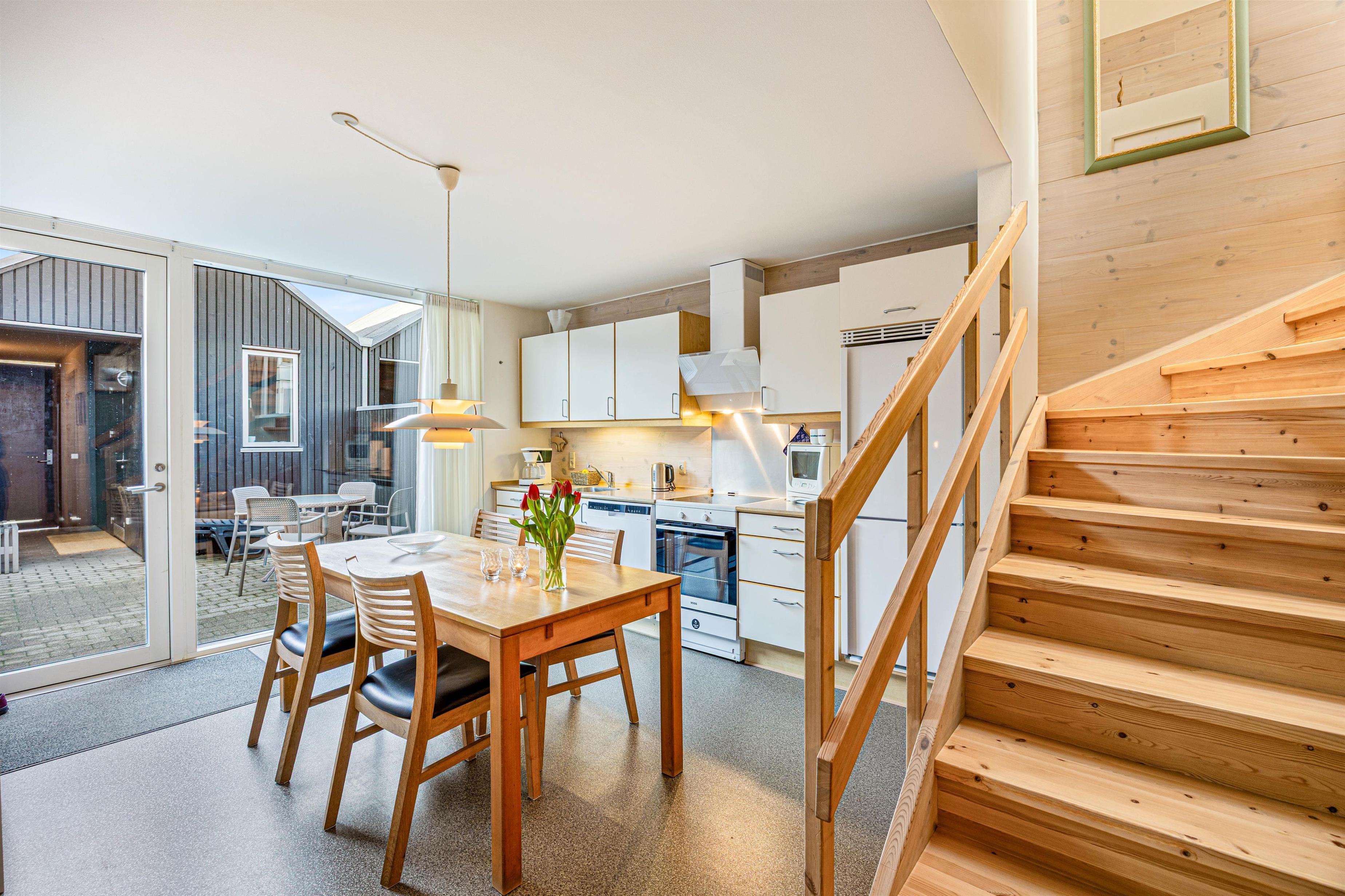 I stueetagen kan der hygges med wellness i saunaen og spabadet, og efter en lang dag med masser af oplevelser, badetur ved stranden, osen i byen eller sildefiskeri ved molen kan I på 1. sal tænde op og hygge omkring brændeovnen. I skal ikke bruge lang tid på de praktiske gøremål i ferielejligheden, da der er en opvaskemaskine i køkkenet samt en vaskemaskine og tørretumbler i bryggerset.