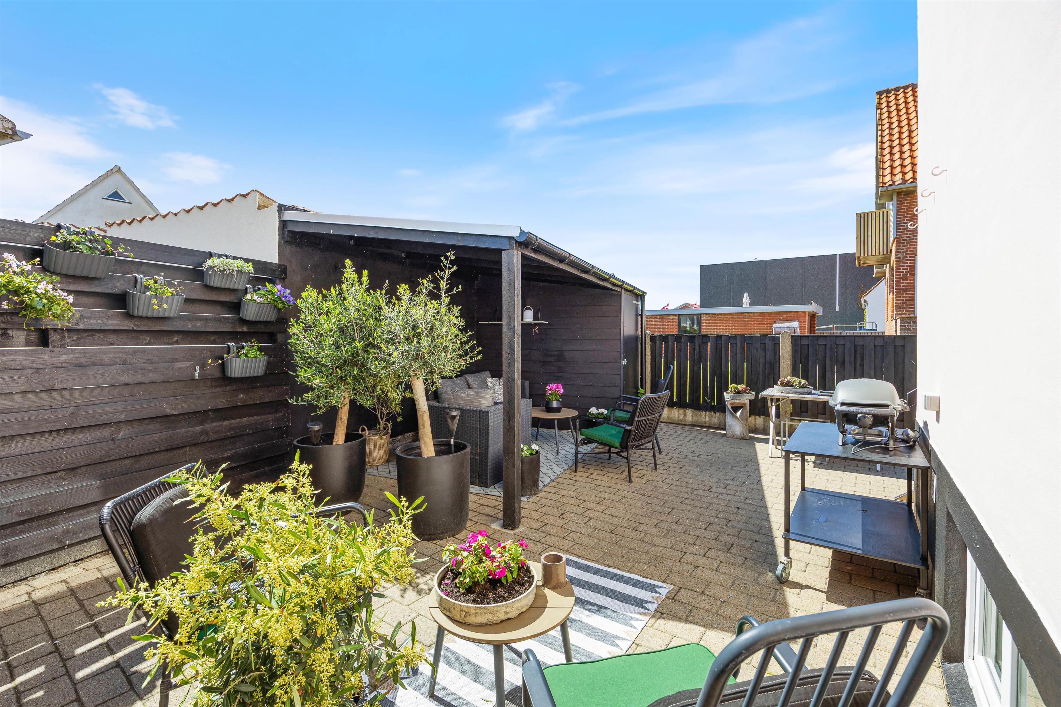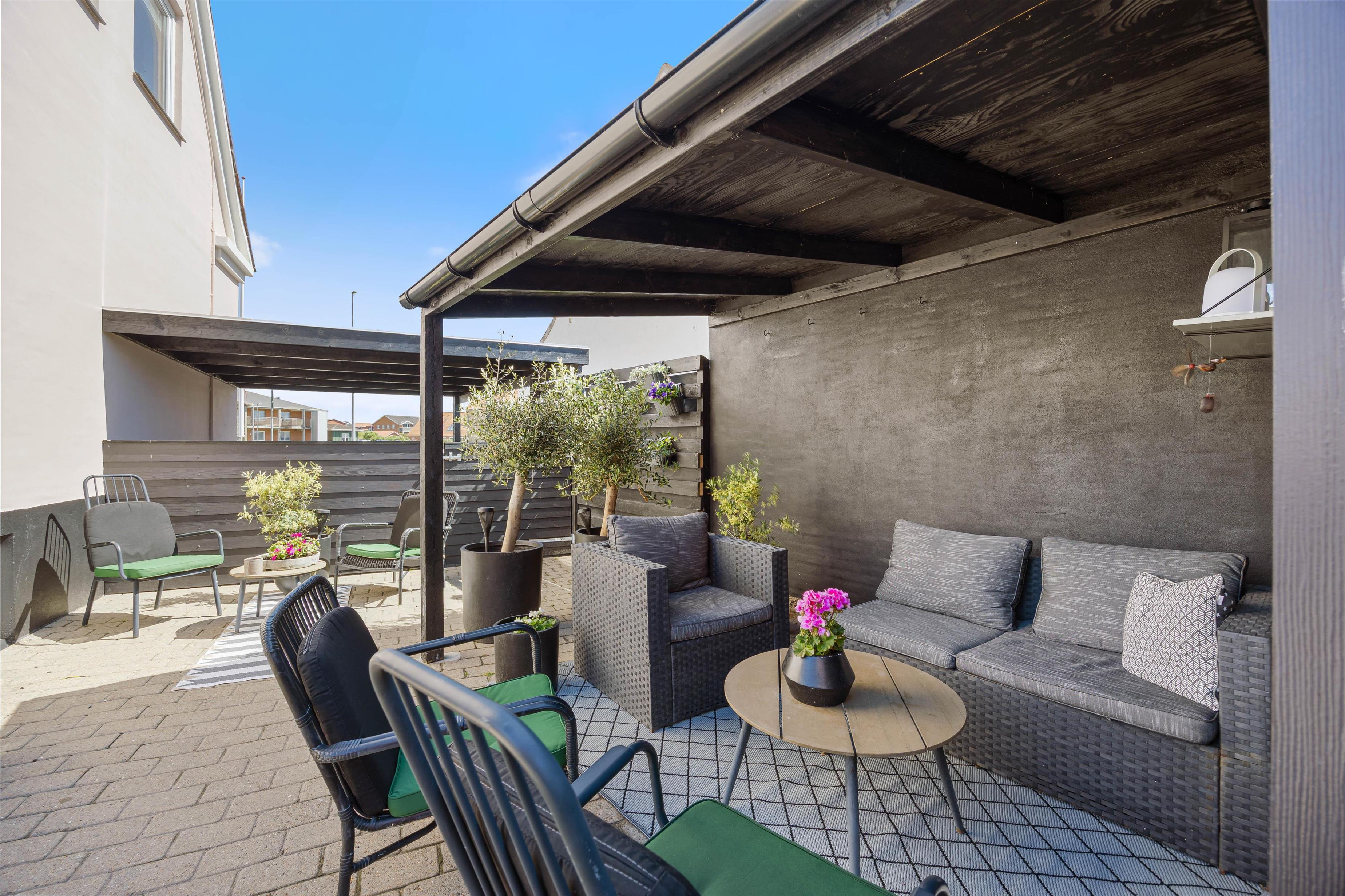 Udenfor venter en lille lukket terrasse, hvor I kan nyde morgenkaffen, imens hunden kan løbe rundt og lege. Havemøbler skaber de perfekte rammer for afslapning i solen, mens grillen står klar til at tilberede sommerens livretter.