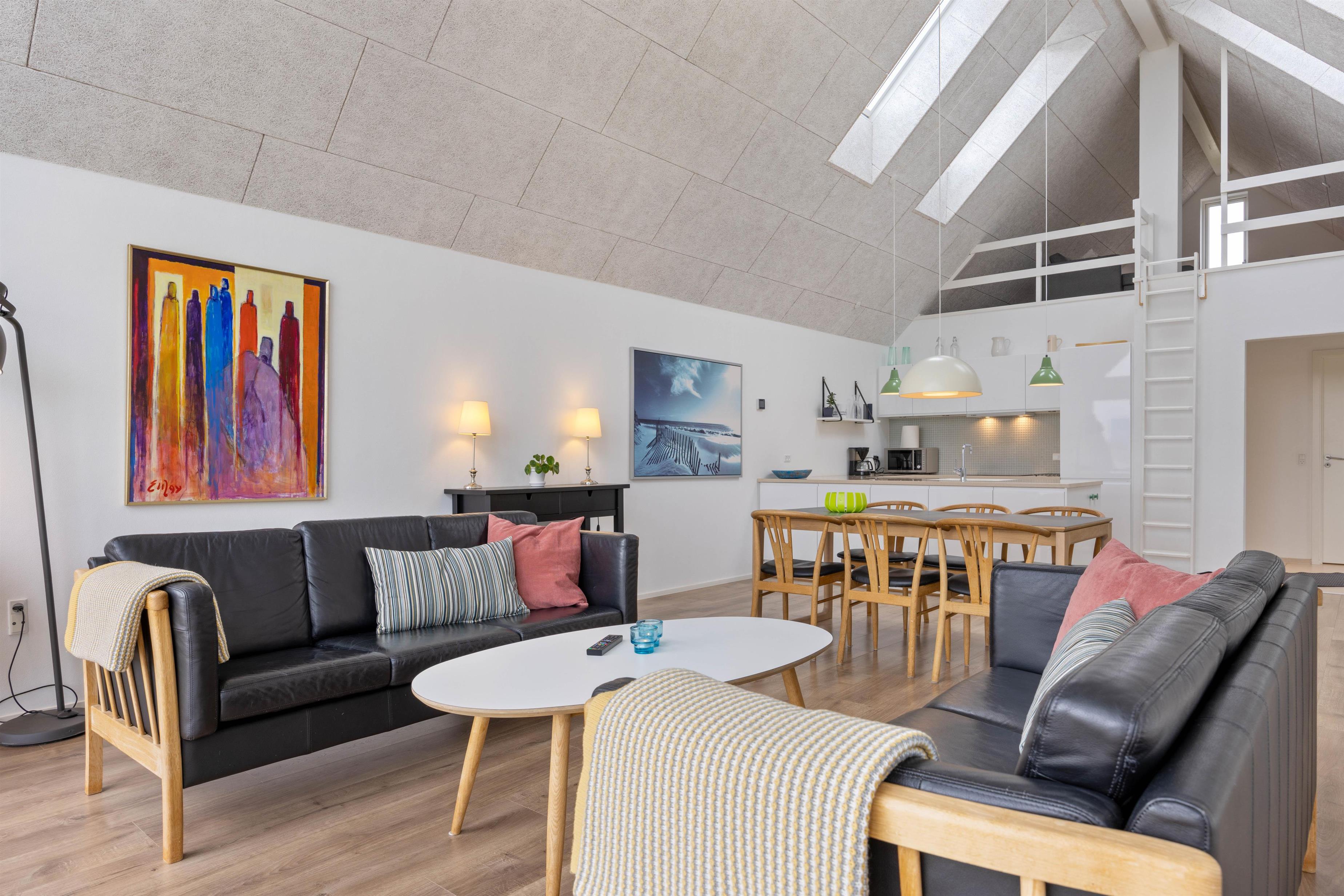 Stuen er lyst indrettet med loft til kip og store vinduer, hvilket også får det til at virke rummeligt.