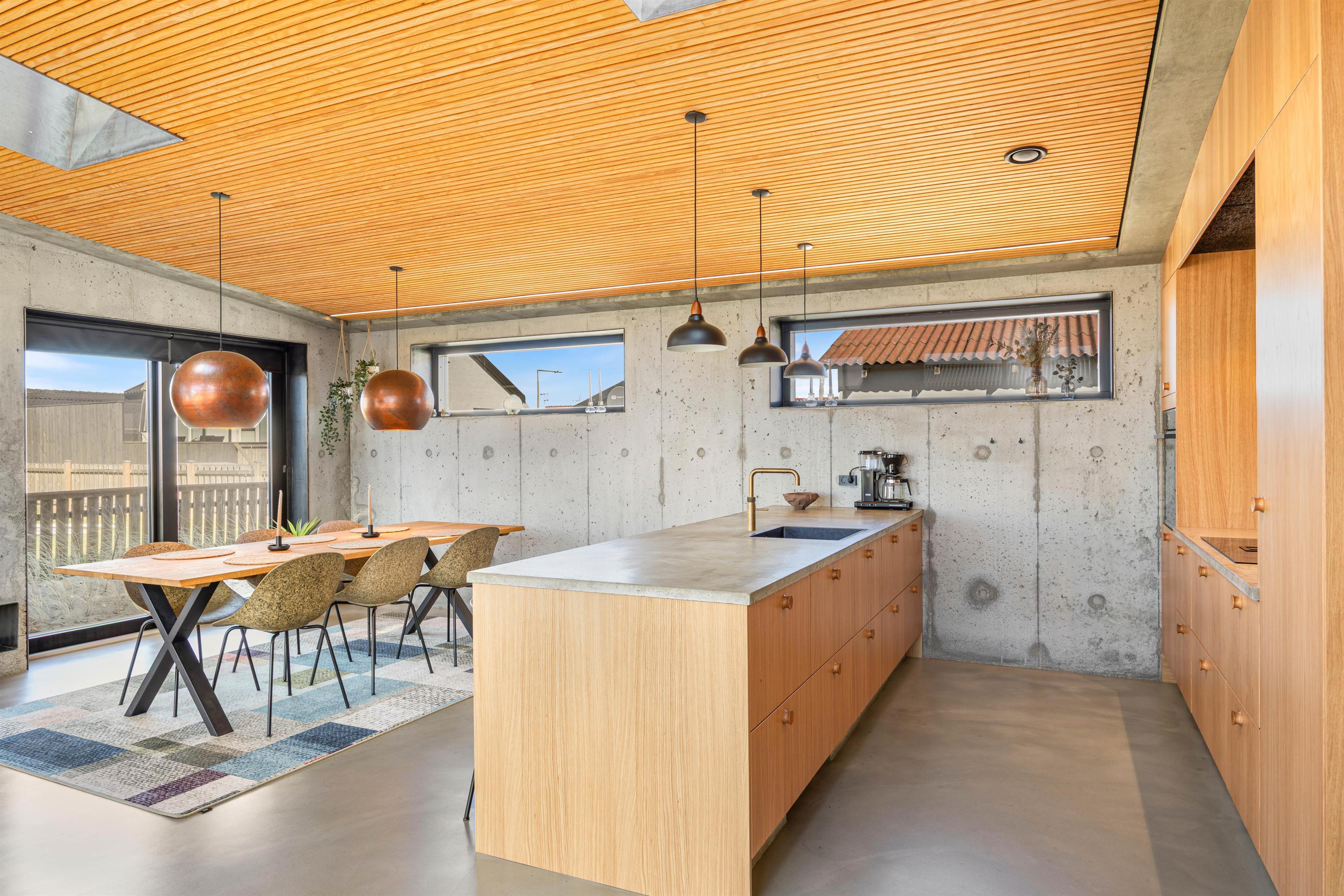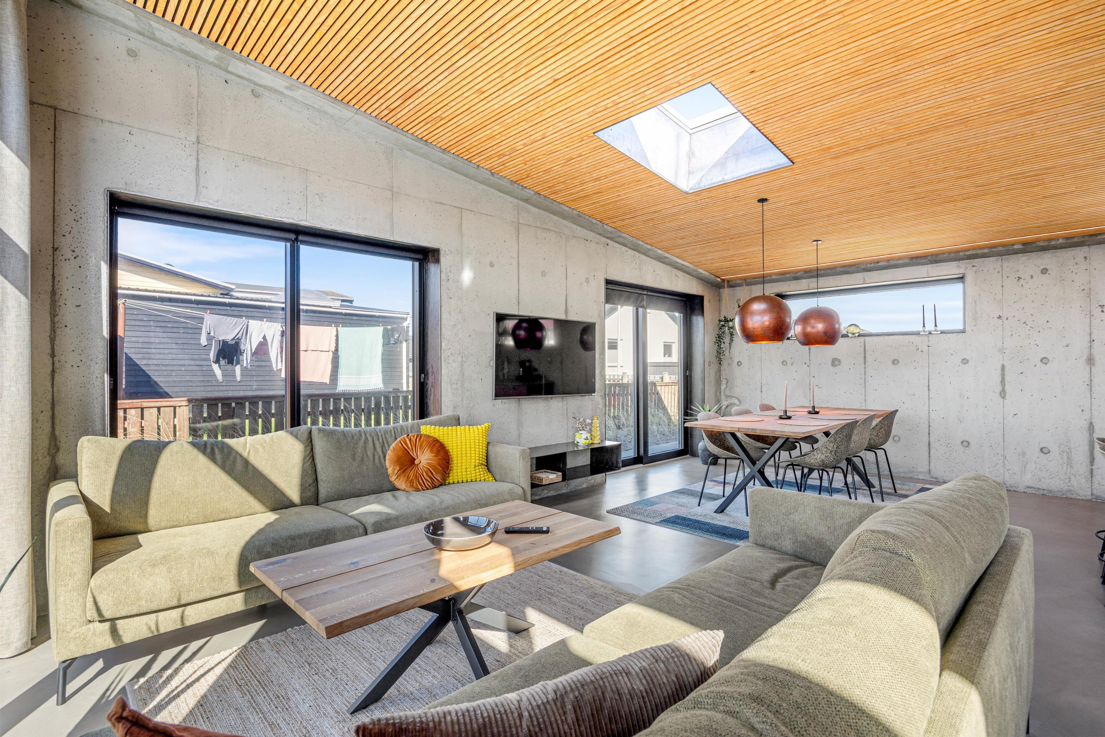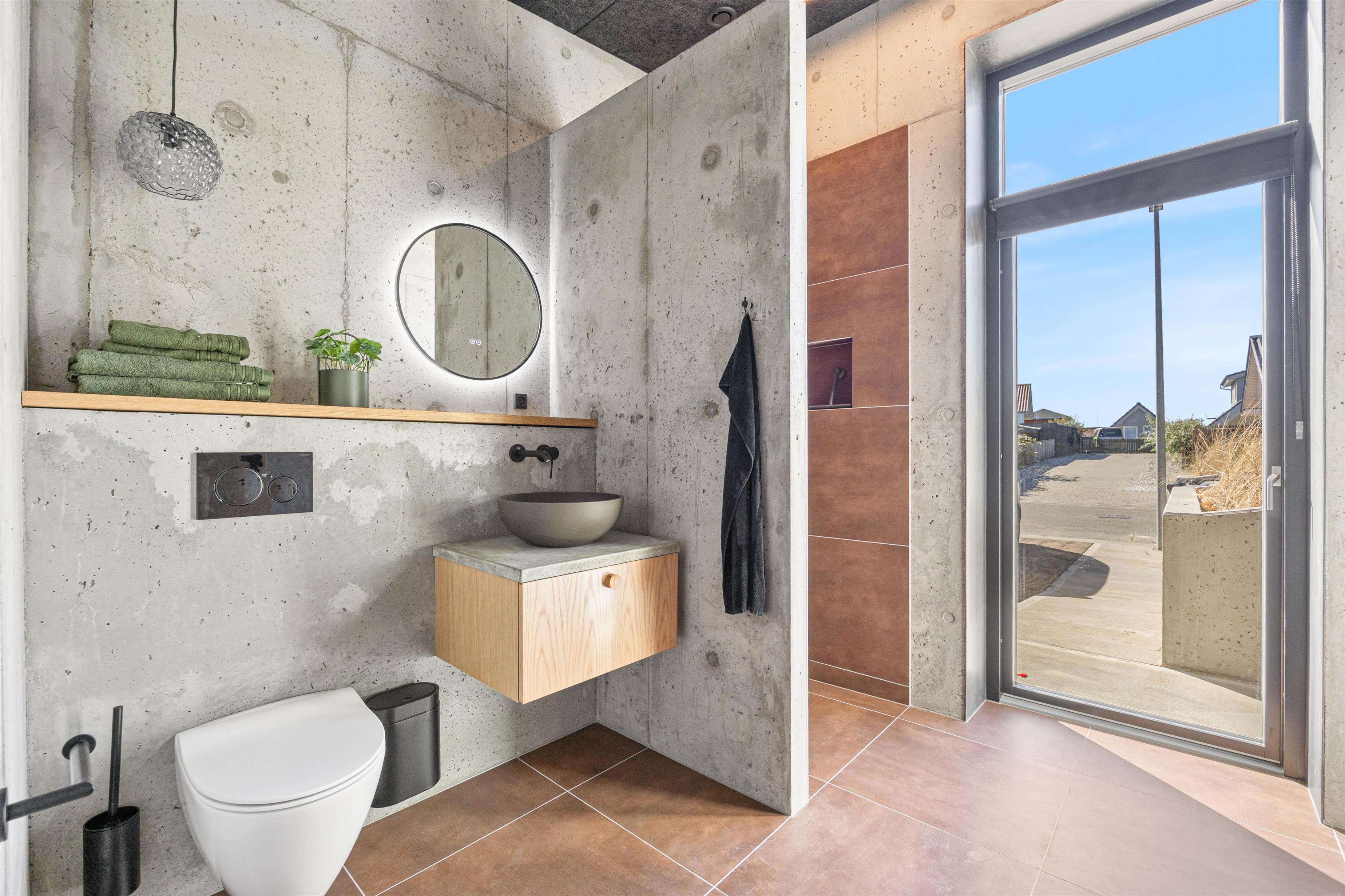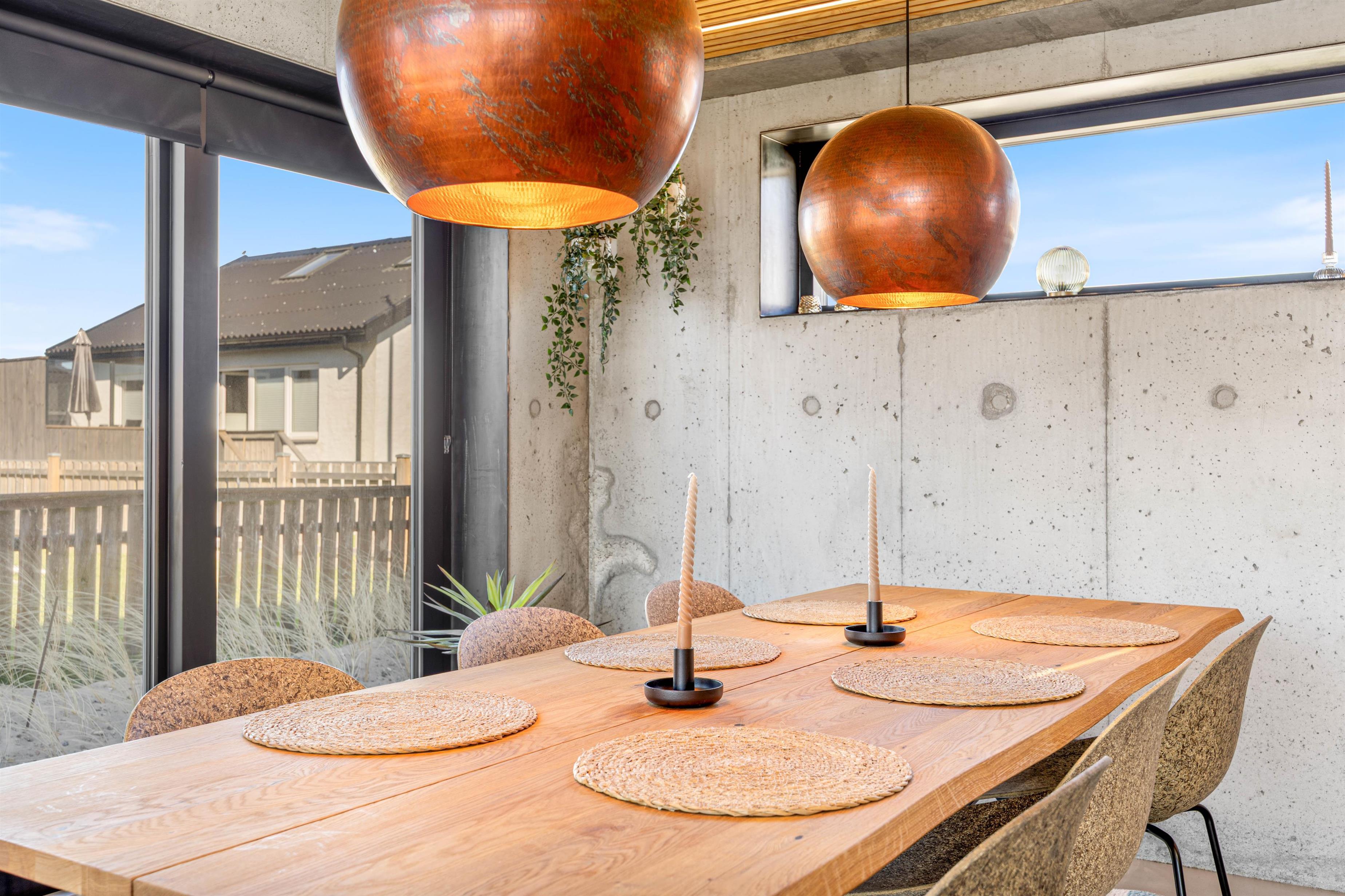 Indretningen er moderne og i skandinavisk stil. Det smukke træ står smukt mod det rustikke betongulv, og her skabes en afslappende atmosfære. Hjerterummet er åbne køkkenalrum, hvor de store vinduer inviterer dagslyset indenfor. Det veludstyrede køkken, stue samt spiseplads smelter her sammen i ét. Med plads til hele familien kan I samles til hyggeligt samvær - uanset om det er afslapning på sofaen, tilberedning af lækre måltider eller hyggelige brætspilsaftner. Fra alrummet er der direkte udgang til terrassen.