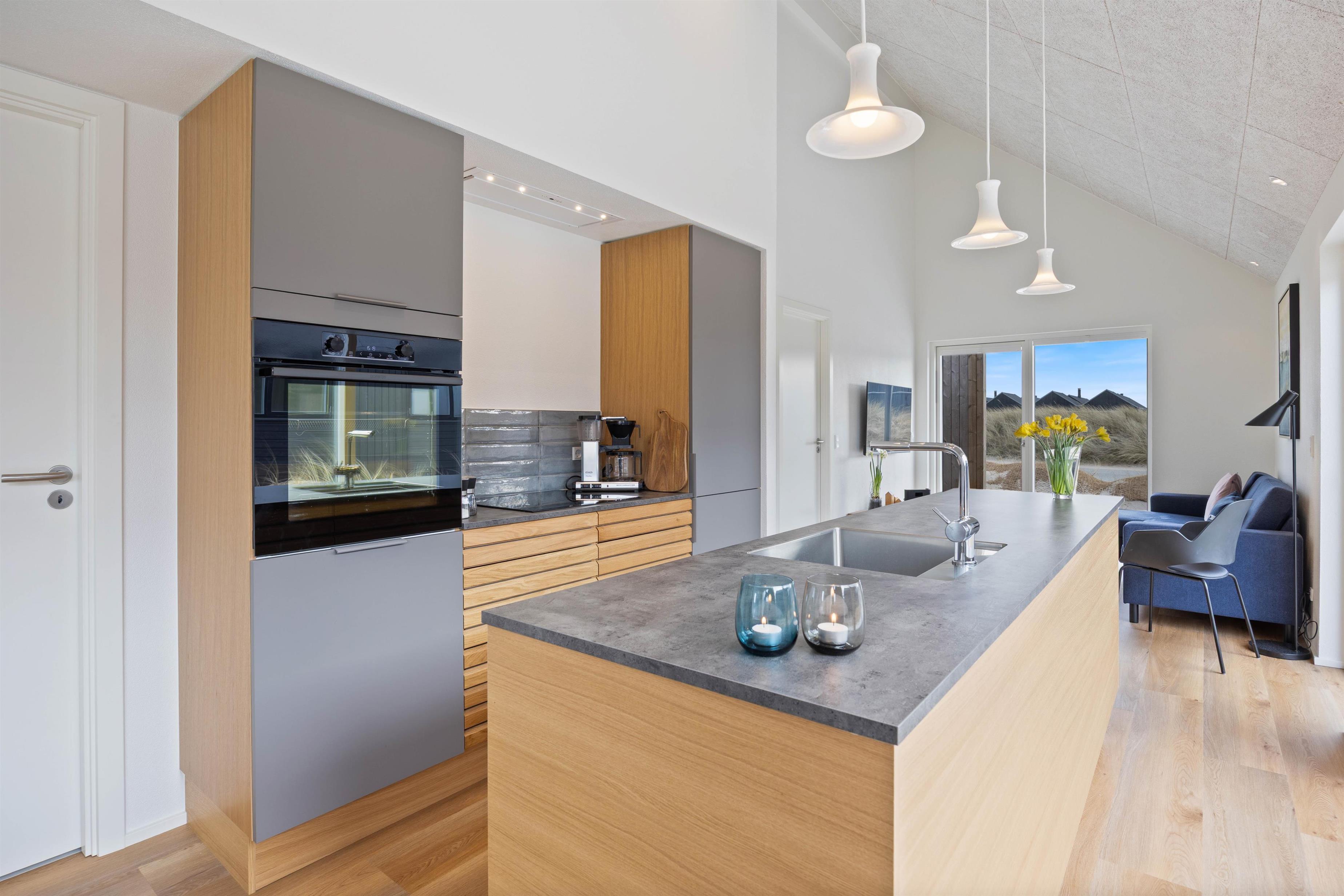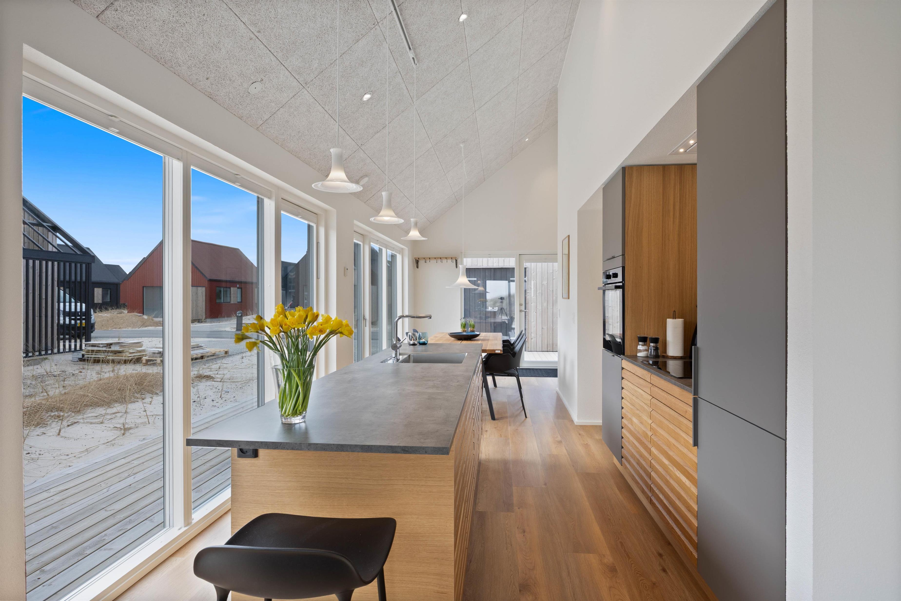 Med det samme I træder ind I sommerhuset, bliver I mødt af en dejlig atmosfære med lyse vægge, store vinduespartier og højt til loftet. Det veludstyrede køkken har en opvaskemaskine, så I kan fokusere mere på at nyde ferien og mindre på opvasken. Herfra er der åben forbindelse til spiseområdet og stuen, hvor møblerne indbyder til afslapning og hyggelige aftener foran tv’et.