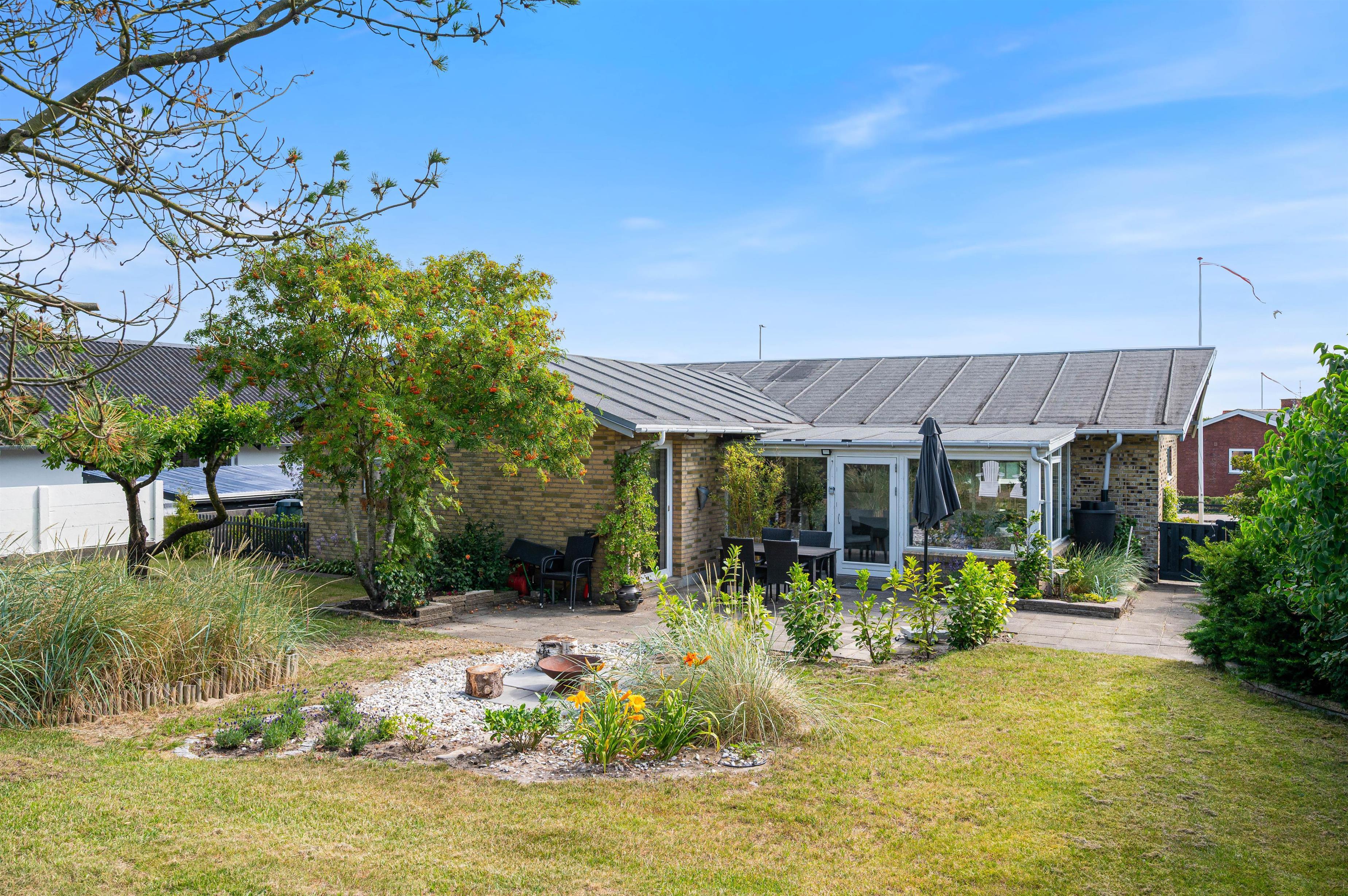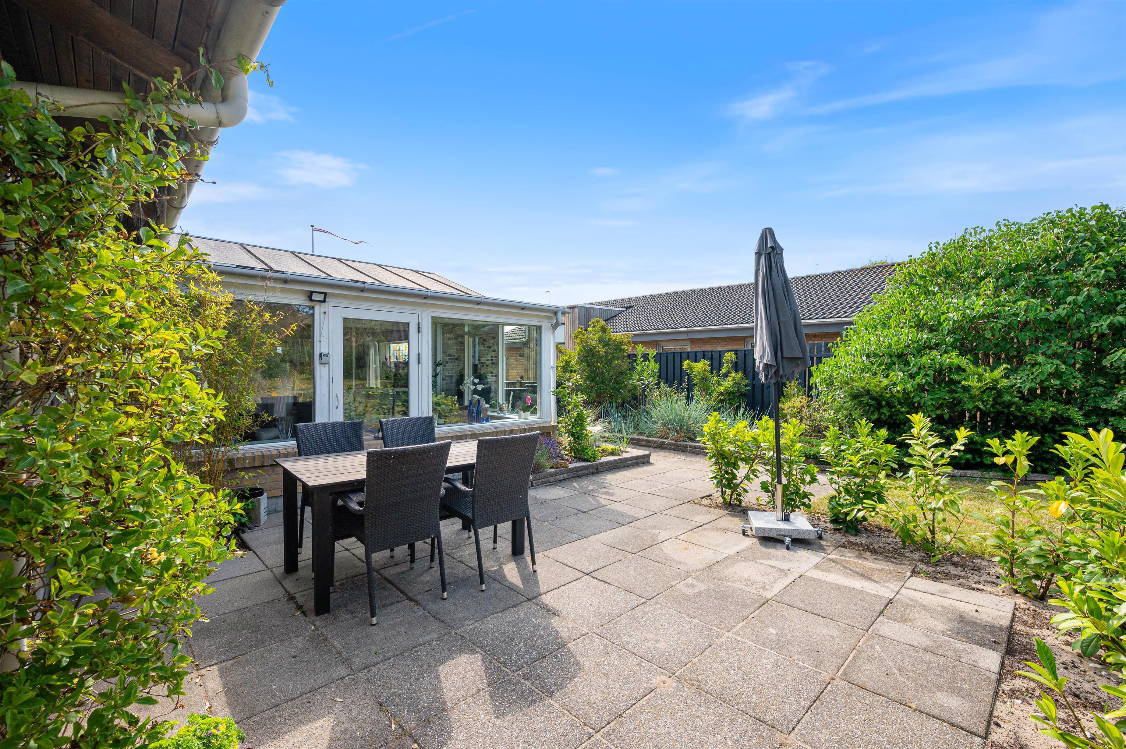 Udenfor venter en dejlig plænegrund, hvor der er masser af plads til at nyde solen eller grille en lækker middag. Havemøblerne inviterer til lange sommeraftener under åben himmel, og den hyggelige udestue giver mulighed for at nyde naturen, selv når det regner udenfor - her kan I slappe af med en kop kaffe, mens I kigger ud på haven.