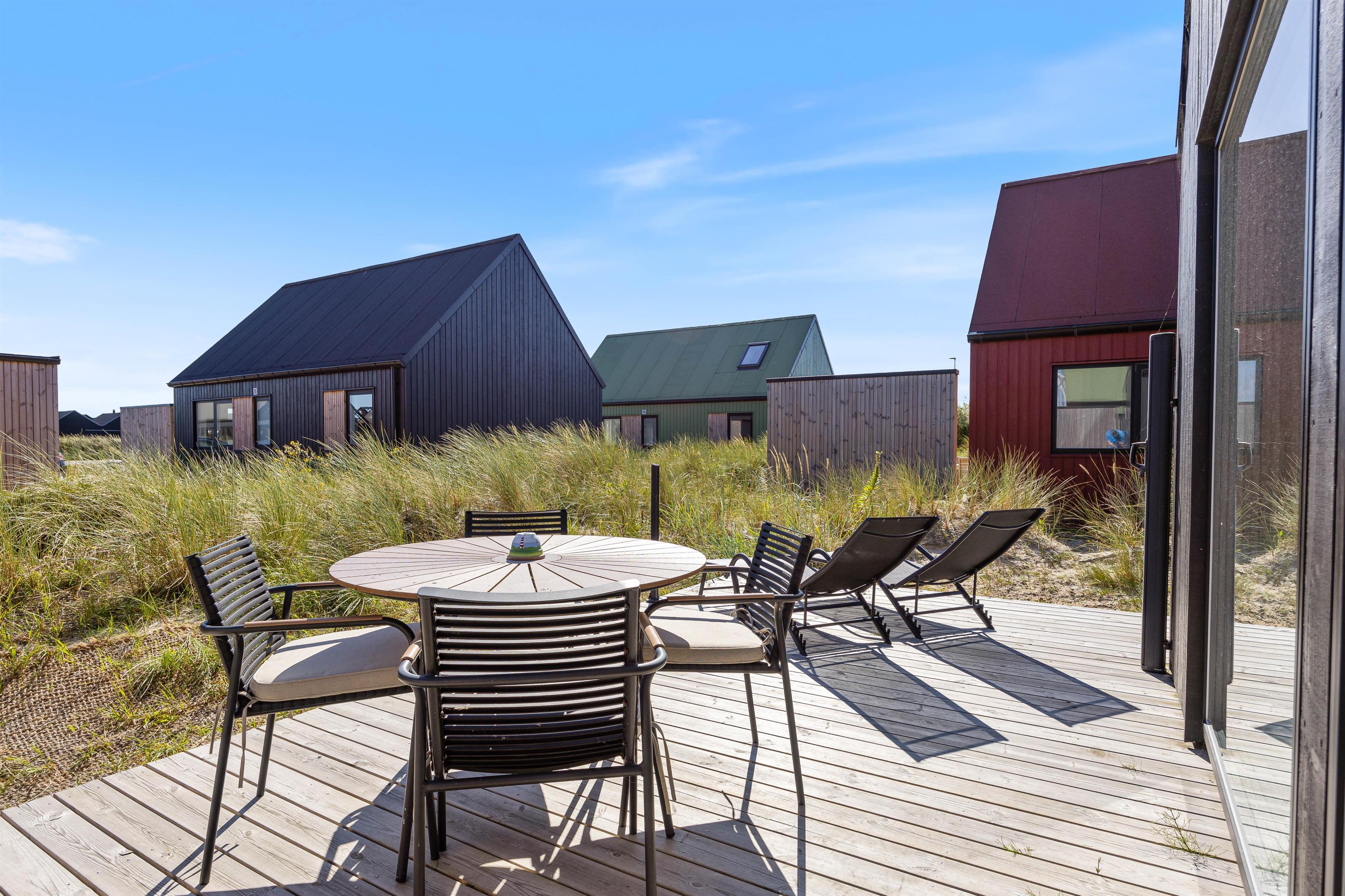 Fra det store vinduesparti i stuen og køkkenet kan I gå ud på den åbne og afskærmede terrasse. Her kan I nyde den flotte udsigt over Langsand, og om morgenen kan I nyde en varm kop kaffe med solopgangen i baggrunden. I kan slå jer ned i de komfortable havemøbler, og når solen skinner, kan I nyde strålerne på sommerhusets solvogne. Om aftenen kan I tilberede en behagelig middag på sommerhusets grill, og er vejret godt, kan I også nyde den på terrassen.