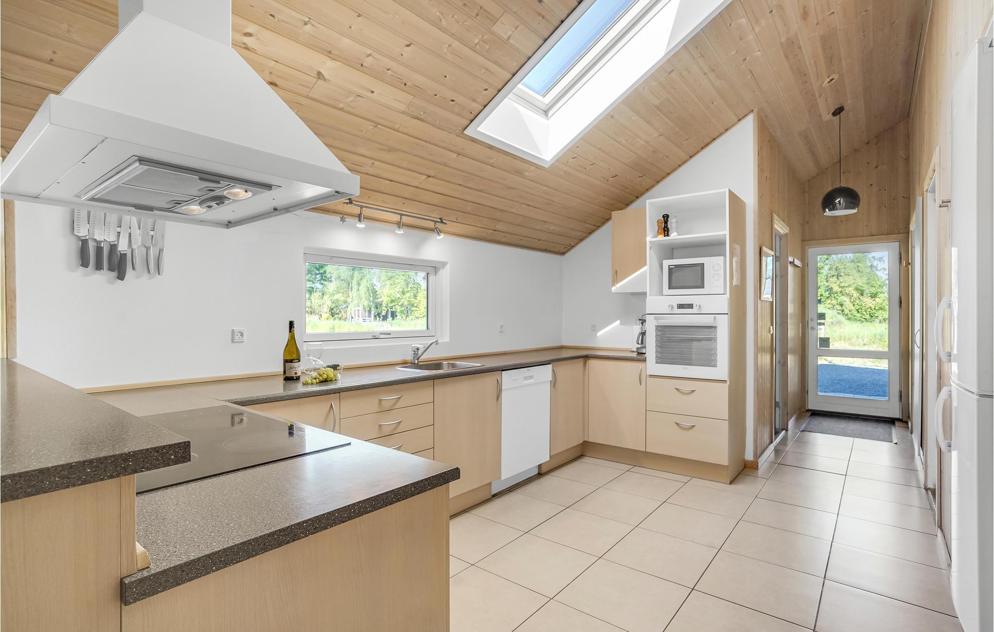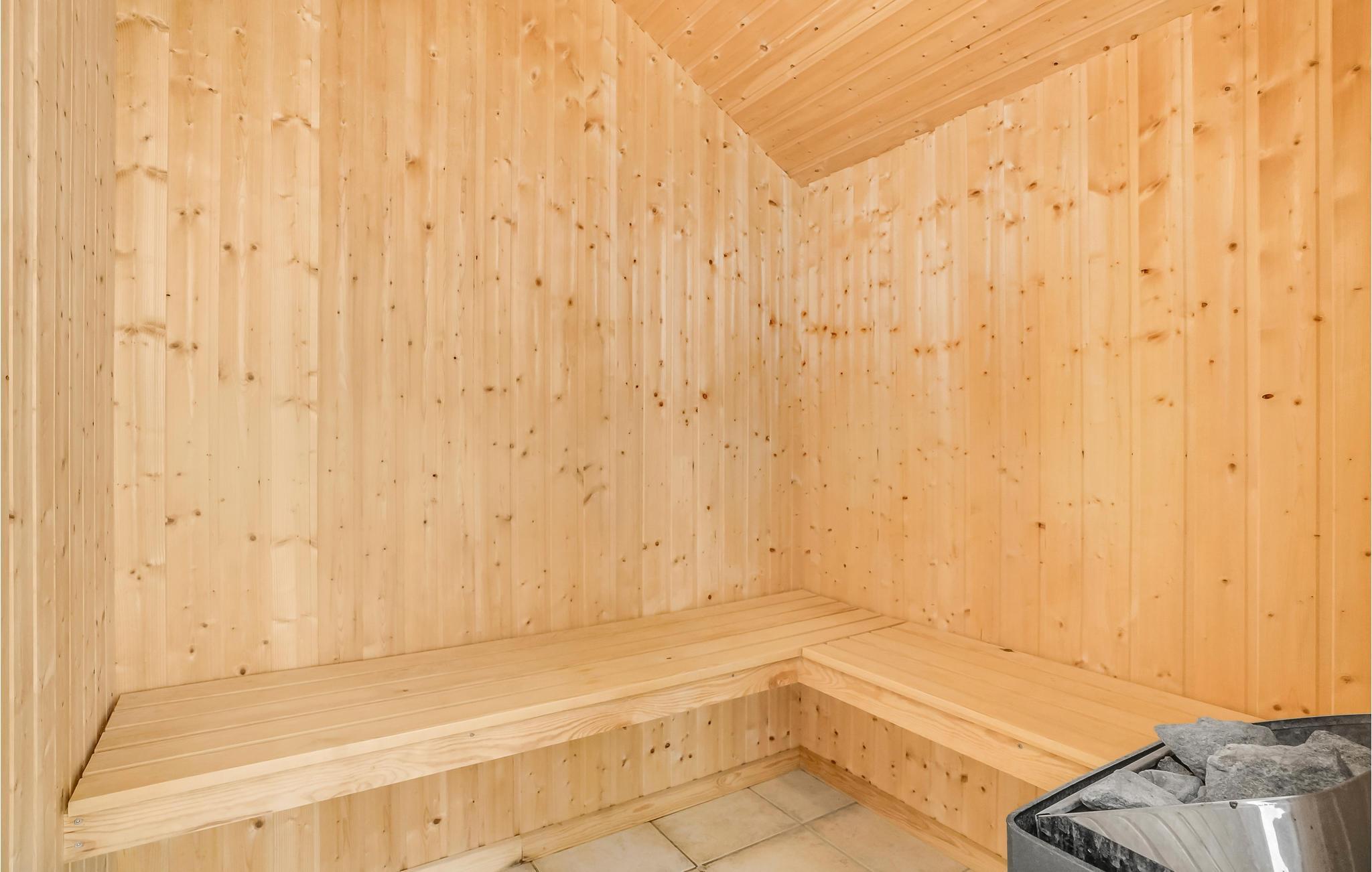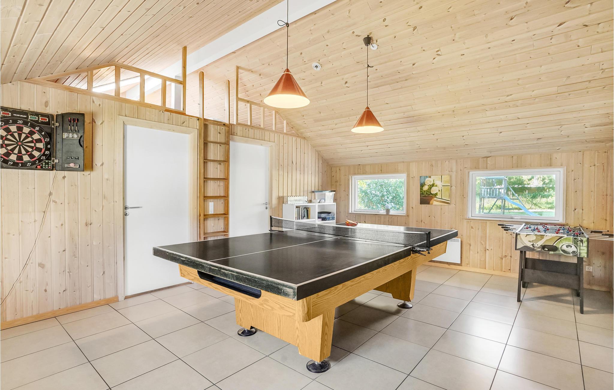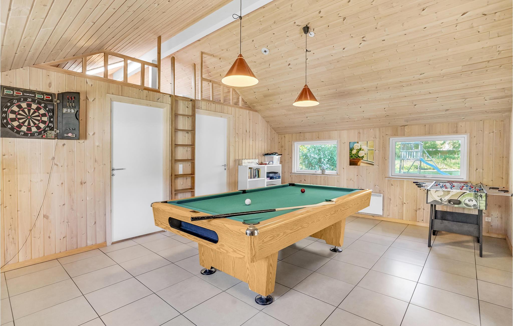 Husets rummelige køkken/alrum ligger sammen med opholdsstuen, så feriens skiftende kokke sagtens kan være med i samtalerne i stuen. Hyg jer i sofaerne eller rundt om spisebordet, hvor der er plads til, at alle kan sidde og spise sammen. Her findes desuden 5 soveværelser samt en hems med sovepladser til 2 personer. I aktivitetsrummet kan I spille bordtennis og dart, og måske har nogen lyst til skøn wellness i det store 6 personers spabad eller velgørende varme i saunaen. Det er muligt at leje linned.