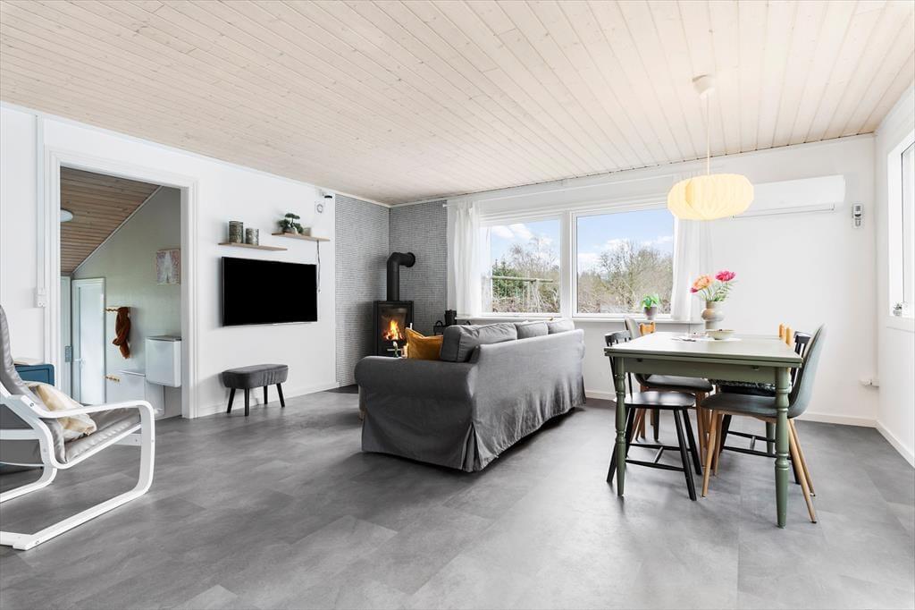Sommerhuset er indrettet i en lys og venlig stil, der indbyder til ren afslapning fra det øjeblik, du træder ind ad døren. I stuen kan du samles med dine kære i sofaen, hvor brændeovnens knitrende flammer skaber en varm og hyggelig atmosfære. Stuen er i åben forbindelse med køkkenet, så der er rig mulighed for at være sammen, selv når maden bliver tilberedt. Huset har flere gode soveværelser, hvor du kan se frem til en god nats søvn efter en dag fyldt med oplevelser i det smukke landskab. Badeværelset er pænt og funktionelt, og overalt i huset føles der rart og hjemligt.