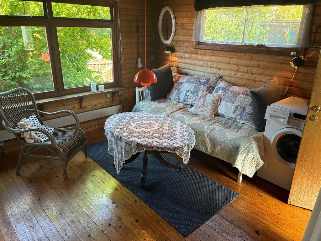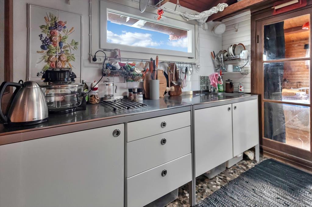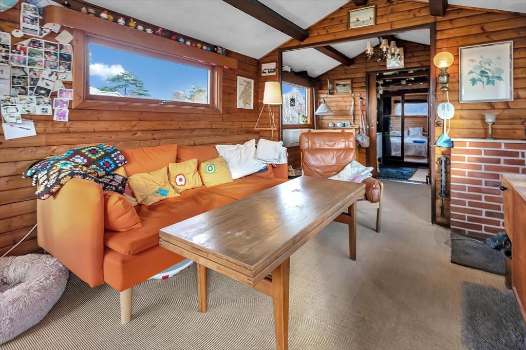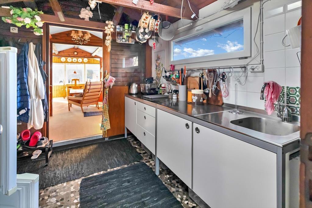 Du træder direkte ind i husets spise- og opholdsrum hvor stemningen er den oprindelige arkitektur med hyggelige ting på væggene. Der er indgang til et af husets soveværelser fra stuen. Går du videre ind i huset kommer du til køkkenet hvor der hænger udsmykning fra loftet, som man havde i gamle dage. Fra køkkenet er der udgang til overdækket terrasse med spiseplads. Videre ind kommer du til ekstra opholdsstue og alkove samt husets toilet/håndbruserbad.