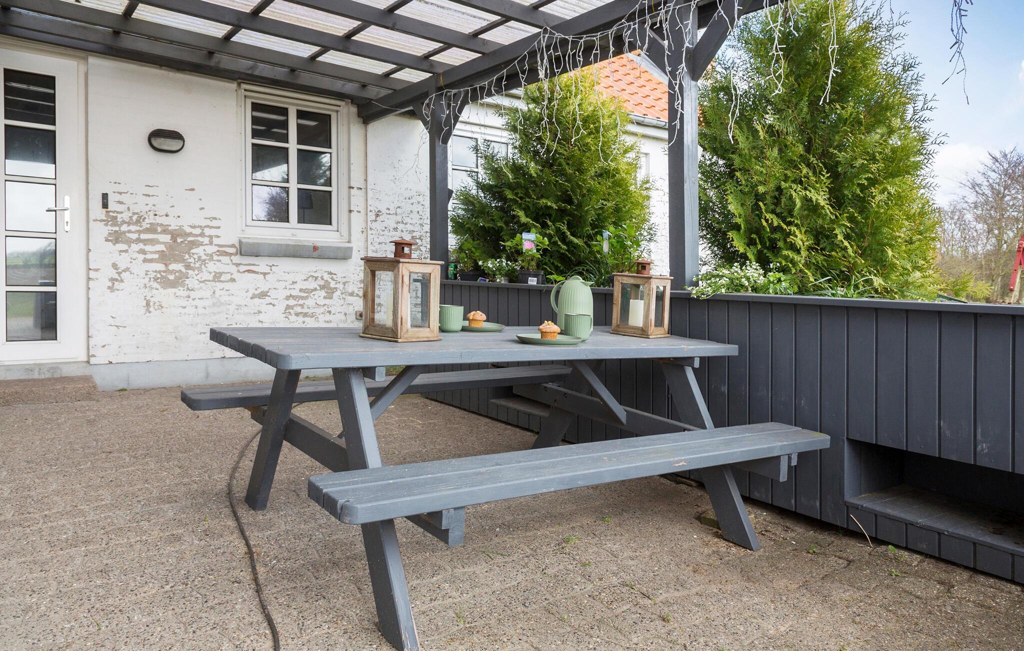 Huset ligger på en stor og ugeneret grund, så der er rig mulighed for at nyde solen, når den titter frem. Her er legeredskaber til børnene og gode havemøbler, hvor de voksne kan tage den lidt med ro med en god bog eller et krydsord i solen.