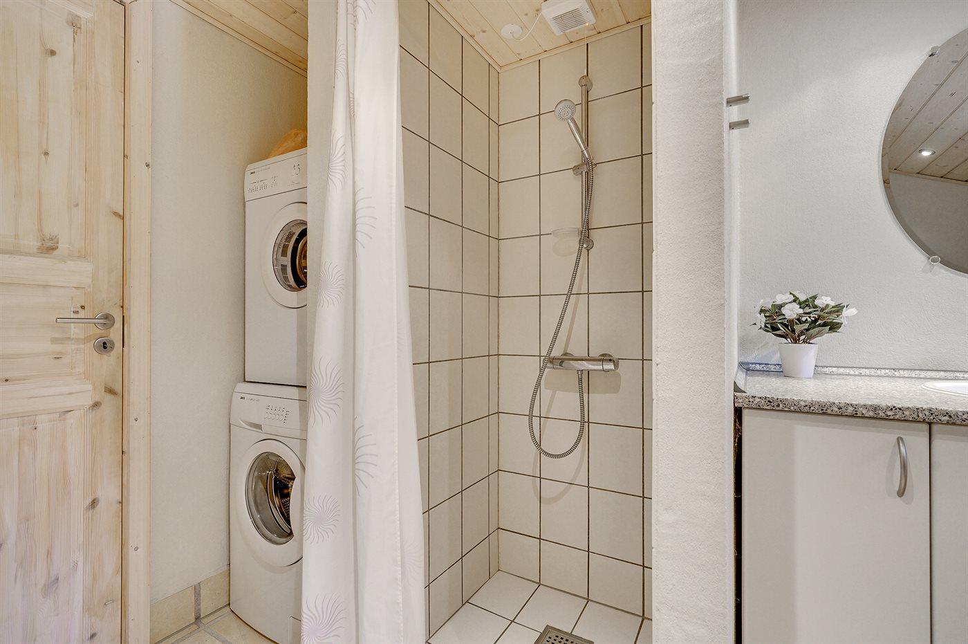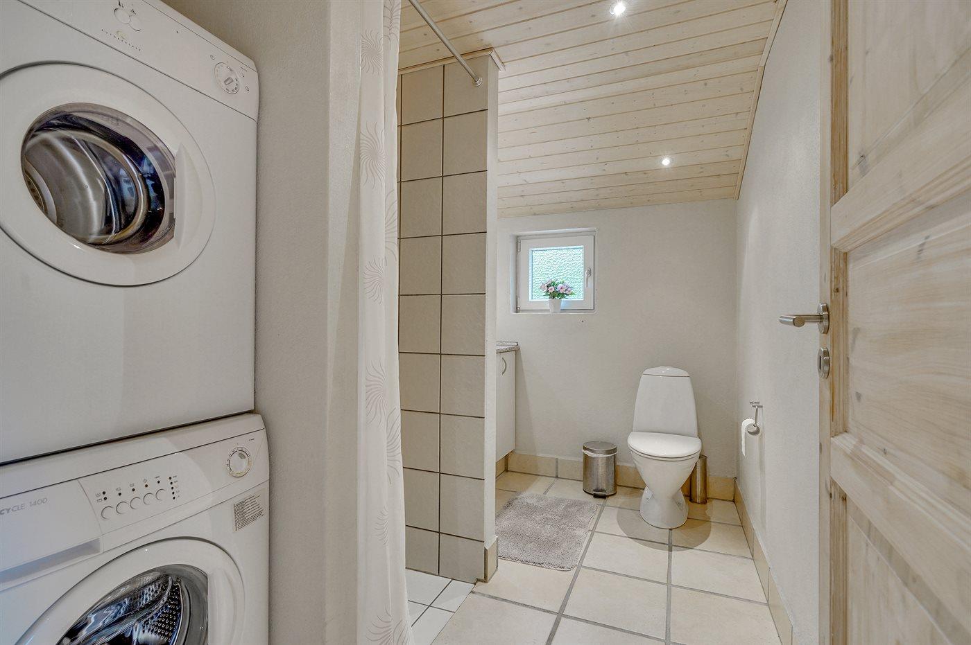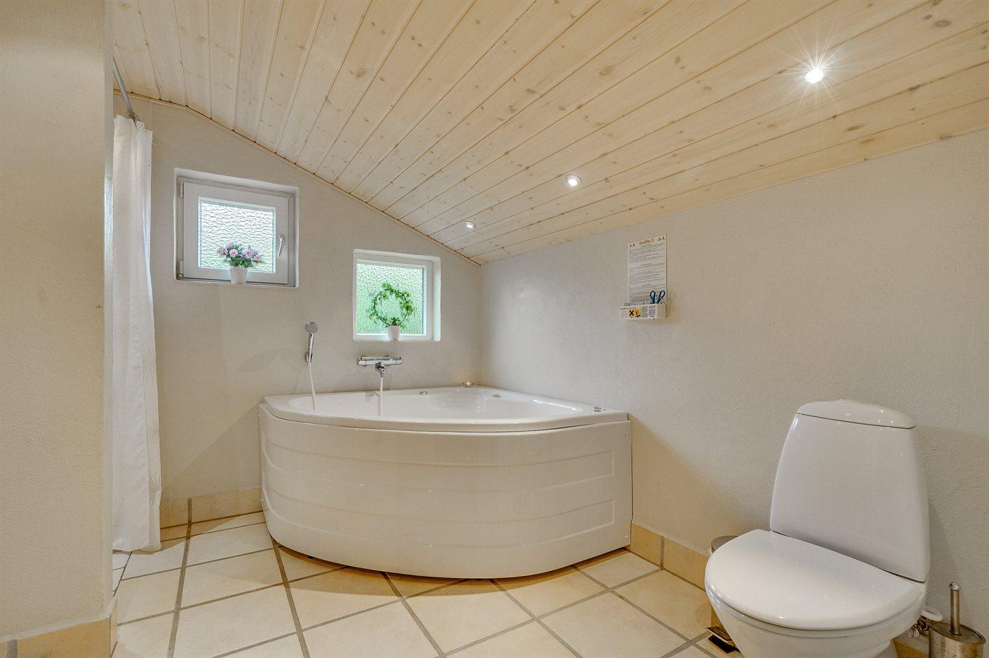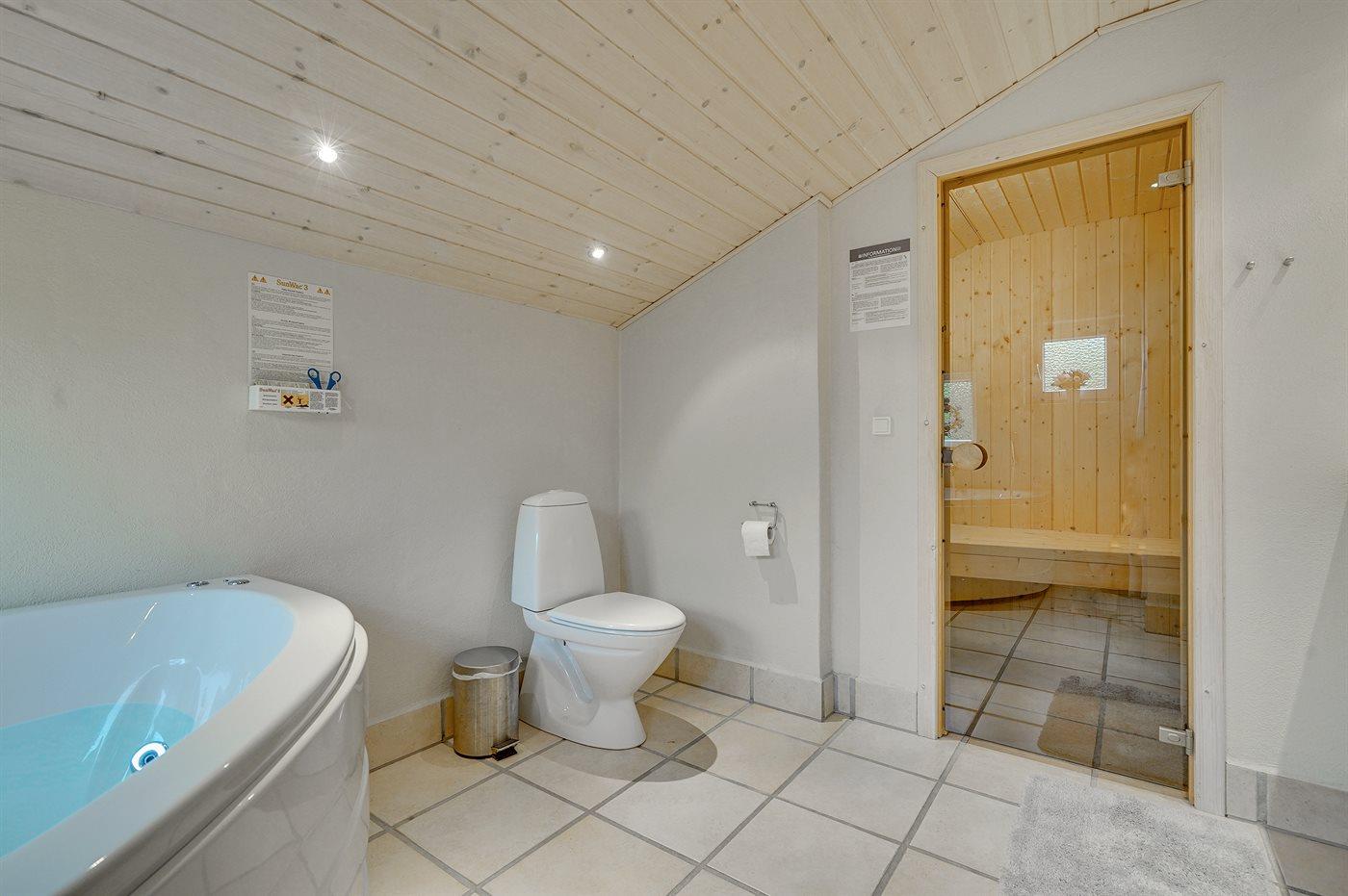 Der er 2 badeværelser med bruseniche og 2 toiletter. Der er gulvvarme på 1 badeværelse. I saunaen er der mulighed for afslapning.