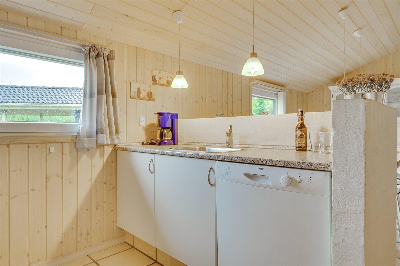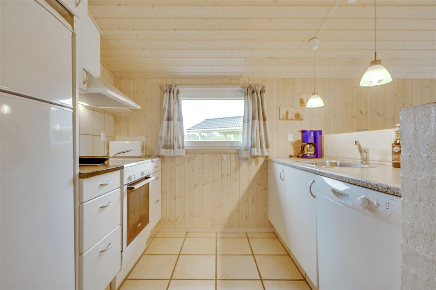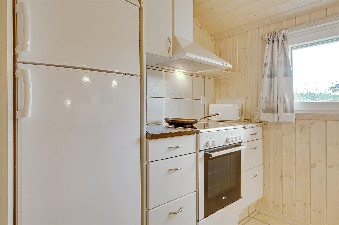 Køkkenet er udstyret med 1 køleskab. Der er 4 keramiske kogeplader, varmluftovn, mikrobølgeovn samt opvaskemaskine.