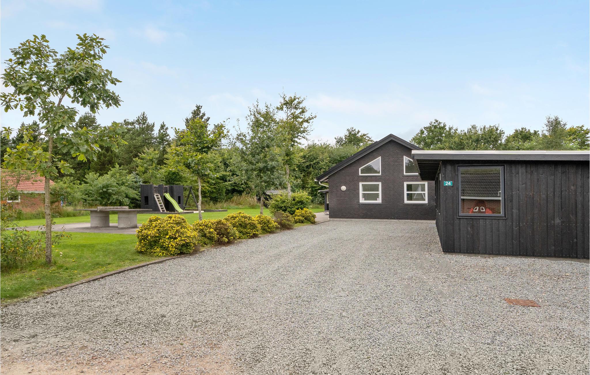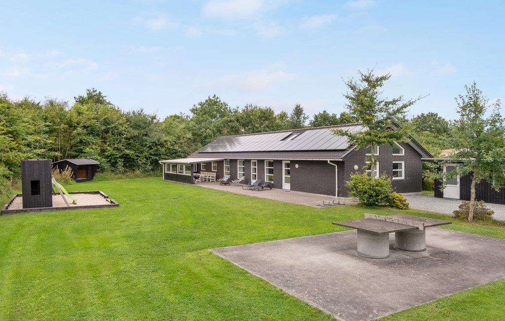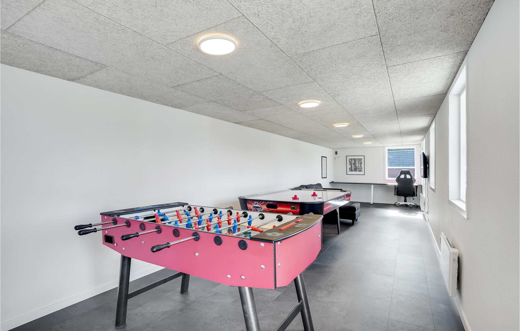 Feriehuset er praktisk indrettet med et større køkken/alrum med klinkegulv og gulvvarme samt udgang til en stor terrasse med et overdækket grillområde. Huset er opført i gode kvalitetsmaterialer og opvarmes med jordvarme. Der er et aktivitetsrum på 40 m2, med it arbejdsplads, internet, sofa, airhockey, ekstra TV samt bordfodboldbord, så der er mulighed for både underholdning og hjemmearbejde under jeres ophold. På grunden er der shelter, bålfad, legeborg med rutchebane, udendørs bordtennis og trampolin.