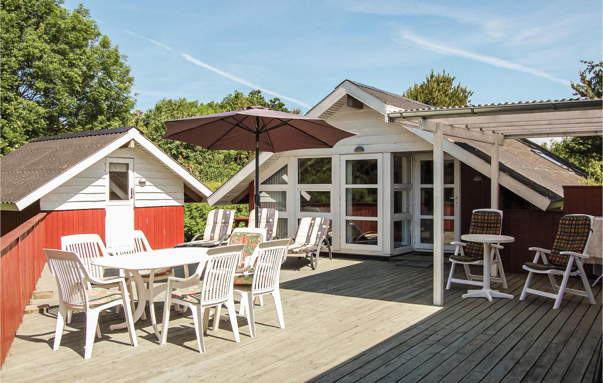Hyggeligt og veludstyret sommerhus nær aktivitetscenter i Jegum Ferieland med flere terrasser og smuk natur omkring.