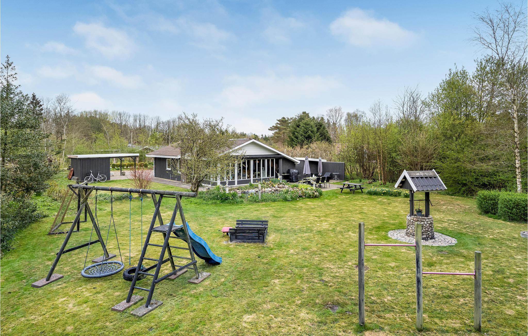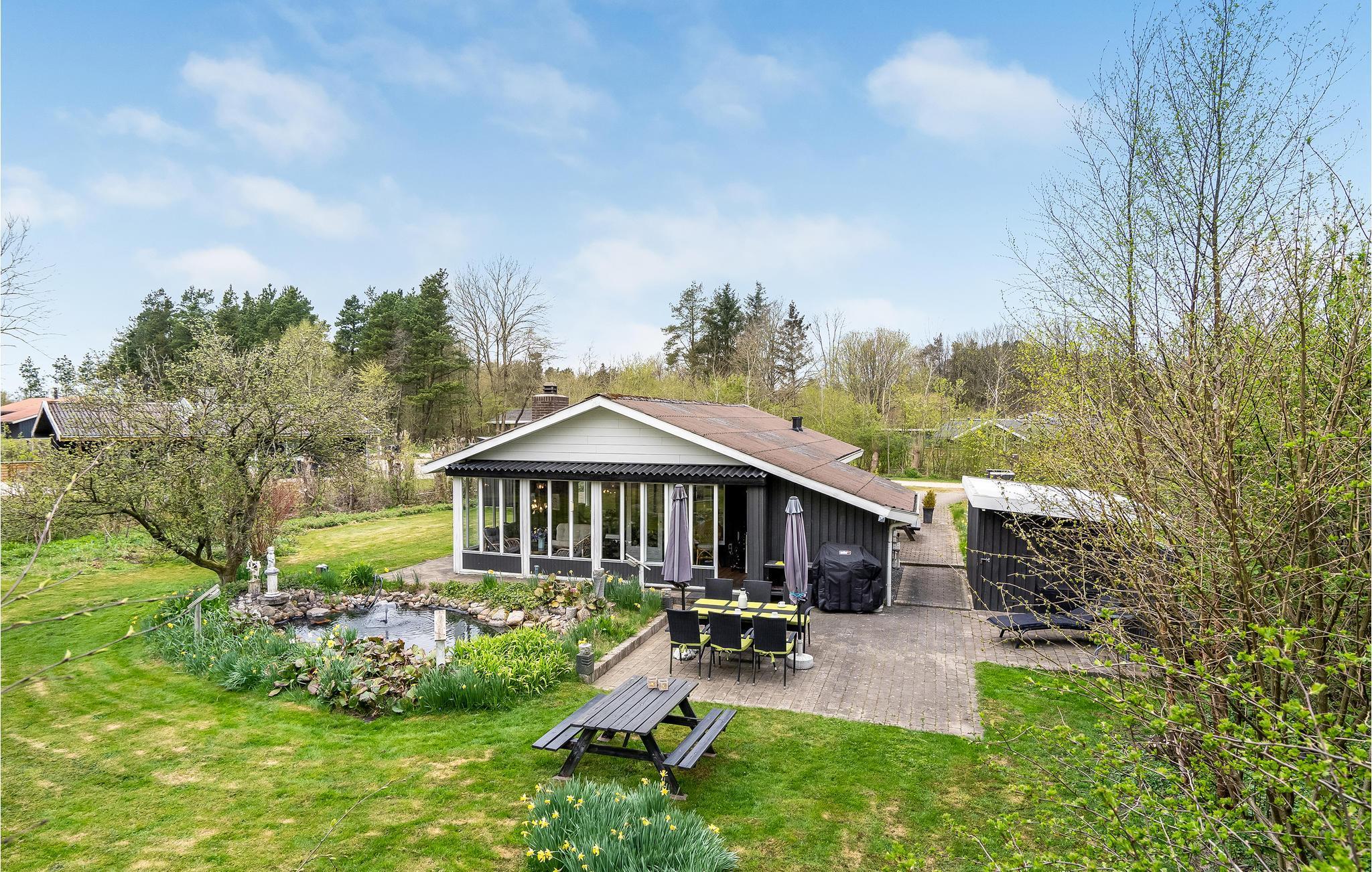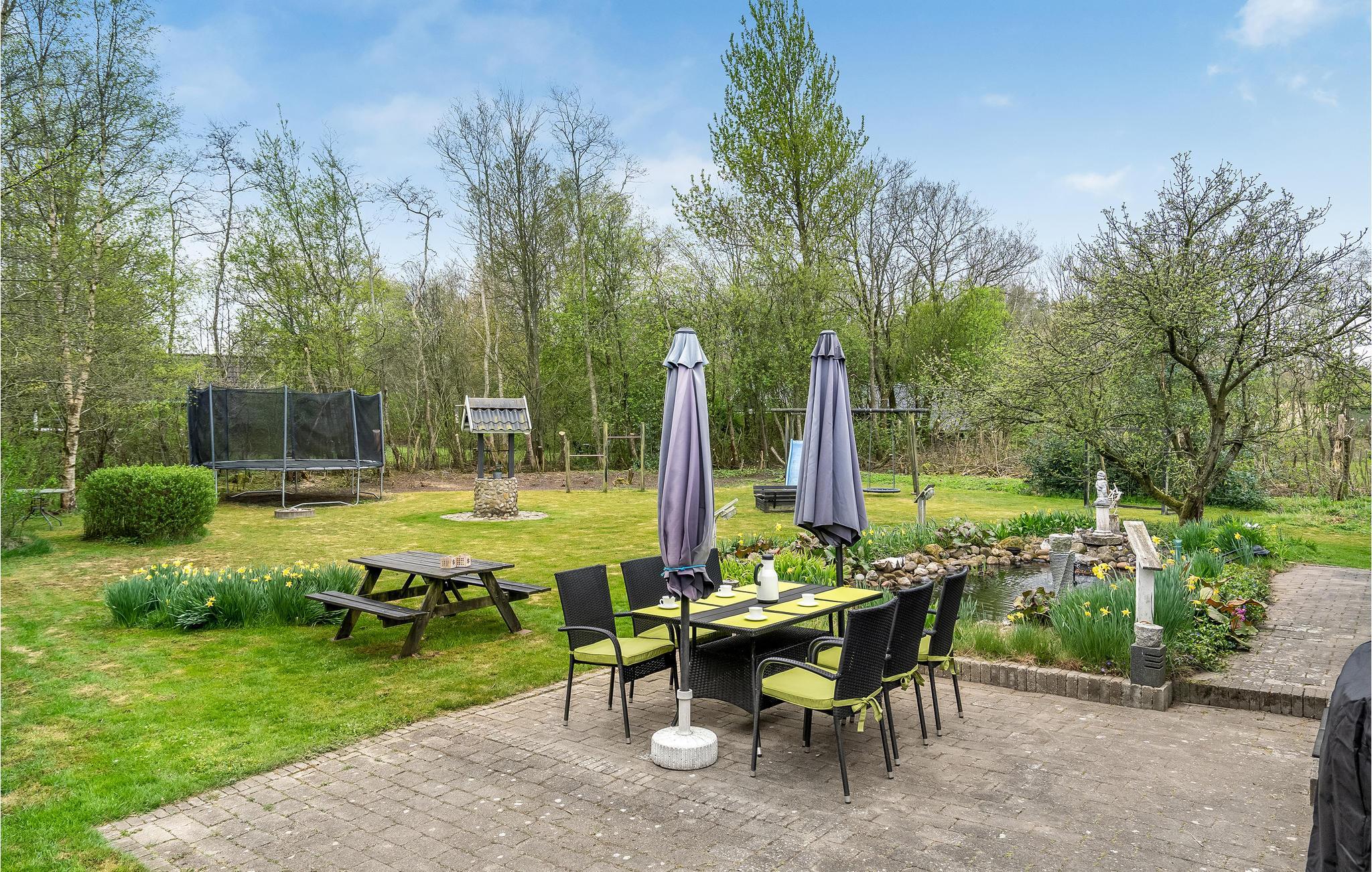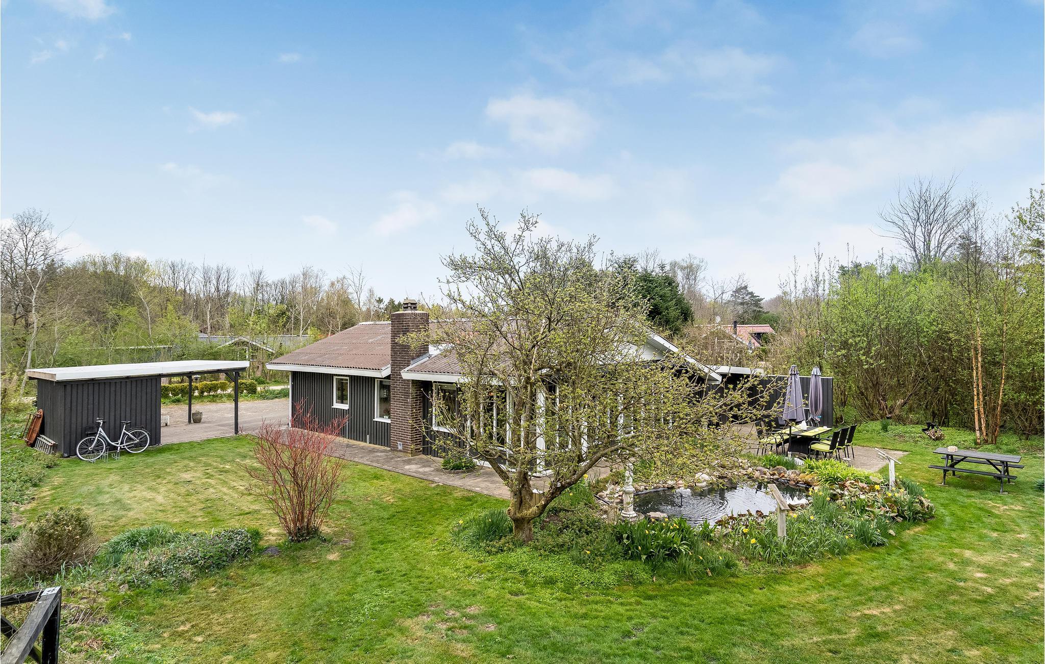 Udenfor har I en stor, åben fliseterrasse til rådighed, hvor I kan sidde og spise, sole jer og holde hyggelige grillaftener. Den idylliske have er i en klasse for sig. Her finder I et væld af underholdningsmuligheder for både børn og voksne - herunder trampolin, gynge, sandkasse, fodboldmål og diverse udendørsspil- og legetøj - og en hyggelig bålplads, hvis I skulle have lyst til at lave snobrød eller riste skumfiduser. Haven har endda sin helt egen lille dam, som I fra terrassen kan nyde udsigten til- og lyden af vandets klukken fra.