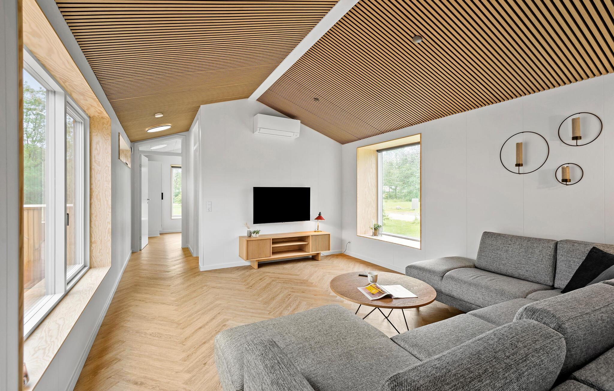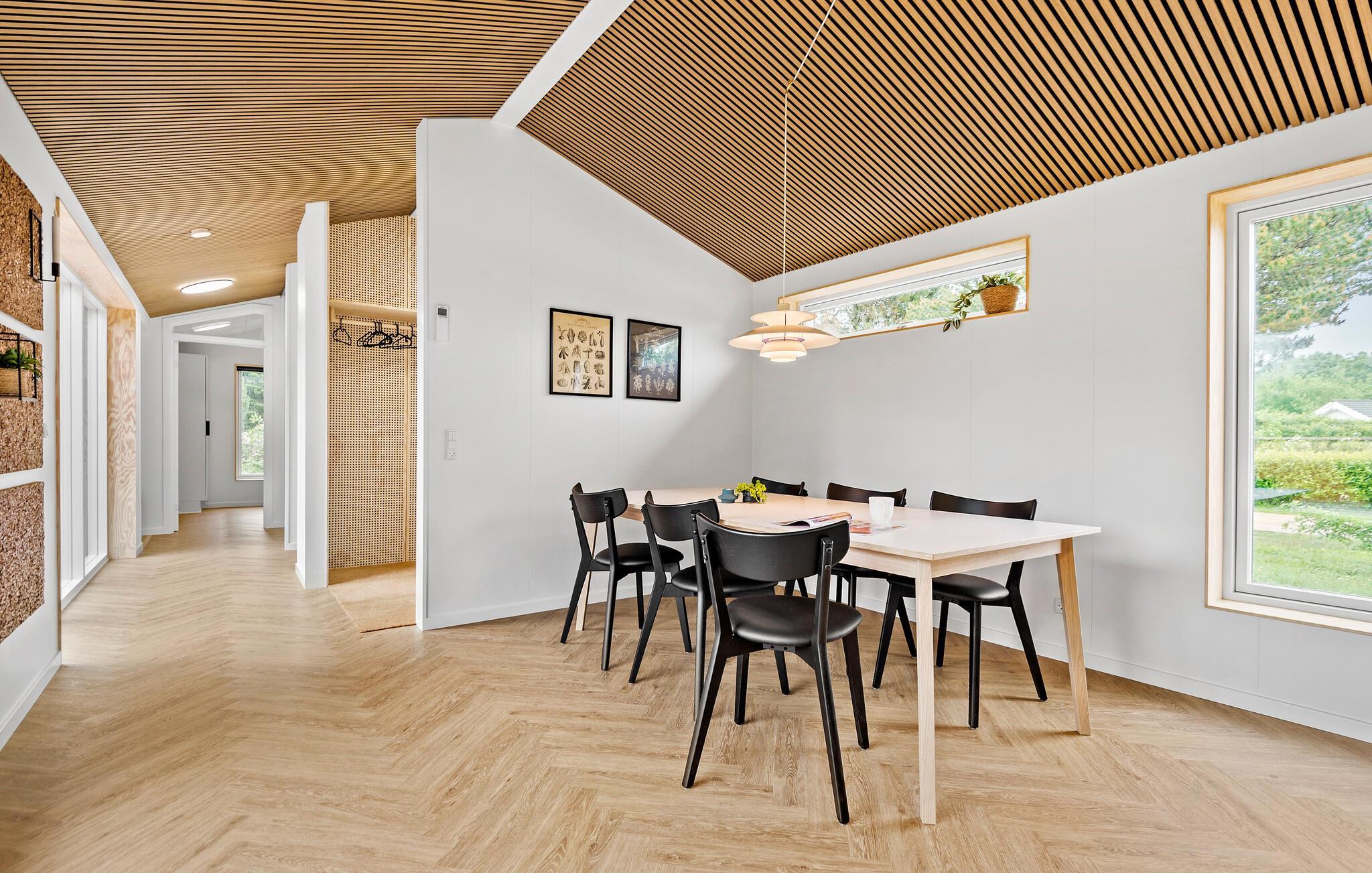 Moderne træhus i Jegum Ferieland med stilfuld indretning og dejlig terrasse i naturskønne omgivelser.
