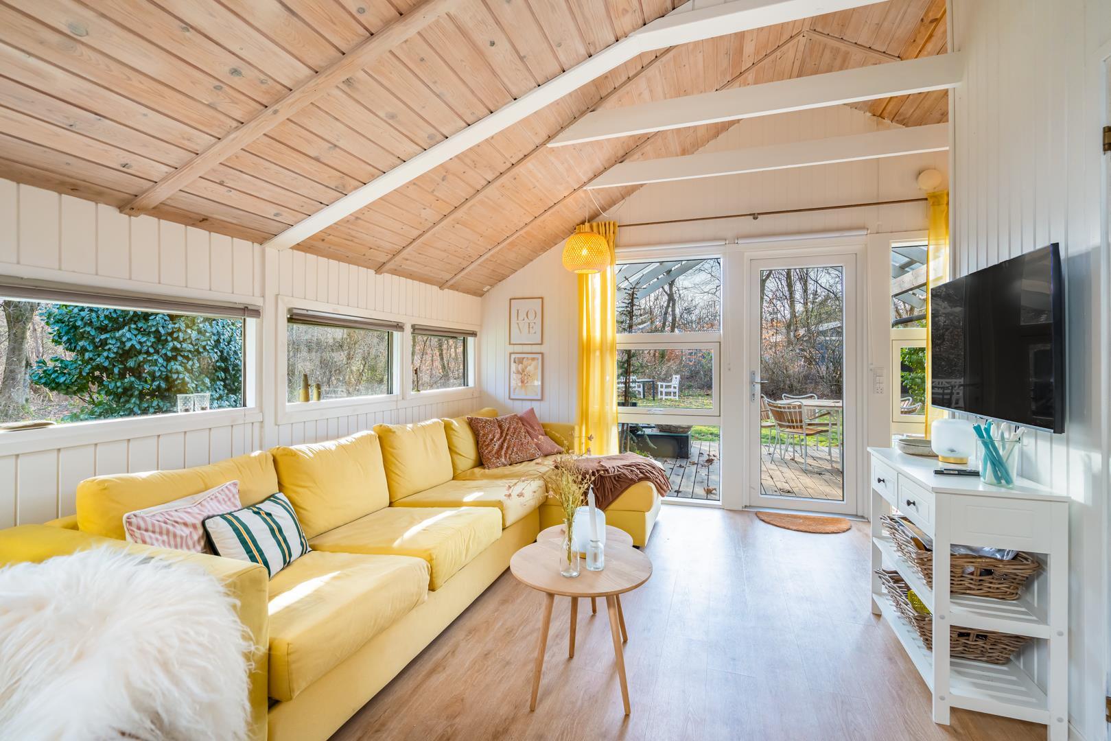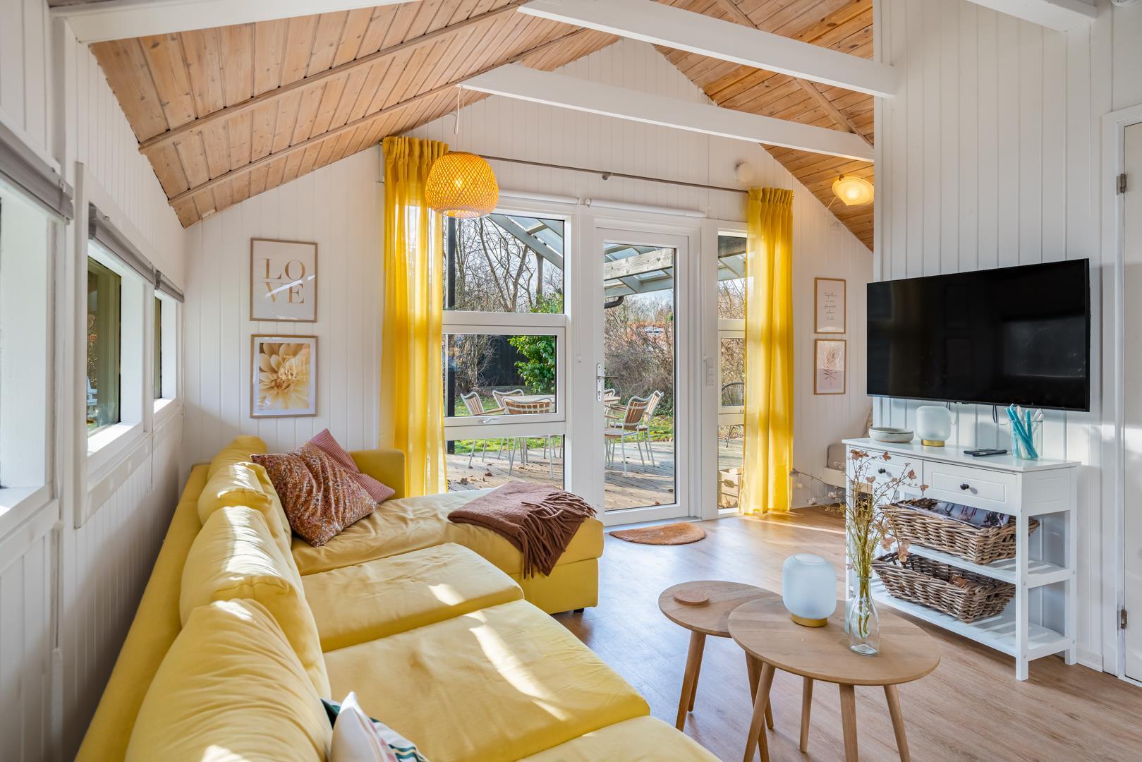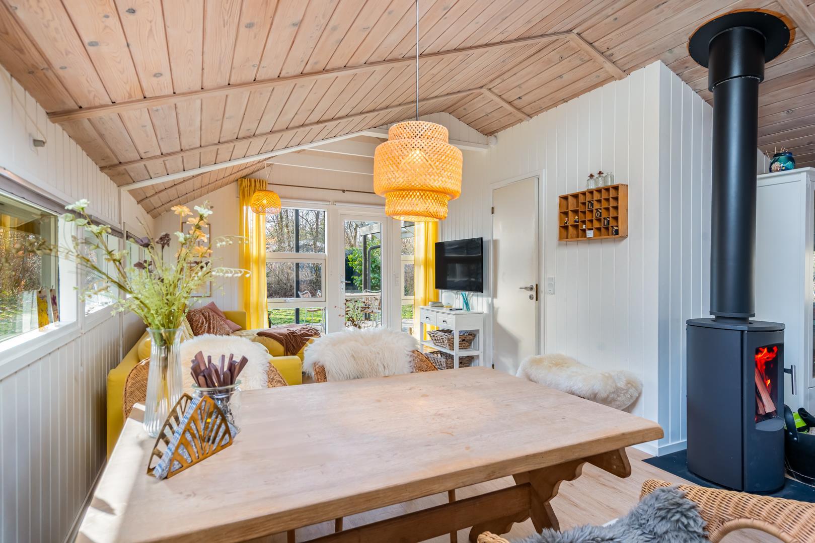 Det lyse og indbydende opholdsrum er sommerhusets naturlige samlingspunkt. Store vinduer giver et dejligt lysindfald, og på kølige dage spreder brændeovnen varme og hyggestemning. Her kan I nyde en god bog, et glas vin foran ilden eller en sjov spilleaften sammen.