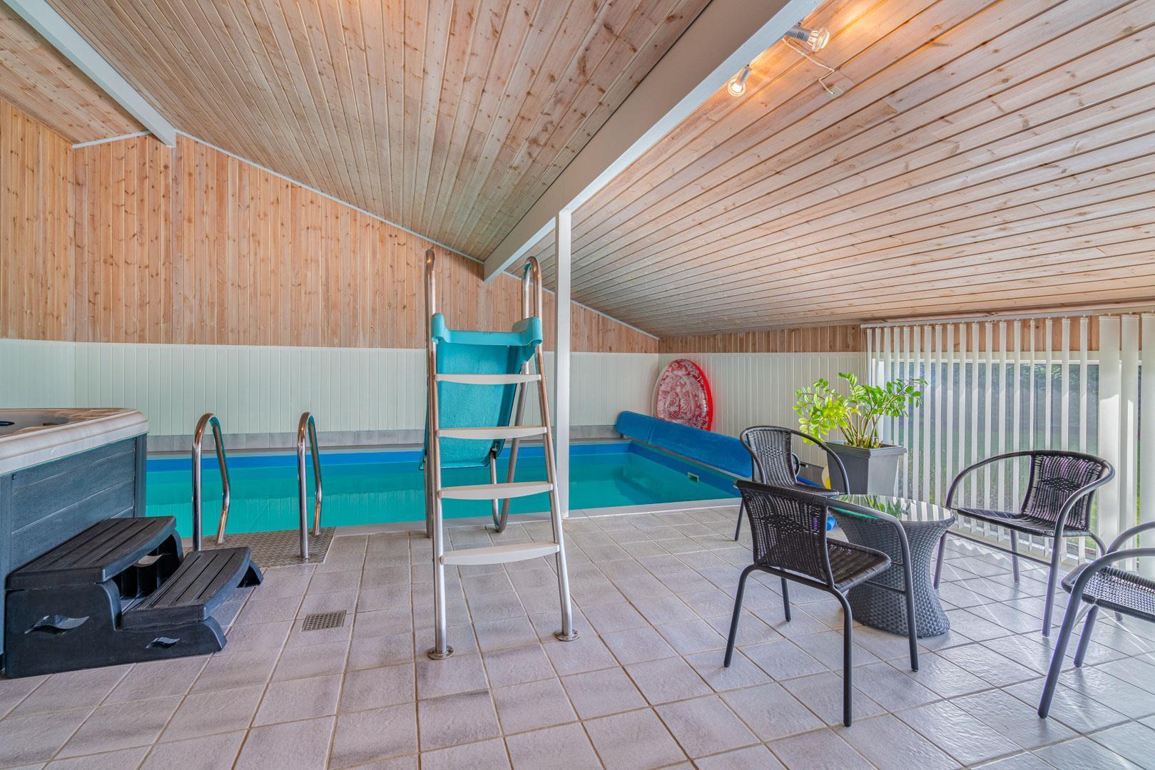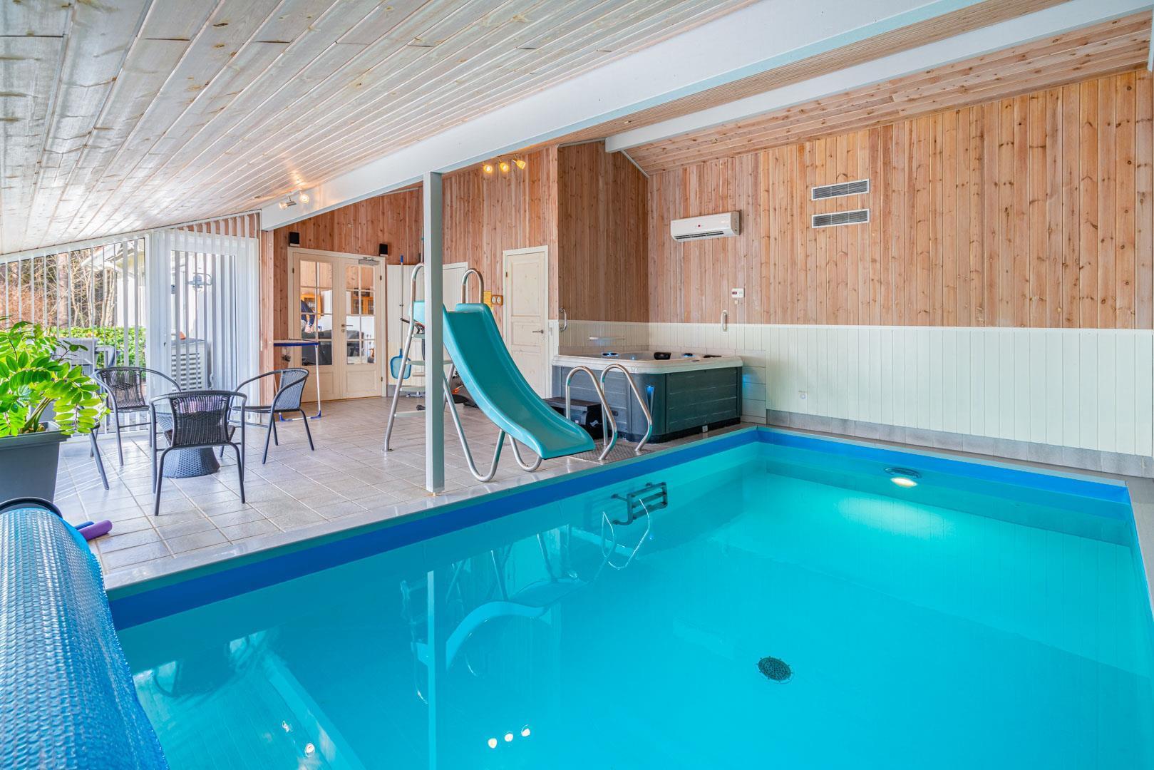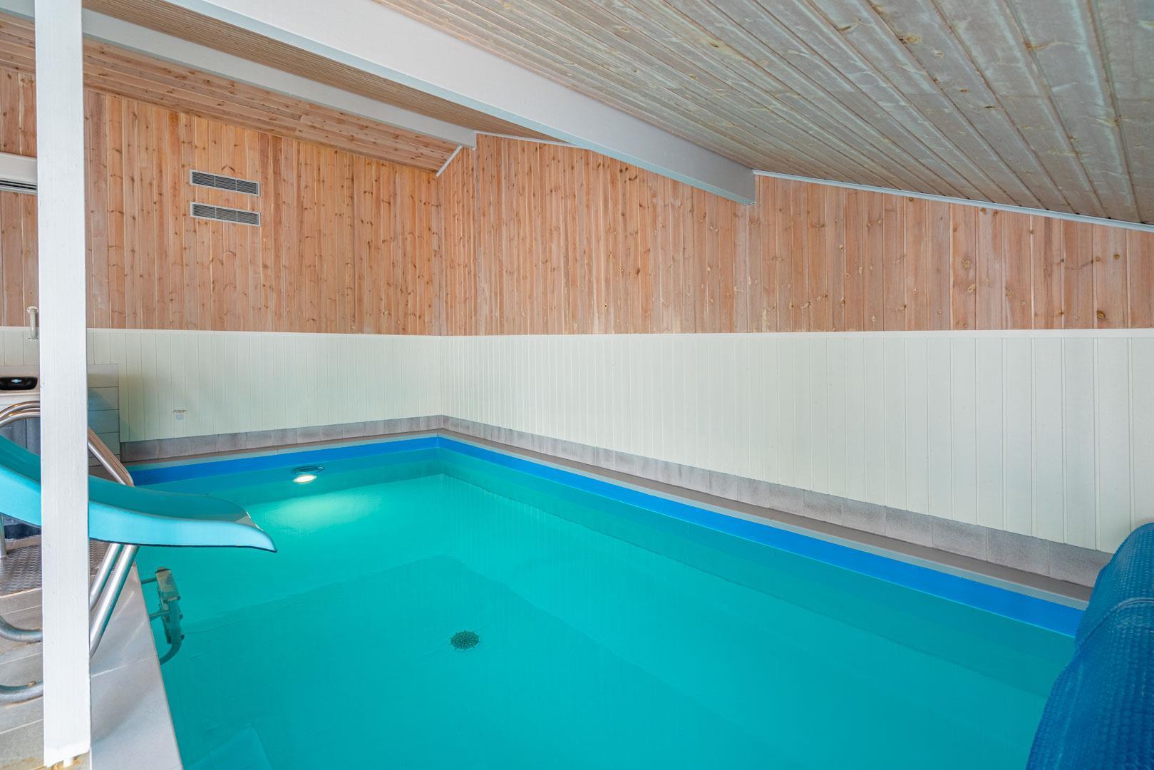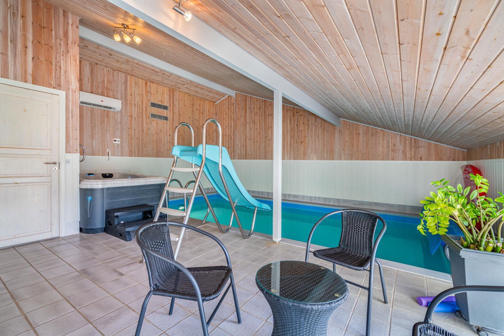 Det behageligt opvarmede poolrum kan med stor fornøjelse benyttes af hele familien. Rutchebanen ved poolen er et hit for børnene, mens standvand-spabadet, med boble– og luft/vandmassage, nok mere tiltrækker de voksne. Efter badet kan I slappe af i møblerne, mens I hører musik på enten radioen eller cd-afspilleren. Sæt jer i saunaen og bliv varmet godt igennem efter en lang dag udenfor. Cykler forefindes.