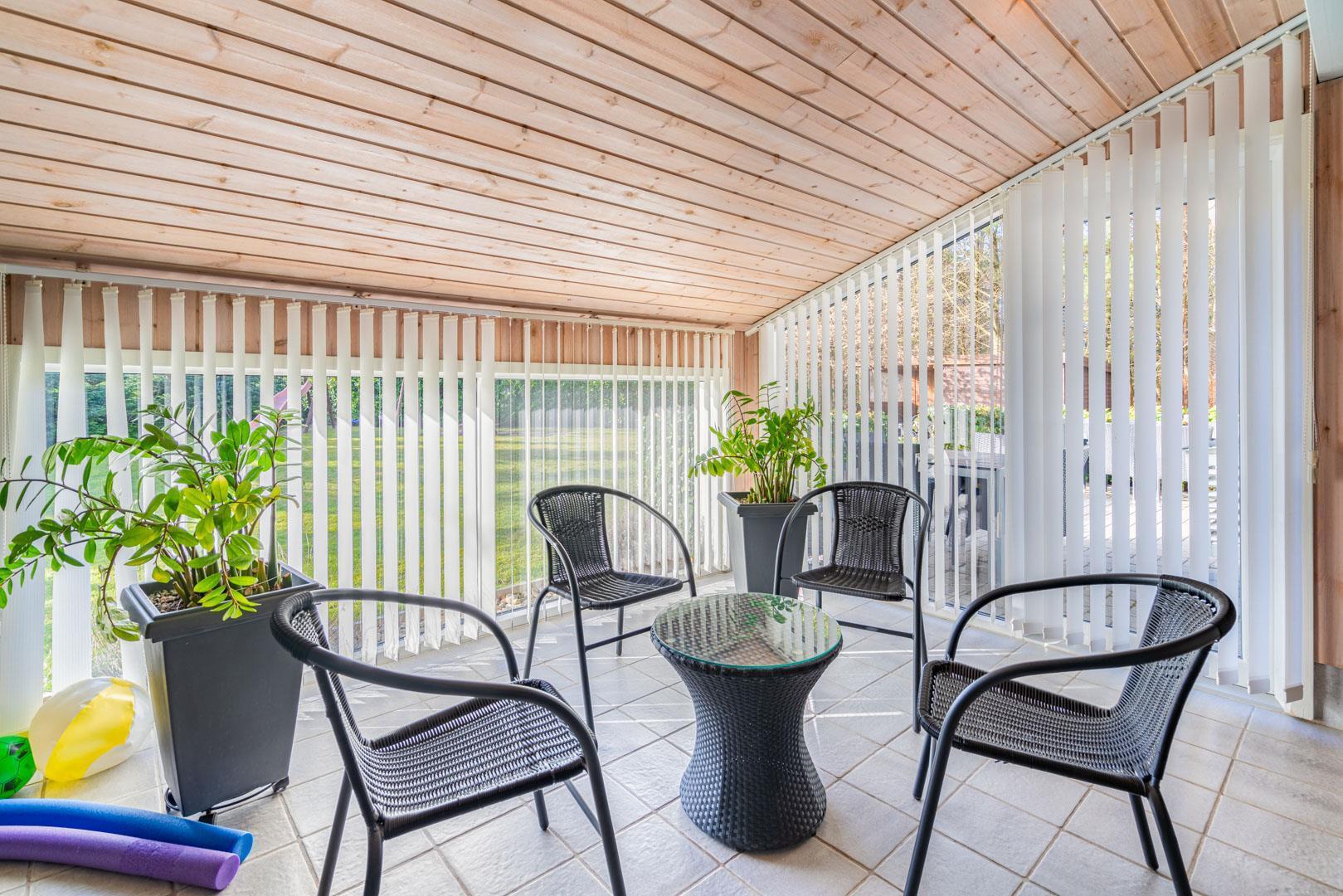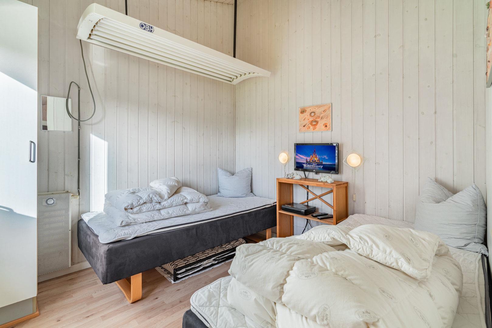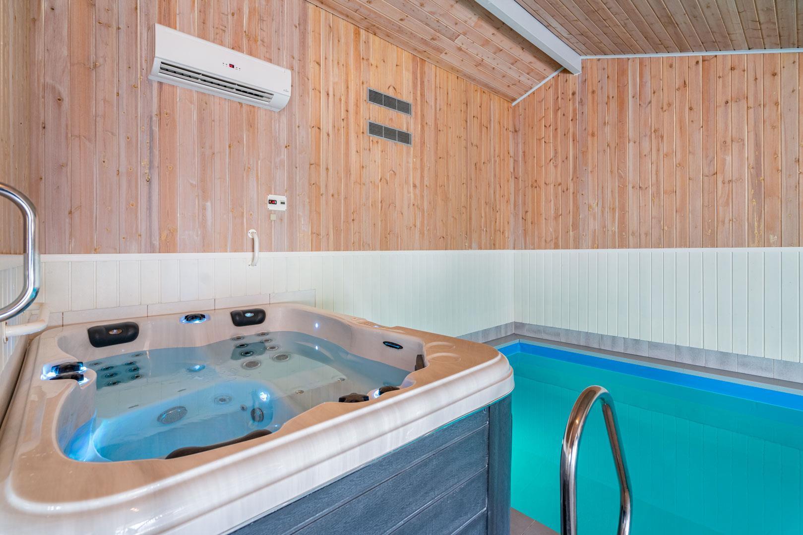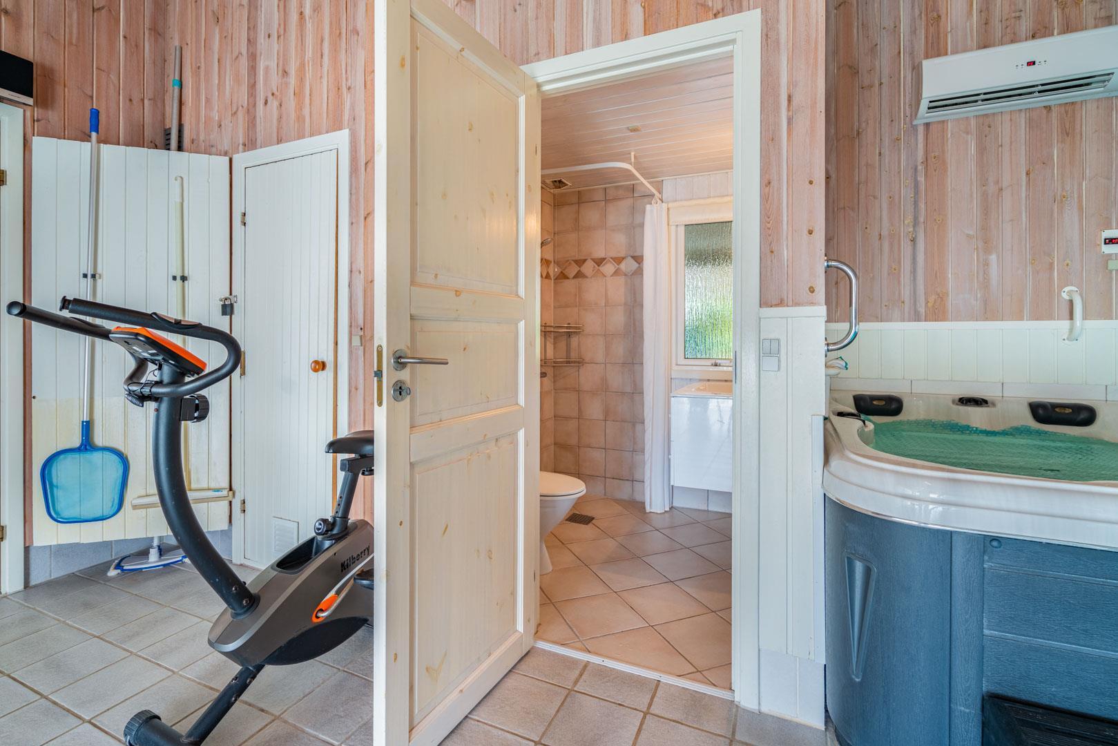 Det behageligt opvarmede poolrum kan med stor fornøjelse benyttes af hele familien. Rutchebanen ved poolen er et hit for børnene, mens standvand-spabadet, med boble– og luft/vandmassage, nok mere tiltrækker de voksne. Efter badet kan I slappe af i møblerne, mens I hører musik på enten radioen eller cd-afspilleren. Sæt jer i saunaen og bliv varmet godt igennem efter en lang dag udenfor. Cykler forefindes.