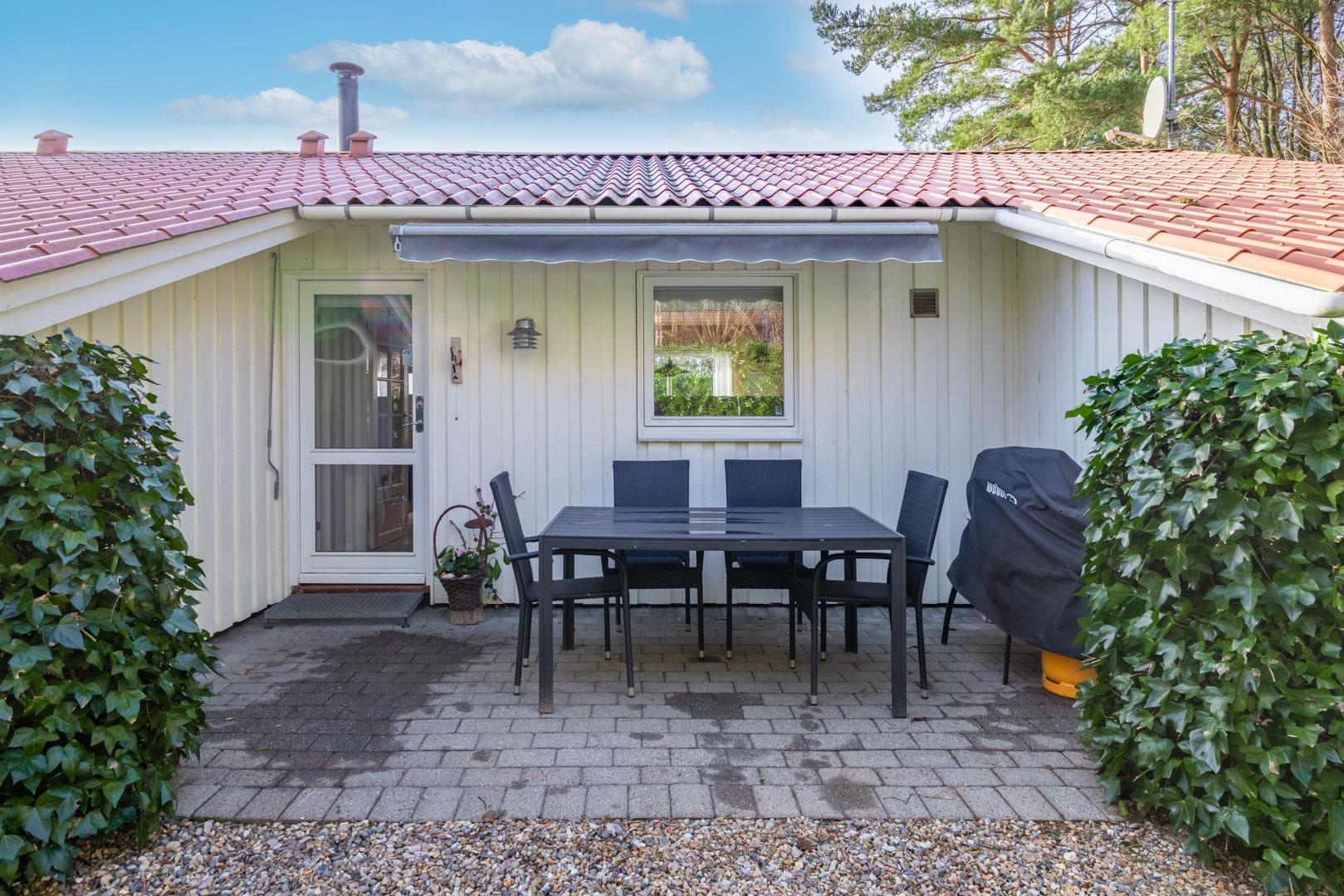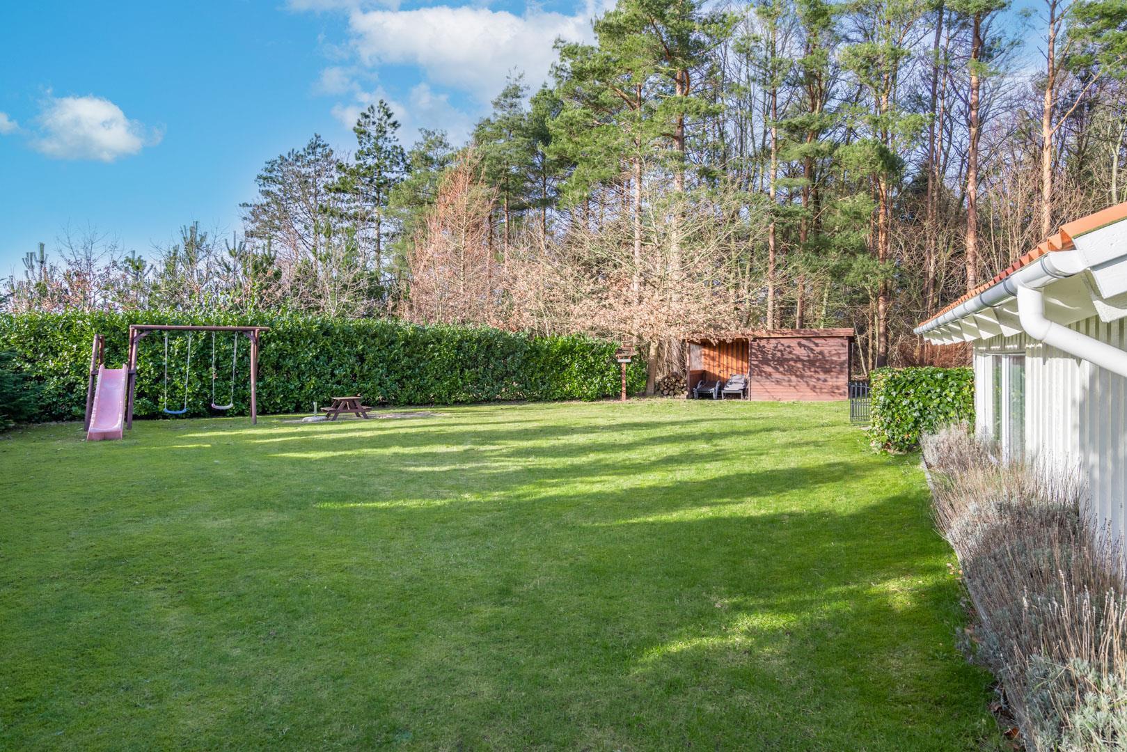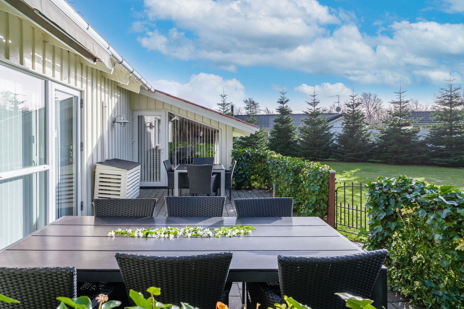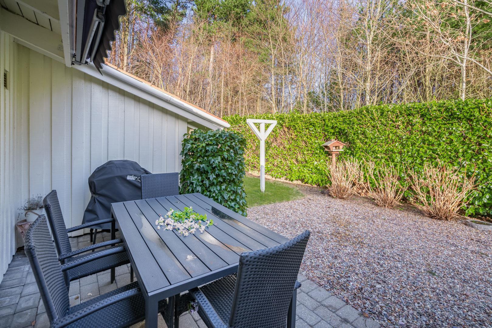 Sommerhuset er beliggende på en fredelig og børnevenlig naturgrund, hvor hele familien kan boltre sig med forskellige aktiviteter. Der er to terrasser. På den ene kan I nyde morgen- og formiddagssolen, og på den anden, eftermiddags- og aftensolen. Her er der havemøbler til 8 personer og mulighed for at grille (gas inkl.) og hygge sig til langt ud på aftenen.