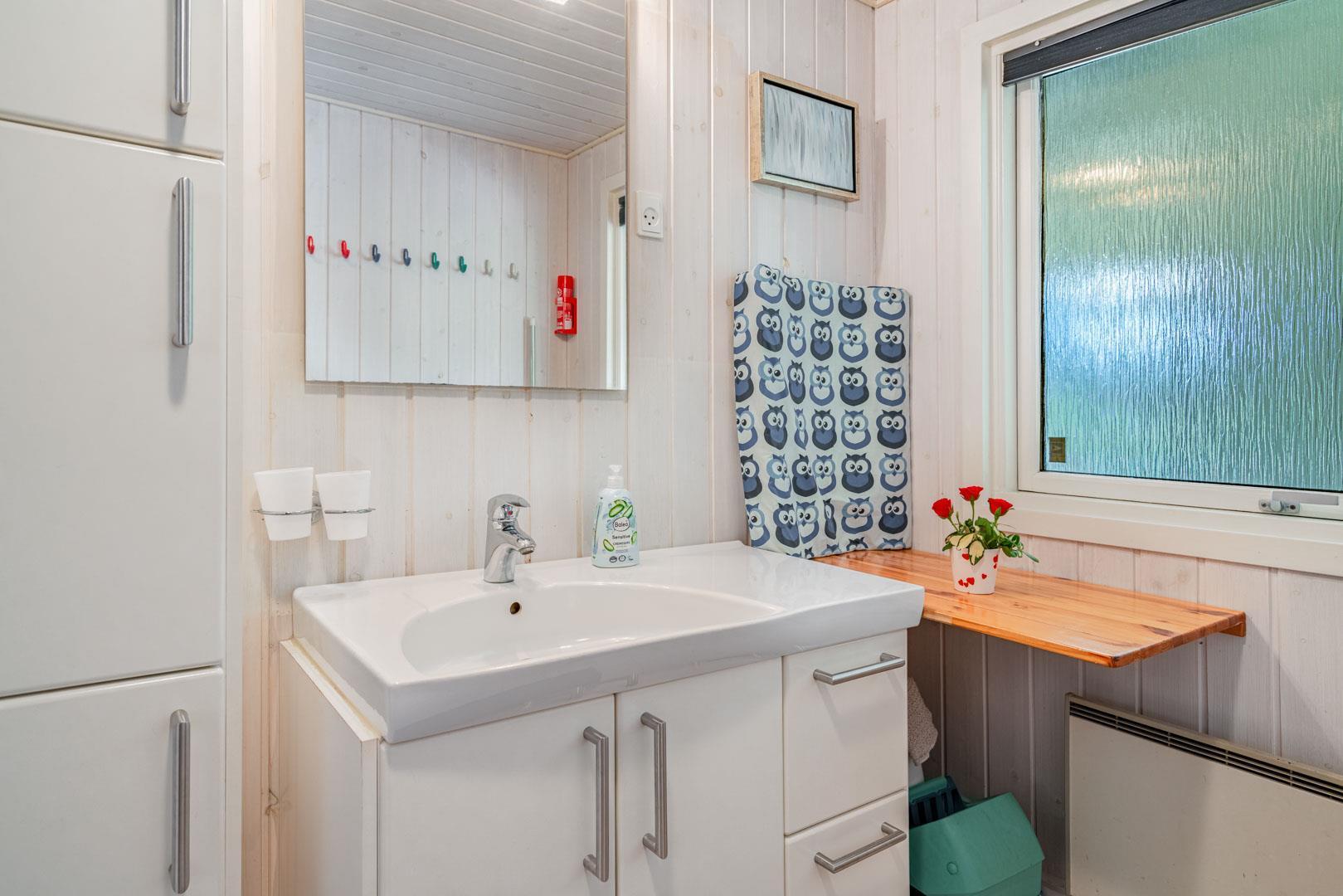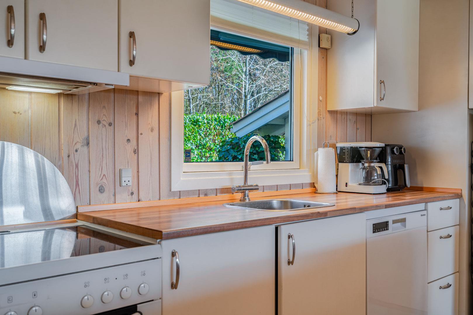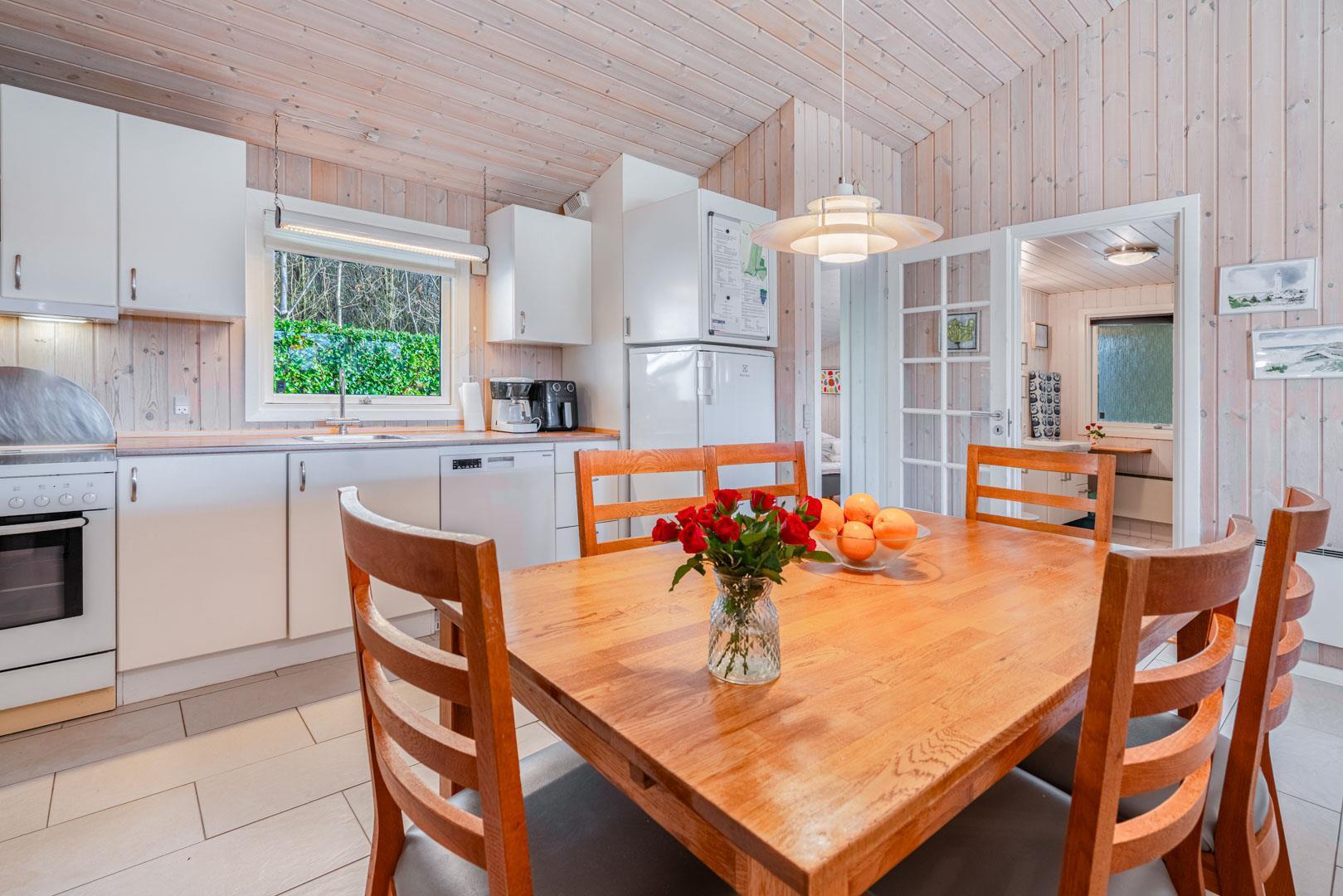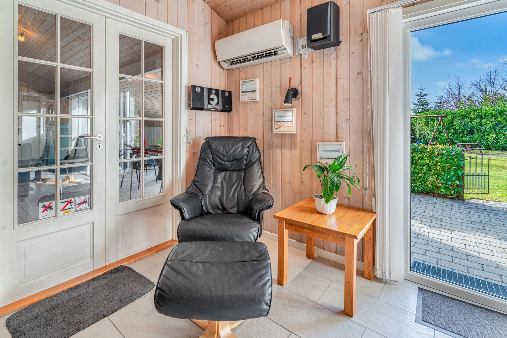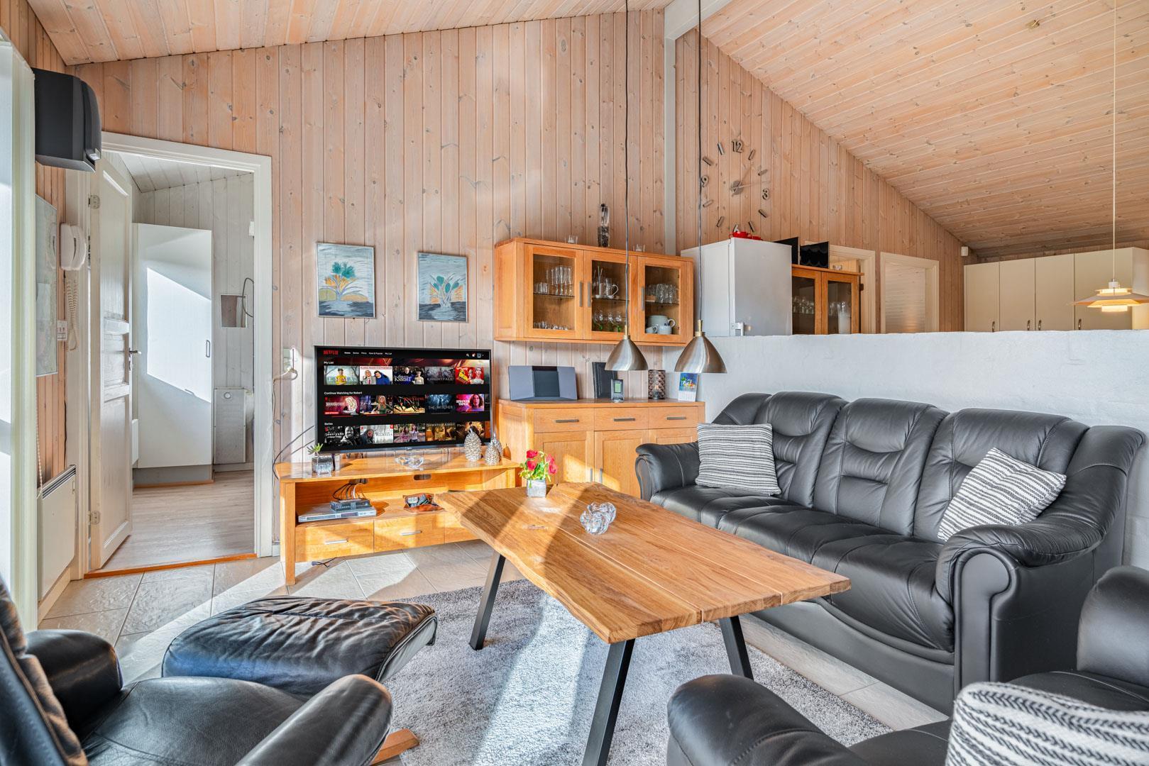 Huset er indrettet med lædermøbler og praktiske spisestuemøbler. Der er især hyggeligt i stuen, når I på lidt kølige tidspunkter tænder op i brændeovnen og samles med forskellige familiespil eller ser tv. Derudover er der også danske, svenske og norske radio- og tv kanaler. Opsatvarmepumpe. I huset er der high-speed internet, 100/100 Mbit. Soveværelserne er lyse.