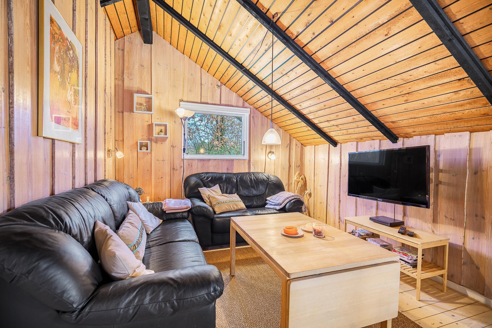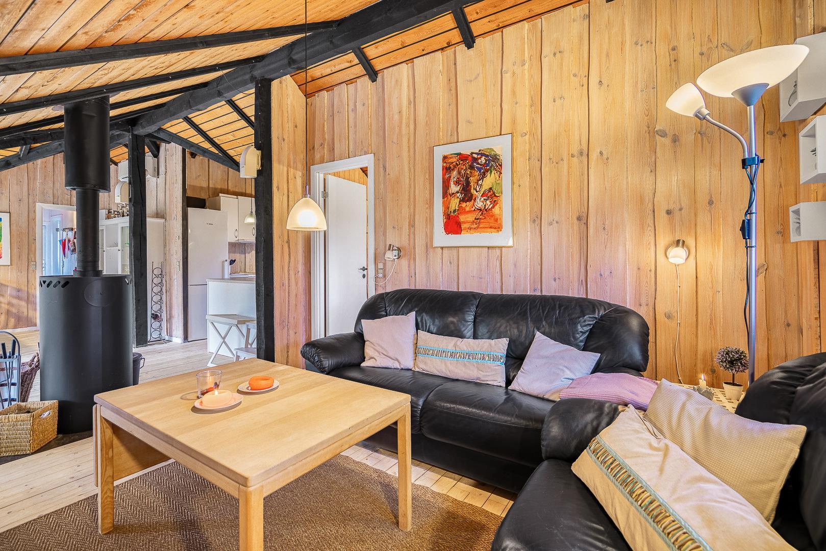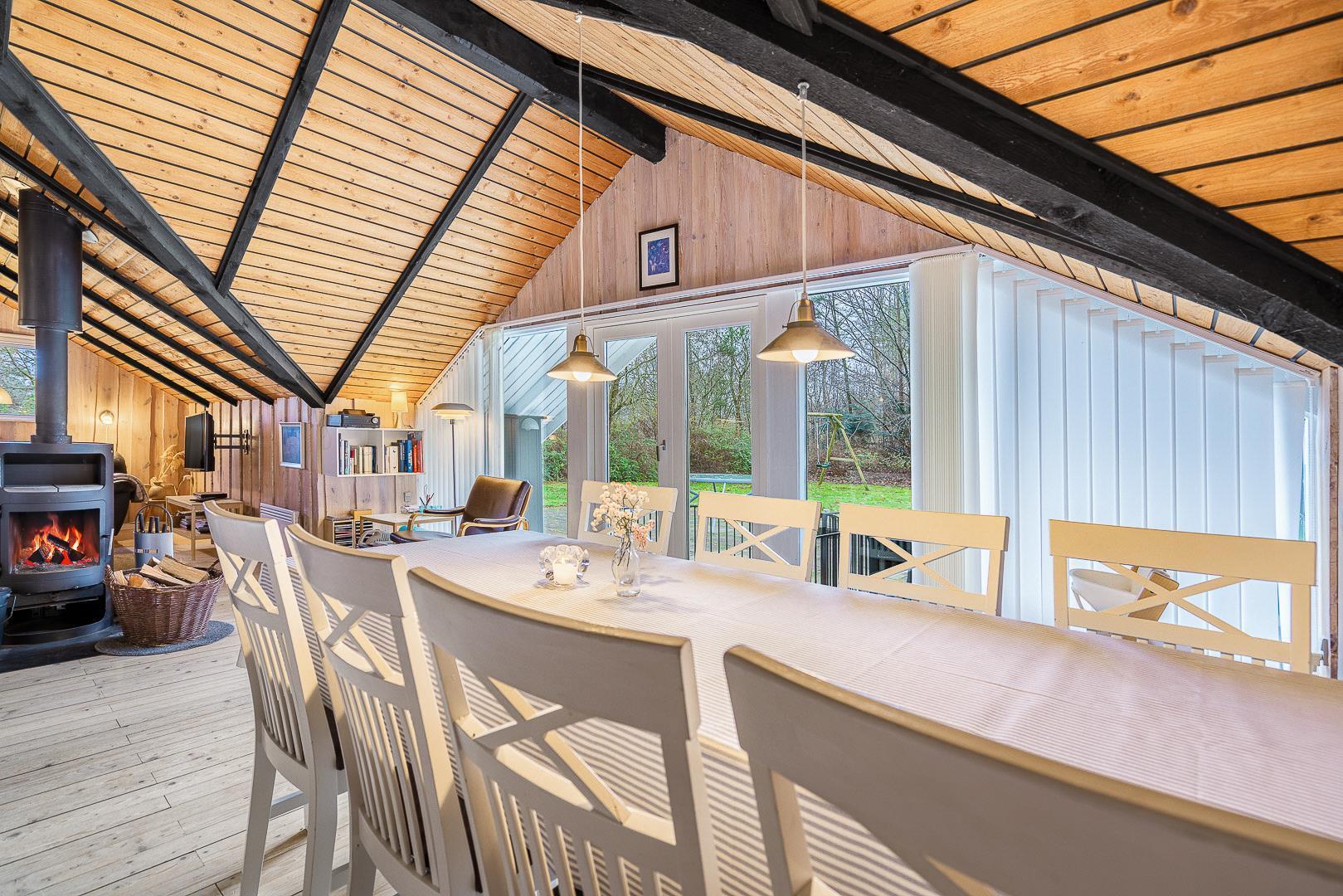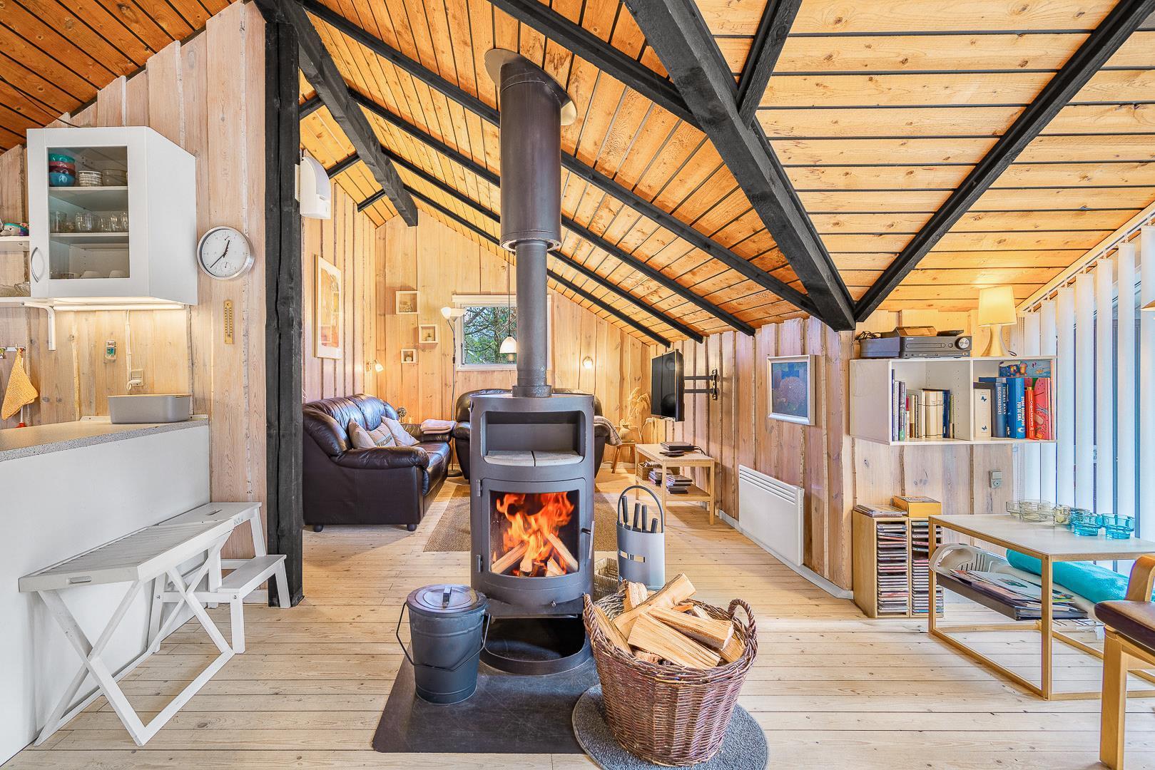 Beliggende for enden af en rolig, grusbelagt vej finder du dette skønne sommerhus på en stor, indhegnet naturgrund – ideelt for hundeejere, der ønsker trygge rammer for deres kæledyr. Sommerhuset byder på en lys og indbydende stue med brændeovn og varmepumpe, der skaber en hyggelig atmosfære året rundt. Stuen er i åben forbindelse med spisestuen og det veludstyrede køkken, og herfra er der direkte udgang til en dejlig terrasse, hvor du kan nyde solen og udsigten over den smukke have.