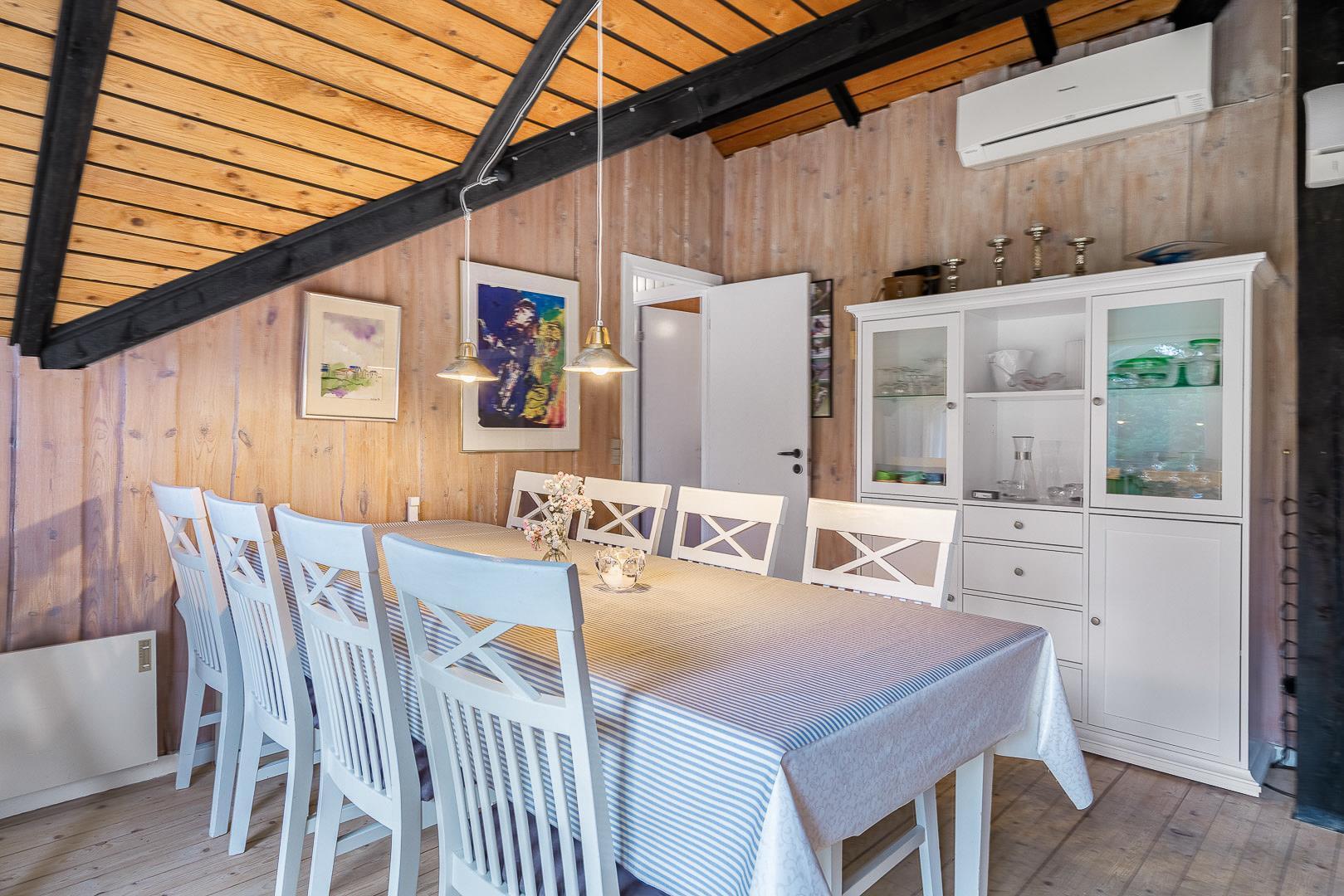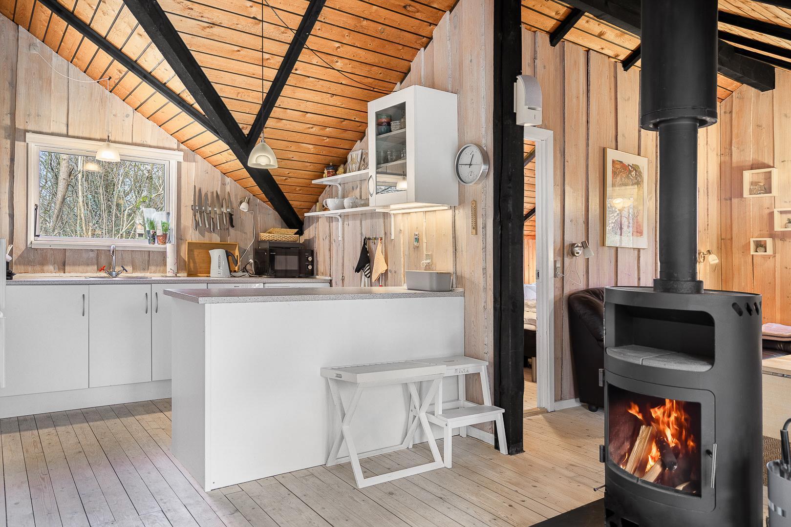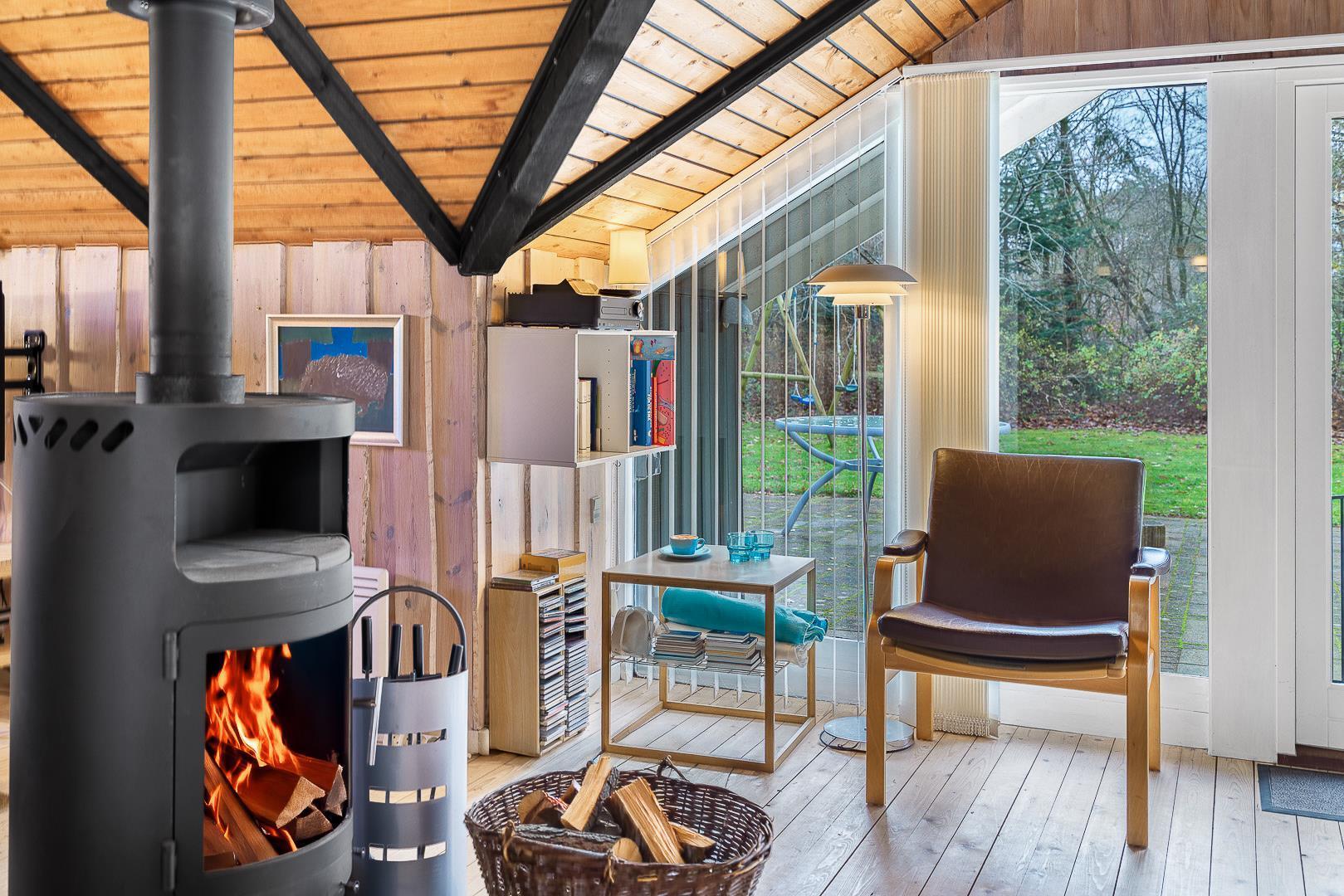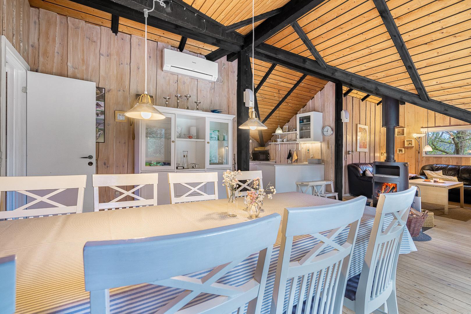 Beliggende for enden af en rolig, grusbelagt vej finder du dette skønne sommerhus på en stor, indhegnet naturgrund – ideelt for hundeejere, der ønsker trygge rammer for deres kæledyr. Sommerhuset byder på en lys og indbydende stue med brændeovn og varmepumpe, der skaber en hyggelig atmosfære året rundt. Stuen er i åben forbindelse med spisestuen og det veludstyrede køkken, og herfra er der direkte udgang til en dejlig terrasse, hvor du kan nyde solen og udsigten over den smukke have.