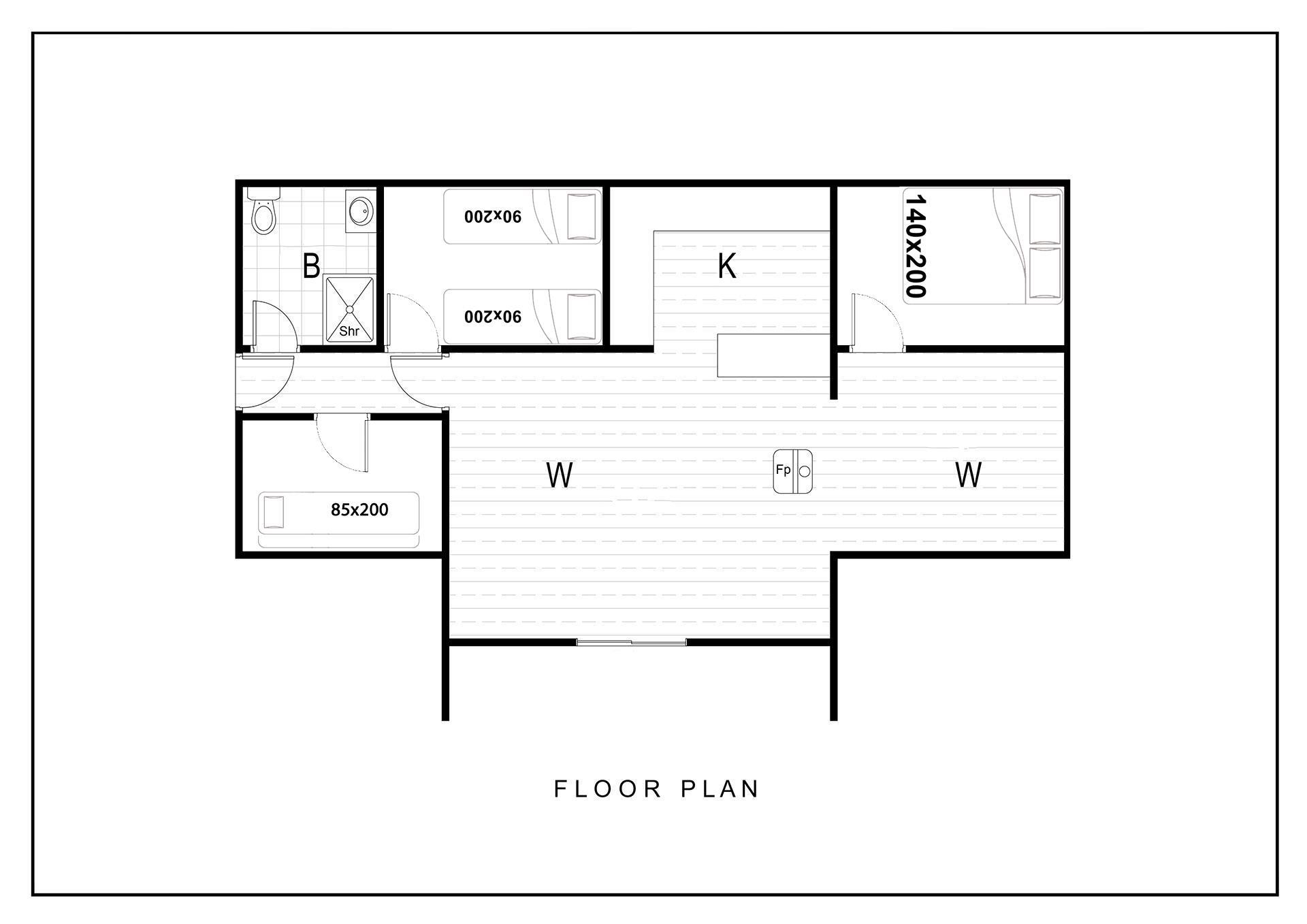 Sengestørrelse: 1 dobbeltseng 140 x 200 cm + 2 enkeltsenge 90 x 200 cm + 1 køjeseng 85 x 200 cm.