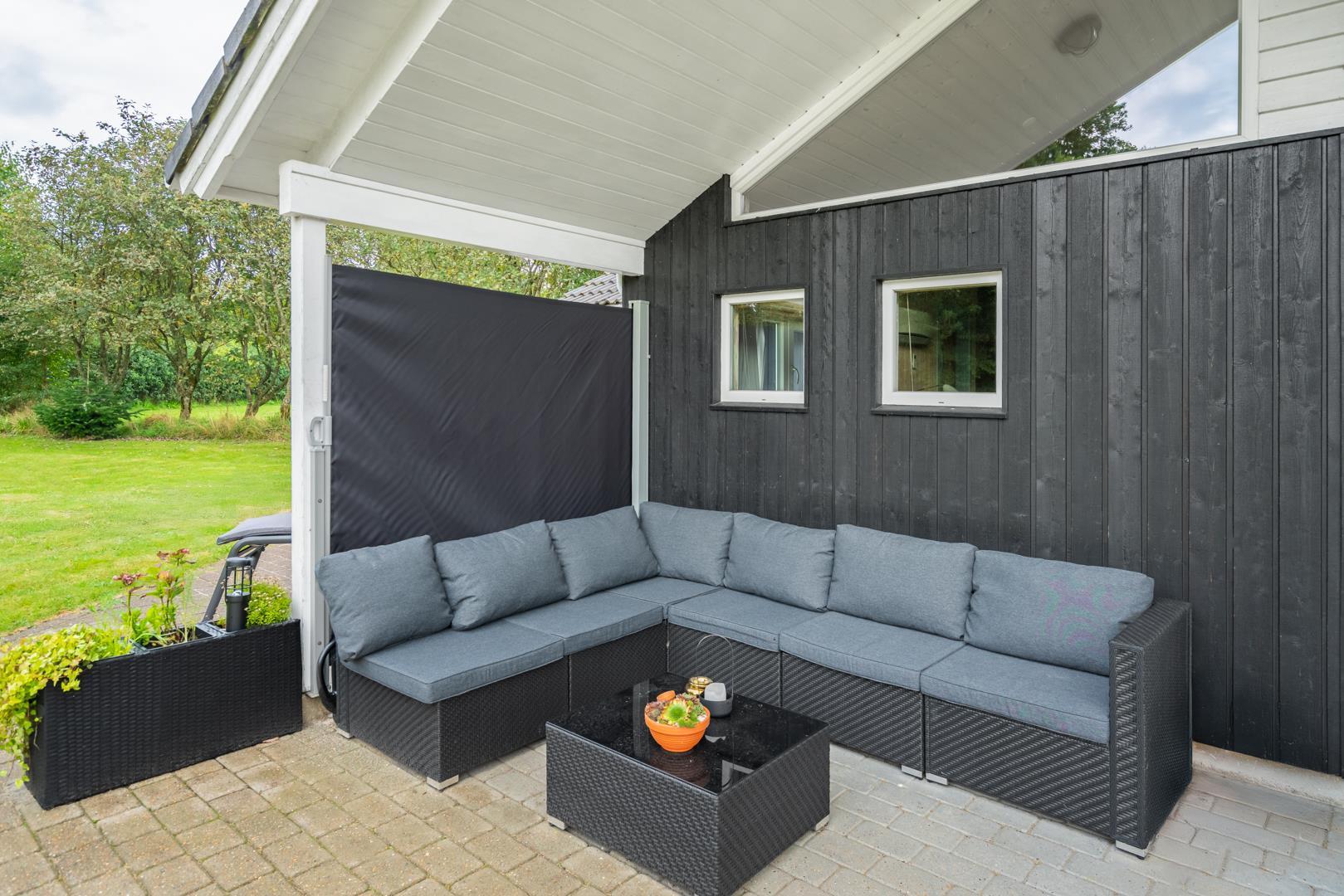 Stor terrasse med flere sidde muligheder, en del af terrassen er overdækket og vil kunne benyttes en stor del af året.