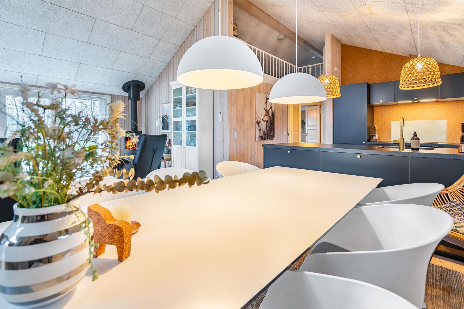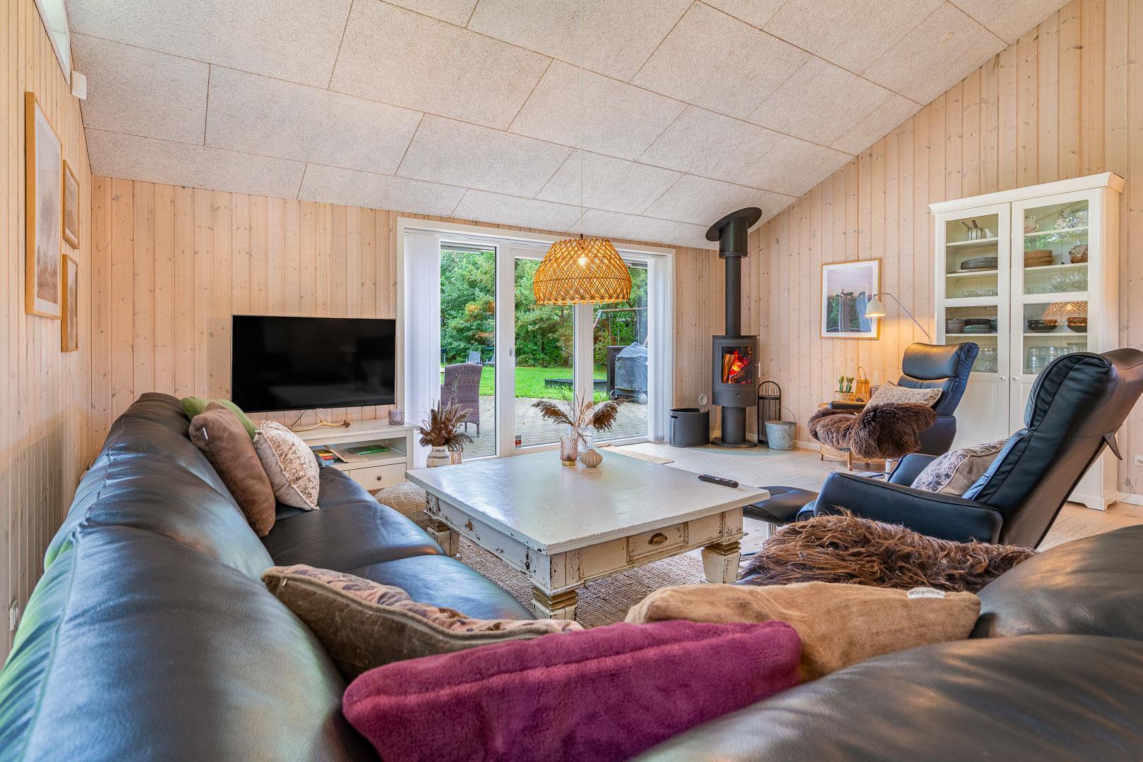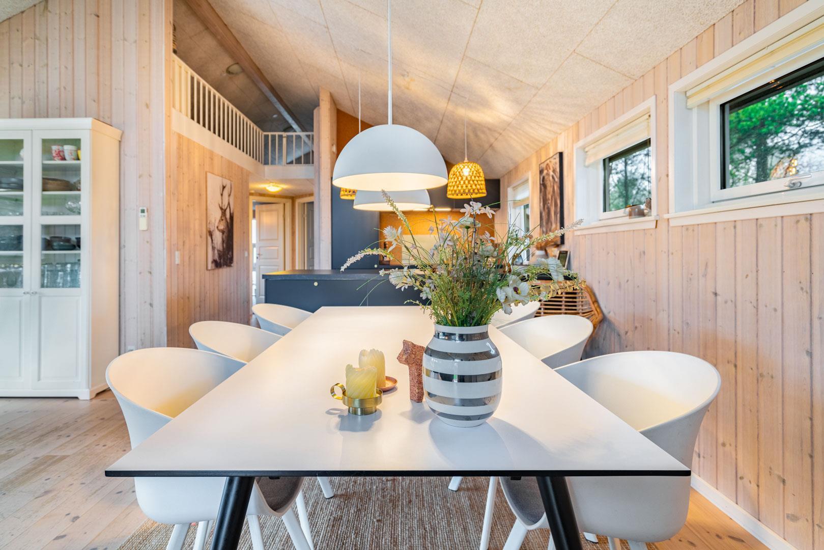 Personligt indrettet sommerhus med spabad, beliggende på en stor, tilbagetrukket naturgrund i det familievenlige Jegum Ferieland på adressen Blomstervangen 114. Køkkenet ligger i åben forbindelse til en hyggelig stue med brændeovn samt varmepumpe . Herfra er der opgang til husets meget børnevenlige hems med bl.a. hyggeområde med madrasser, spil osv. Omkring huset er der opført flere terrasser.