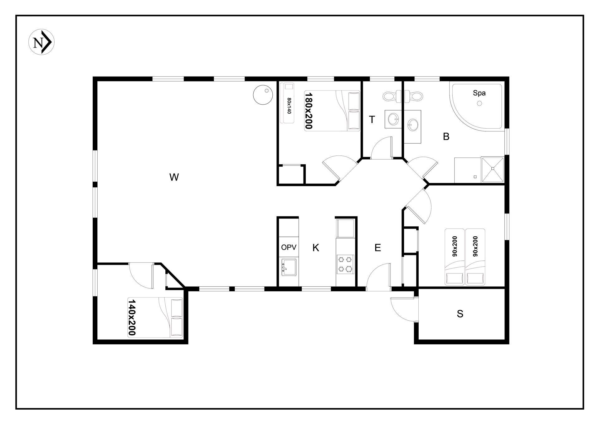 Sengestørrelse: 1 dobbeltseng med 2 madrasser 90 x 200 cm + 1 dobbeltseng 180 x 200 cm + 1 dobbeltseng 140 x 200 cm + 1 køjeseng 80 x 140 cm.