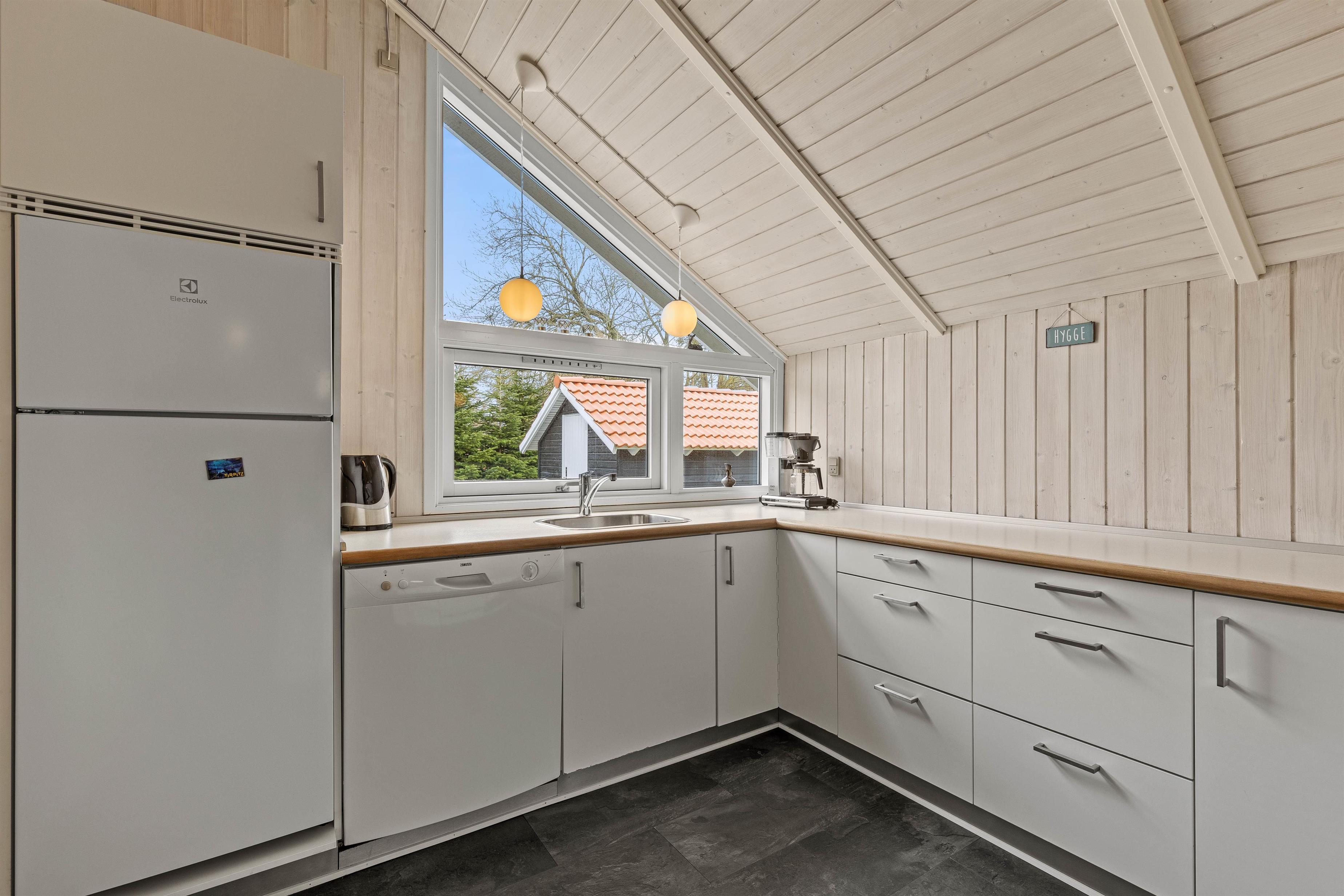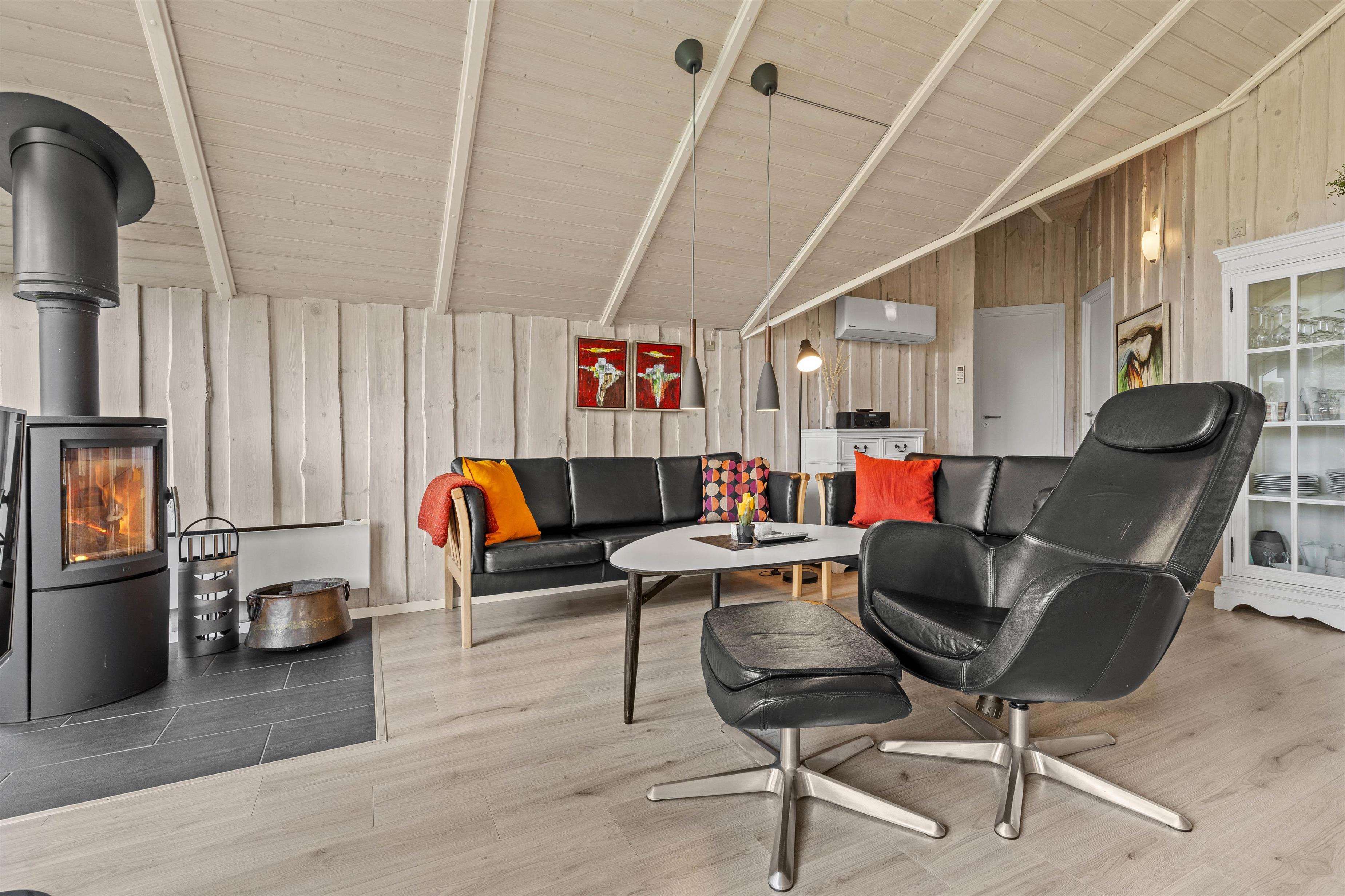 Husets hjerte er det åbne opholdsrum, der forener stue og køkkenalrum i et åbent fællesrum. Saml hele familien til lækre feriemåltider, hyggelige aftener med kortspil og snoller og sene aftener på sofaen foran den knitrende brændeovn.
