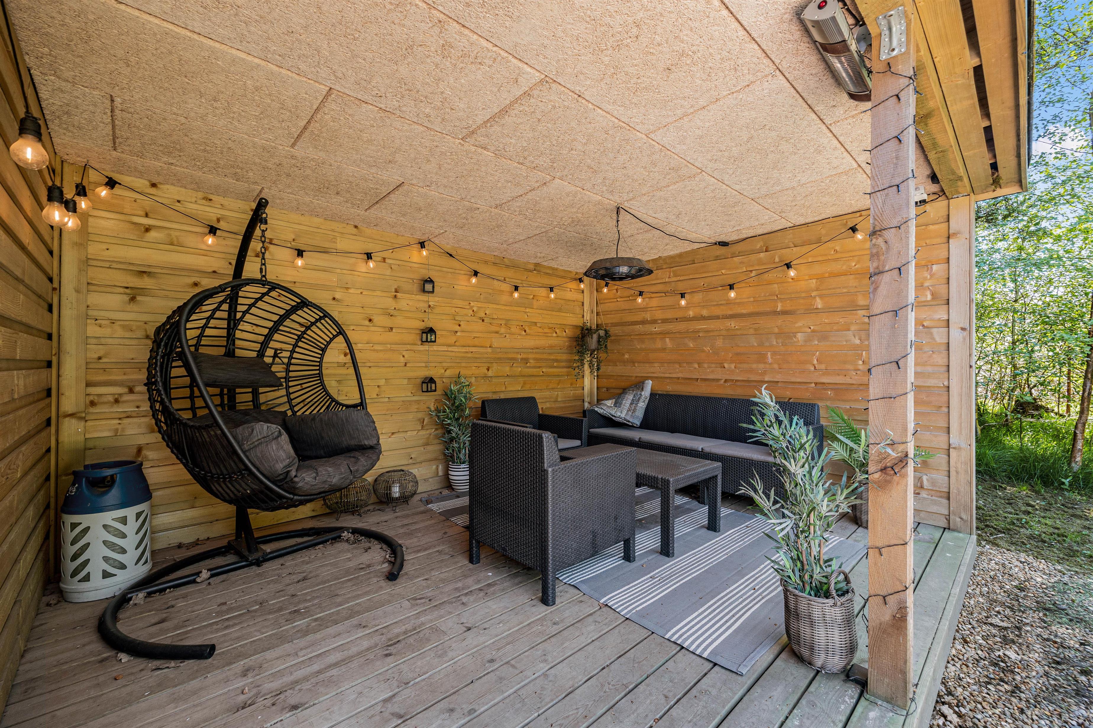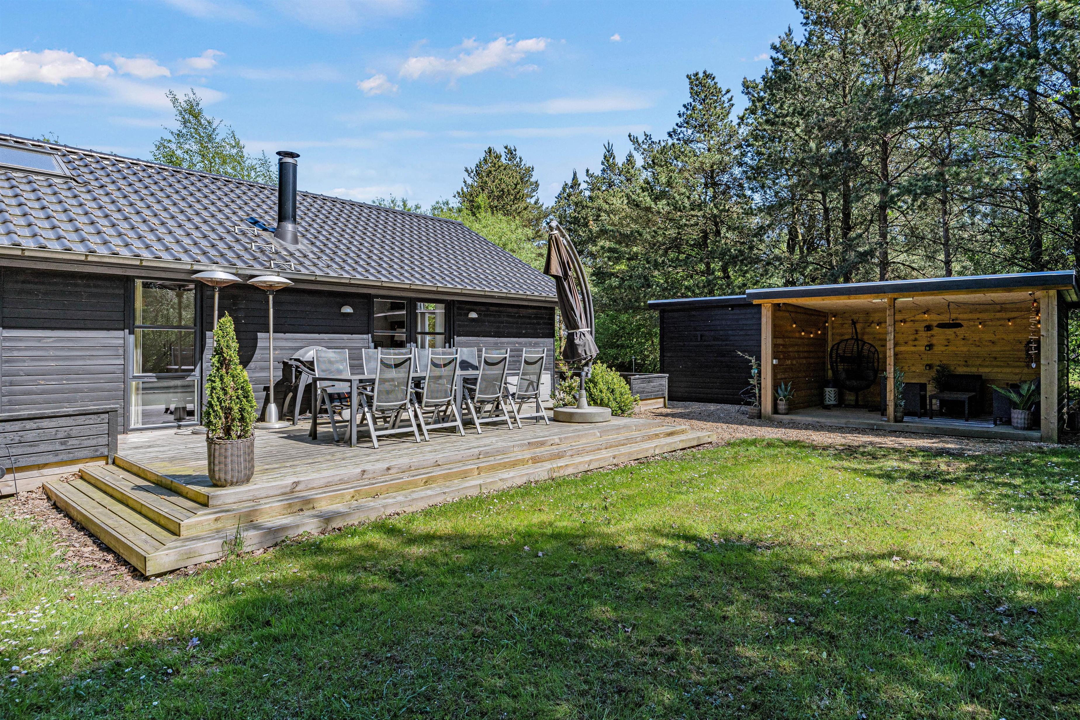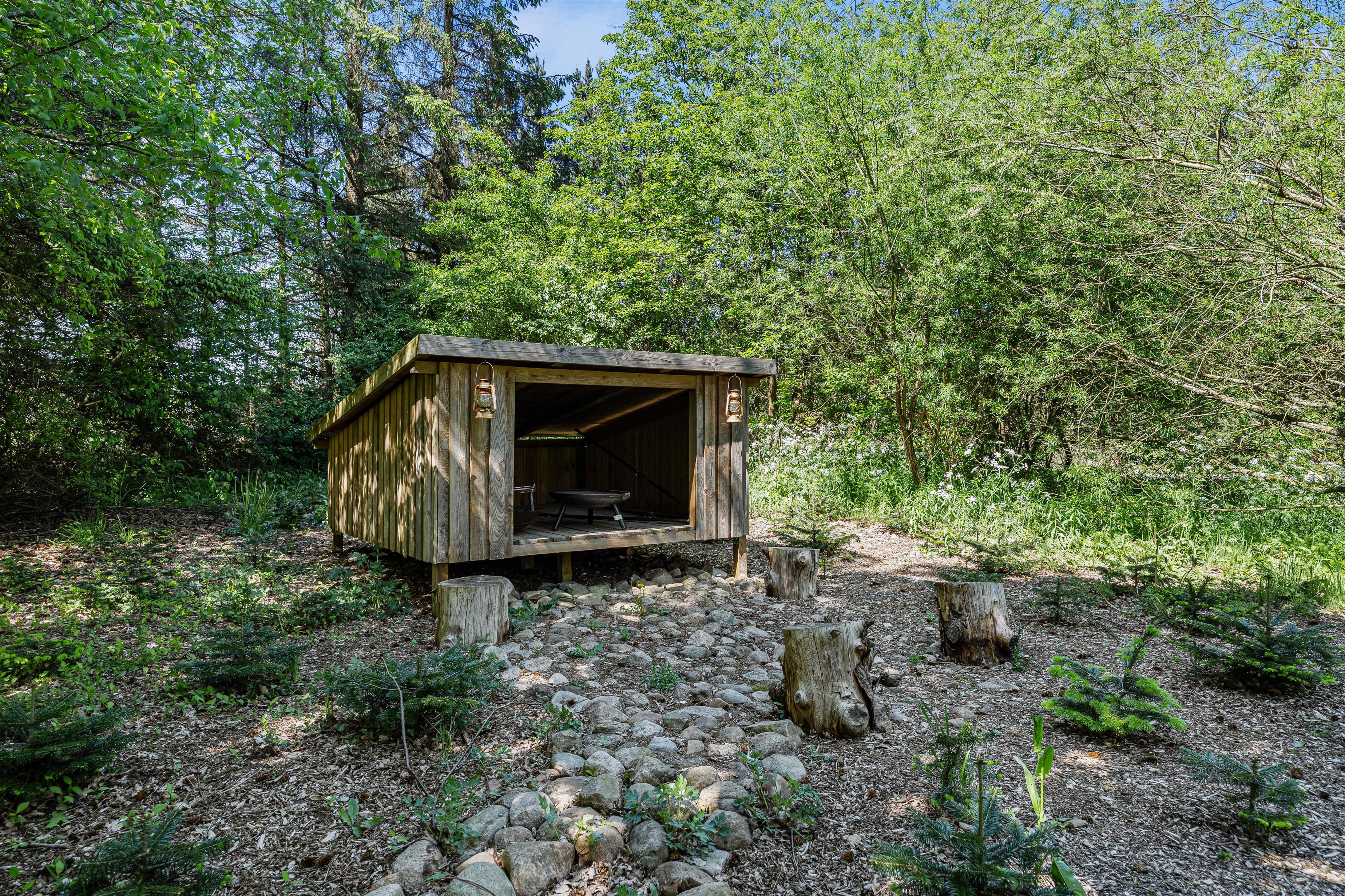 Under den overdækkede terrasse er der indrettet et hyggehjørne, der giver jer mulighed for at sidde udenfor selv i let regnvejr og nyde naturen omkring jer. For de eventyrlystne er der shelter i haven, hvis I har lyst til at tage en overnatning i det fri og bålsted, så I rigtig kan nyde udelivet.