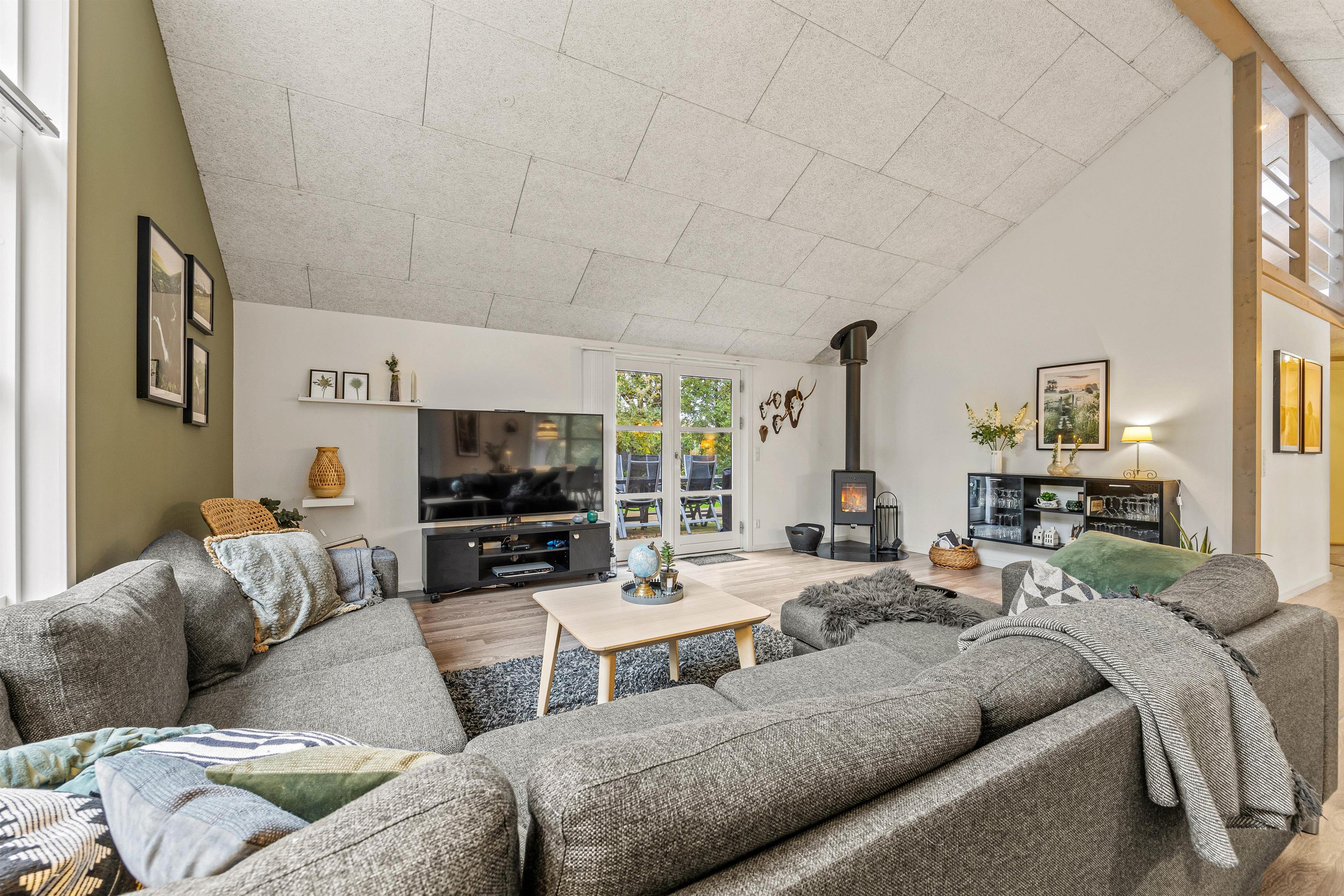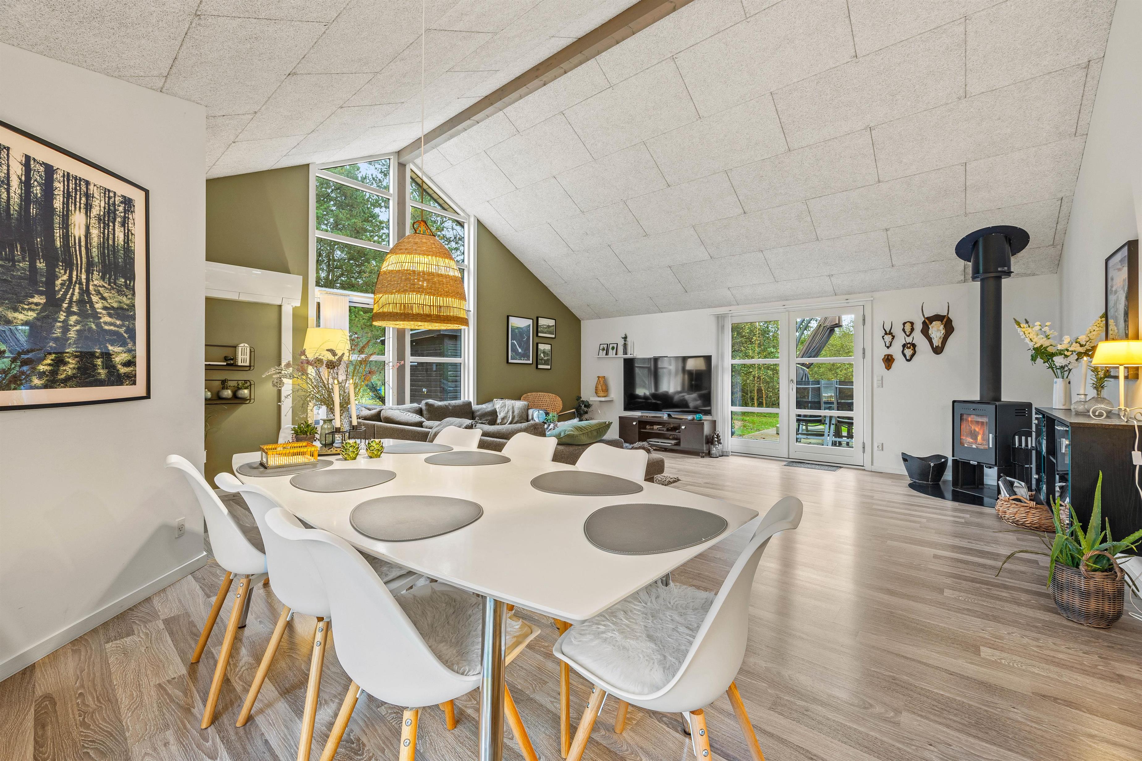 Udover brændeovnen er feriehuset også udstyret med en energisparende varmepumpe, der sørger for behagelige temperaturer og et godt indeklima.