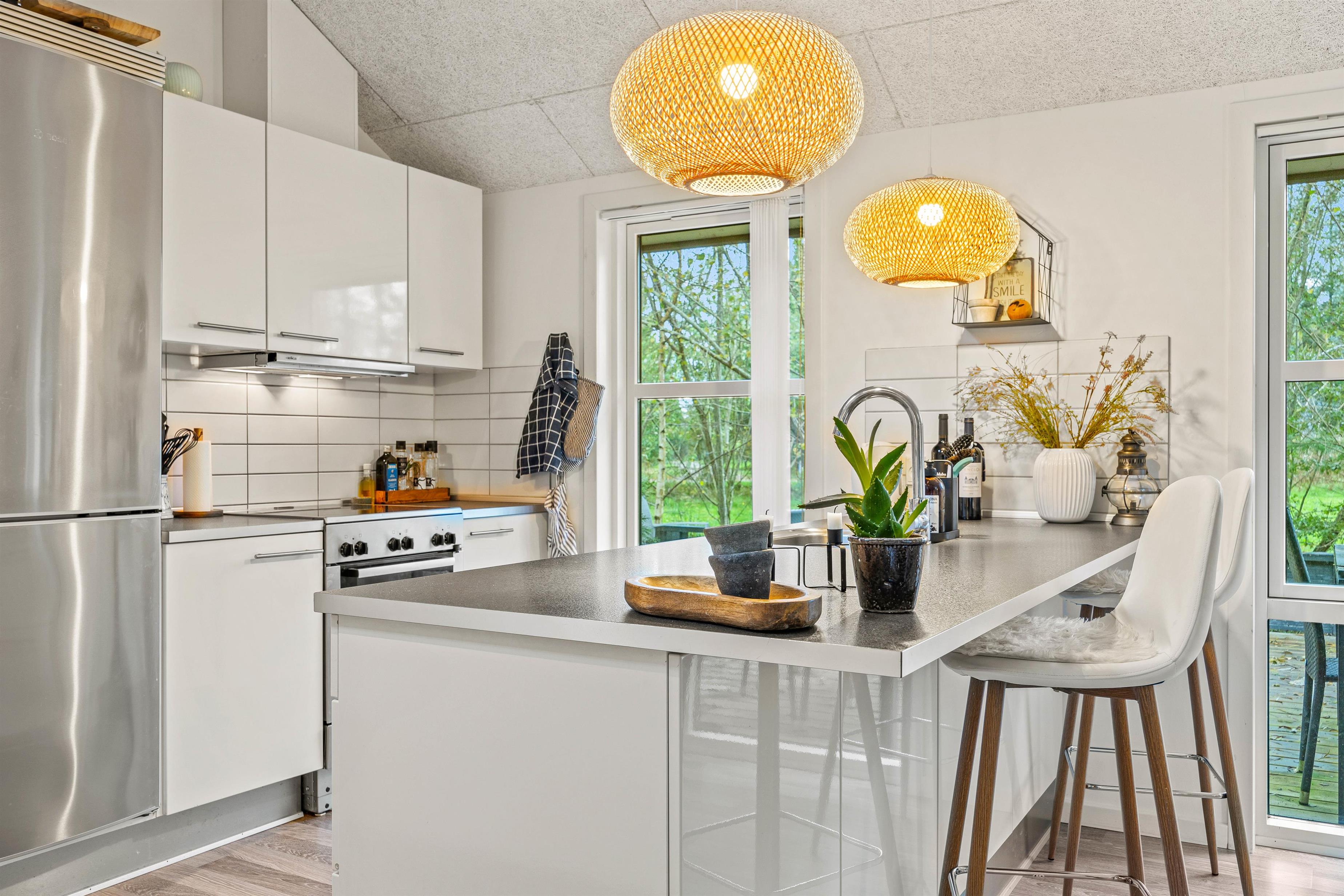 Sid behageligt i den komfortable sofagruppe og nyd aftenen foran brændeovnen. I det fuldt udstyrede køkken med opvaskemaskine finder I alt, hvad I behøver til madlavningen. I har endda her også en separat 70 L fryser til jeres fødevarer – og vaskemaskine og tørretumbler, så I kan friske jeres tøj op under opholdet.