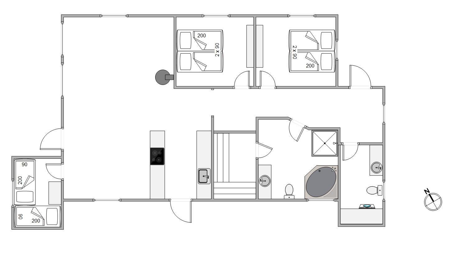 Sommerhuset har 3 soveværelser: 2 værelser med dobbeltsenge og 1 værelse med 2 enkeltsenge, så der er god plads til at hele familien kan sove komfortabelt. Badeværelset er moderne og byder på ekstra luksus med gulvvarme, sauna og tømmespa for ultimativ afslapning. Der findes også et ekstra gæstetoilet for at sikre alles bekvemmelighed under opholdet.