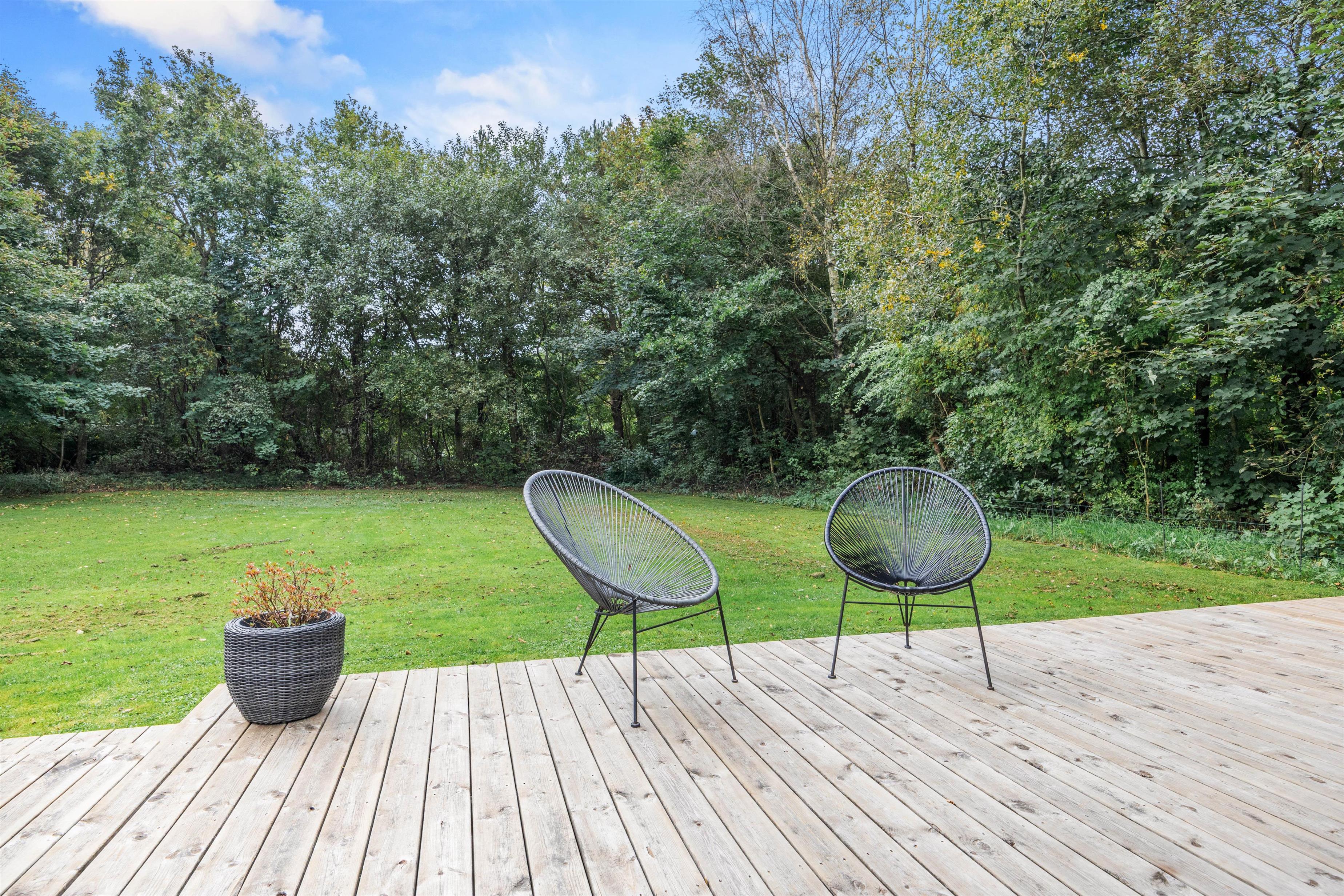 Fra stuen kan I gå direkte ud på husets terrasse, der er delvis overdækket. Her kan hunden rende fri på den store, indhegnede plænegrund. På de solrige dage kan I slappe af på sommerhuset solsenge og i havemøblerne. Foretrækker I skyggen, kan I benytte jer af parasollen eller det hyggelige, overdækkede lounge område. Den store plæne indbyder til leg og spil, så her kan børnene rigtig få brændt noget krudt af. Når feriedagen lakker mod enden, kan I tænde op i grillen og tilberede lækre feriemåltider, som kan nydes på terrassen under åben himmel.