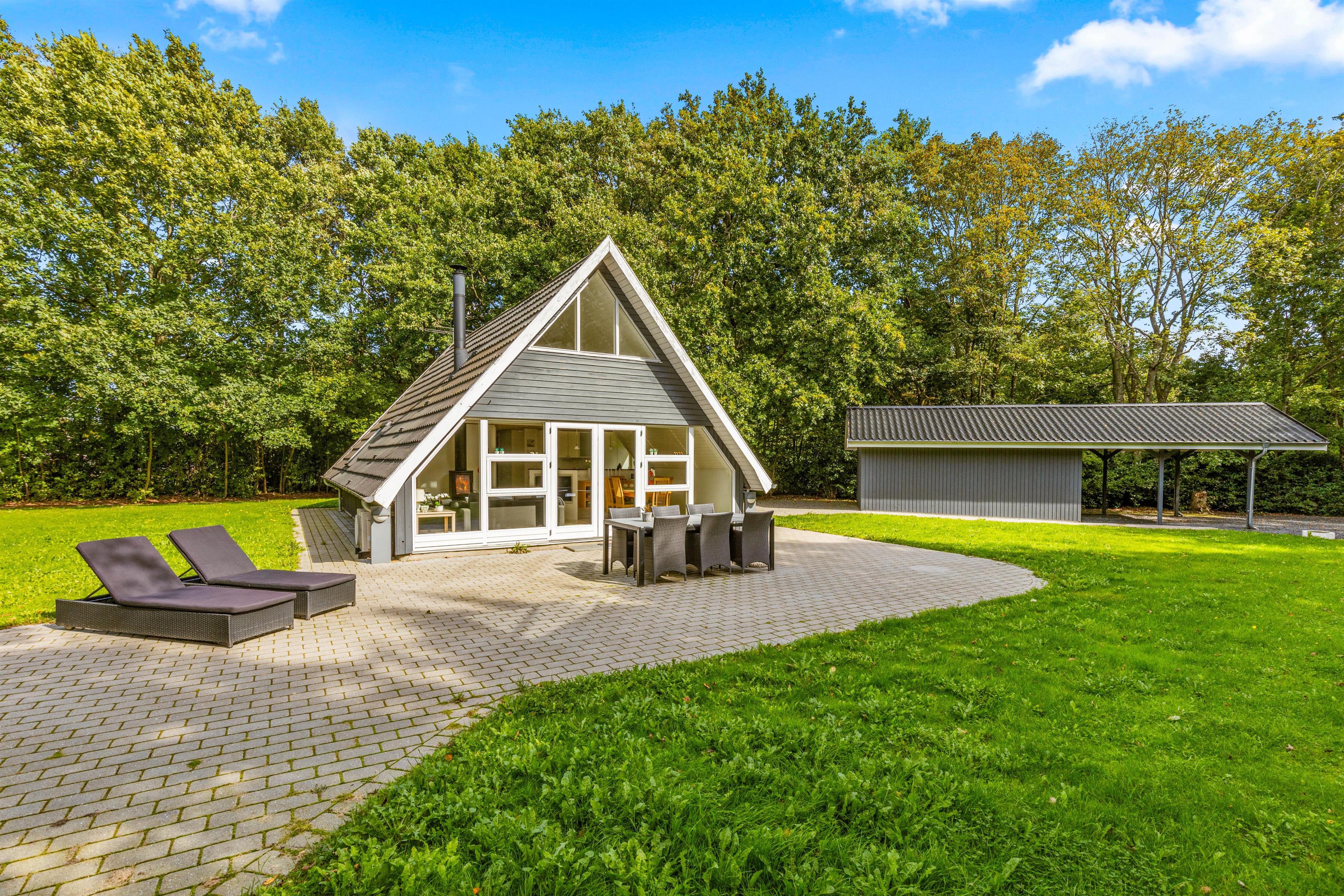 Udenfor finder I en skøn åben terrasse, der er tilgængelig direkte fra stuen. Her kan I slå jer ned i liggestolene og nyde sommerhusets afslappende atmosfære. De omkringliggende høje træer skaber en naturlig afskærmning, der sikrer jer privatliv og giver jer mulighed for at nyde naturens fred og ro.