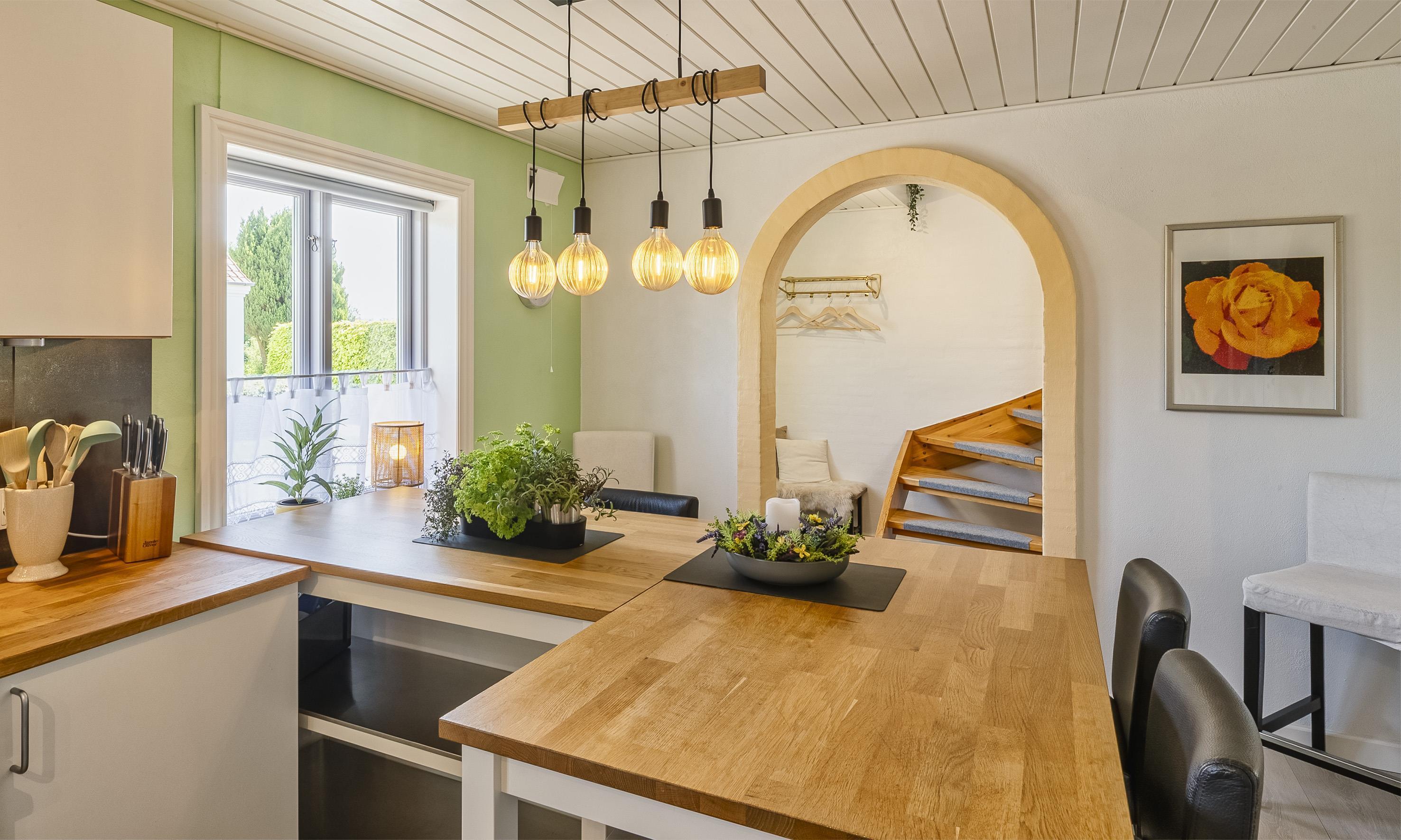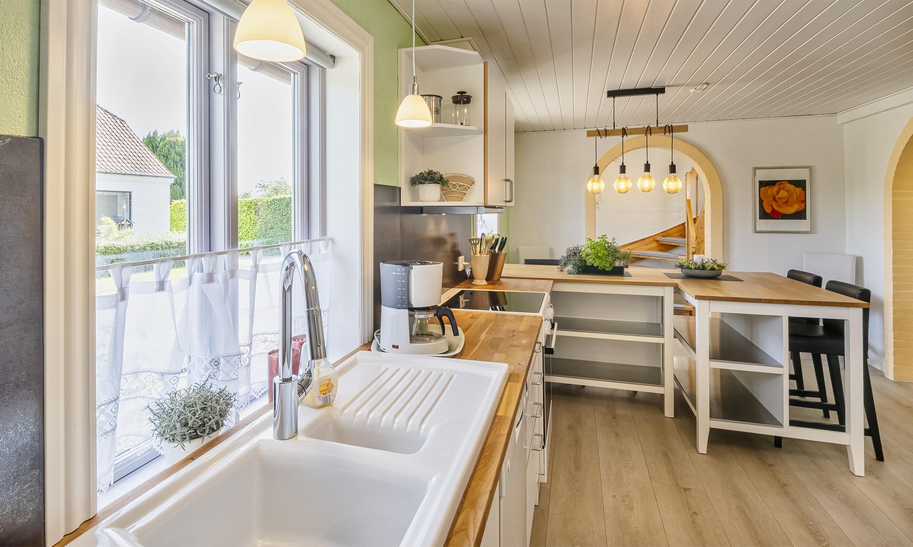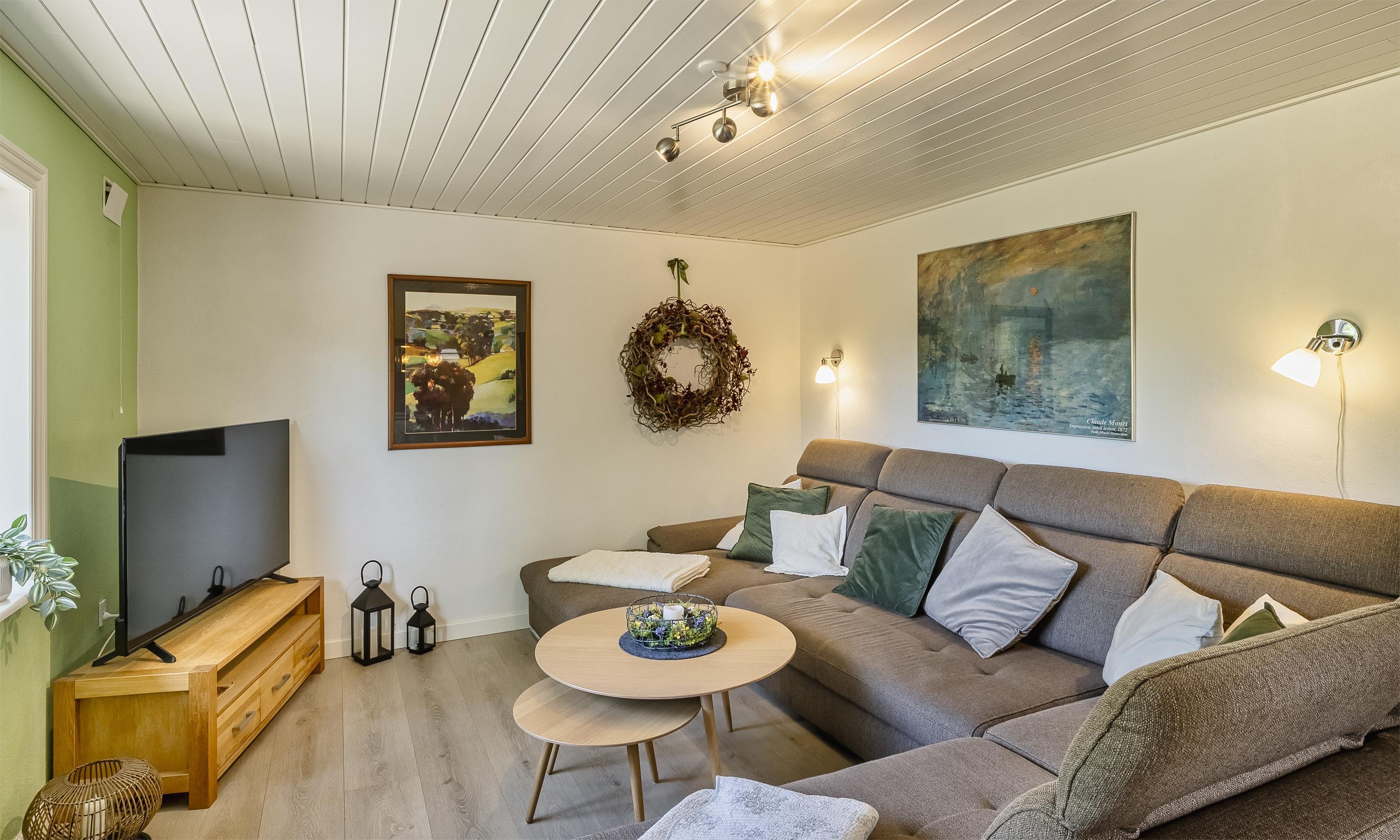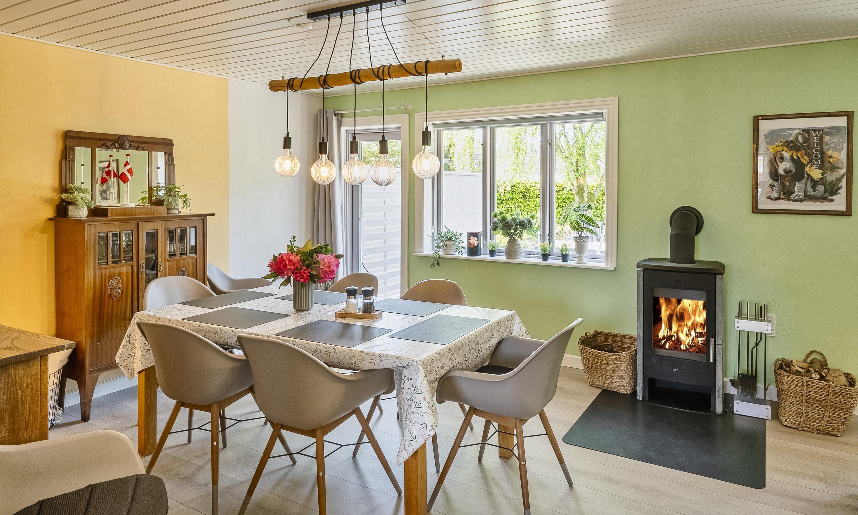Her bor I i et lyst og venligt indrettet hus med god plads til afslapning og samvær. Den åbne planløsning og det varme farvevalg skaber en hyggelig atmosfære, og med brændeovn og energivenlig luft/vand varmepumpe samt de komfortable møbler, er der rig mulighed for hyggelige aftener efter en dag med oplevelser. Feriehuset er hensigtsmæssigt indrettet og udstyret med alt, hvad I behøver – ideelt for både familier og par.
