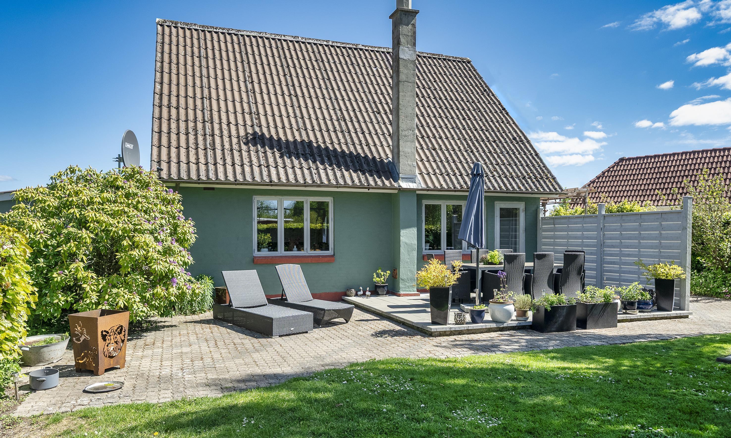 Ved huset er der en stor overdækket og læfuld terrasse, hvor aftensmaden fra grillen kan nydes - også selvom vejret ikke er perfekt.