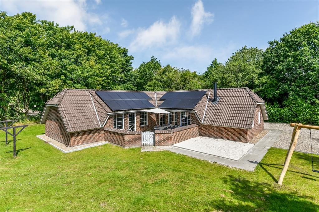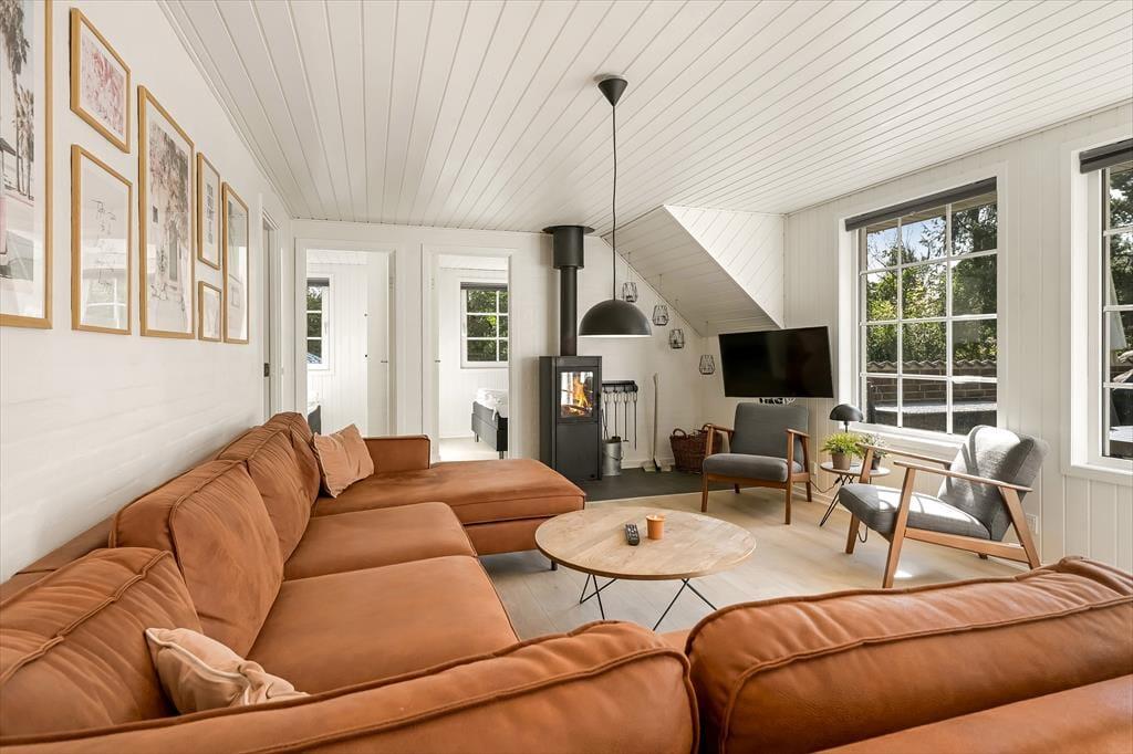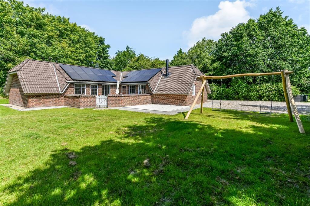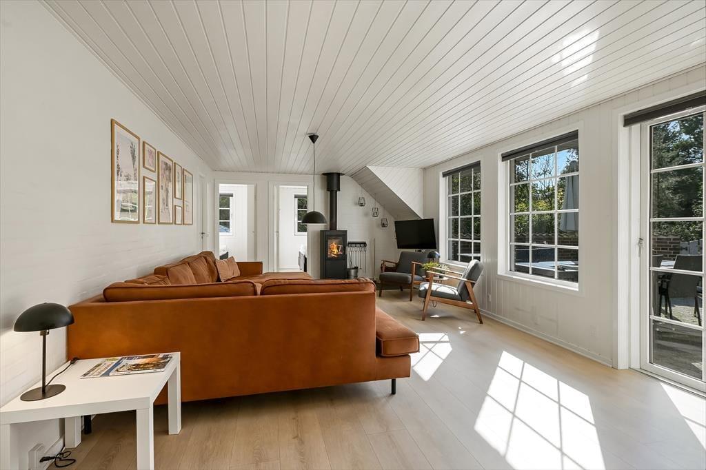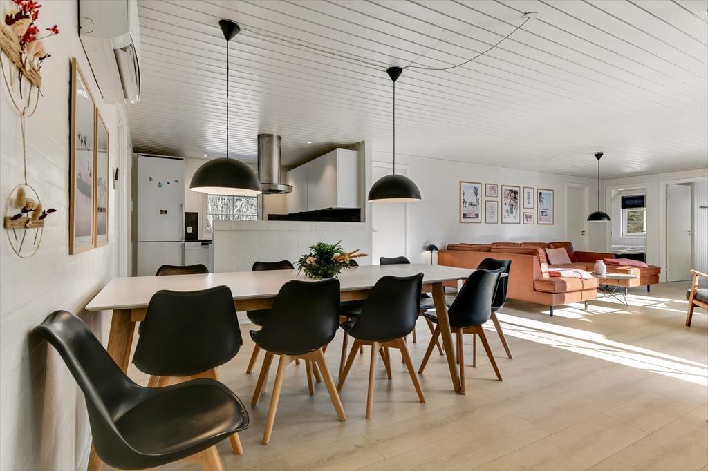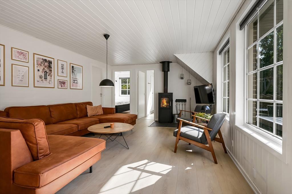Når du træder ind i sommerhuset, mødes du af en varm og indbydende atmosfære, hvor store vinduer lukker dagslyset ind og skaber en hyggelig feriestemning. Det åbne opholdsrum samler køkken, spiseområde og stue i ét, så familien kan være sammen om madlavningen, et brætspil eller en god film på sofaen. Trænger du til ekstra forkælelse, kan du tage en dukkert i den indendørs swimmingpool, som indbyder til timevis af vandleg og afslapning. Solceller på taget sikrer desuden et energivenligt ophold, så du kan nyde ferien med god samvittighed.
