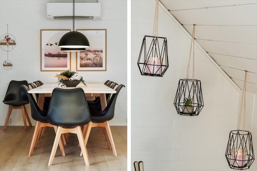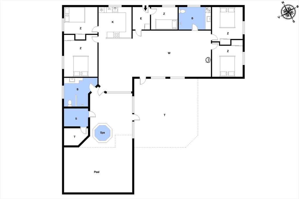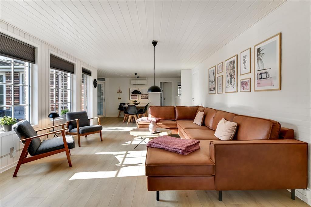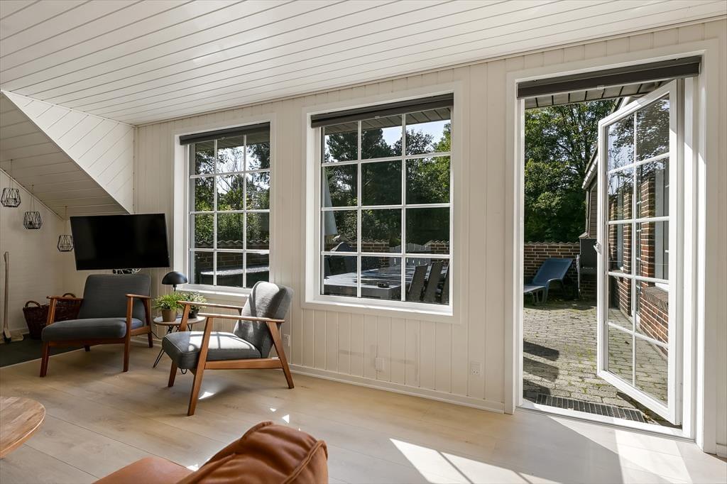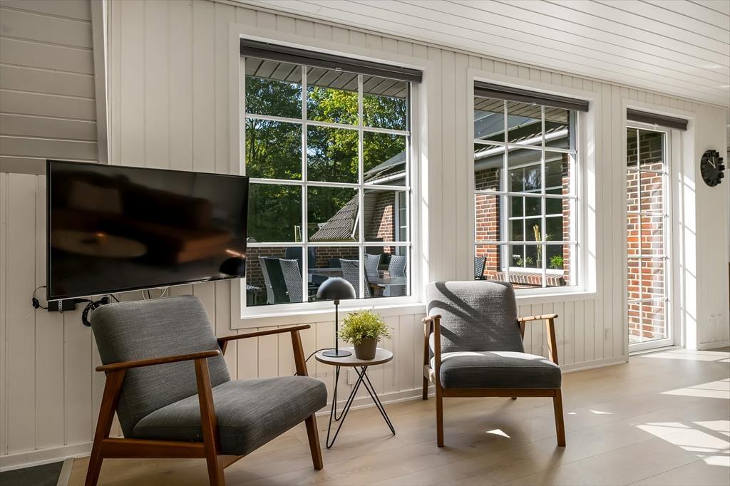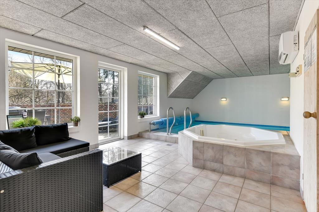 Når du træder ind i sommerhuset, mødes du af en varm og indbydende atmosfære, hvor store vinduer lukker dagslyset ind og skaber en hyggelig feriestemning. Det åbne opholdsrum samler køkken, spiseområde og stue i ét, så familien kan være sammen om madlavningen, et brætspil eller en god film på sofaen. Trænger du til ekstra forkælelse, kan du tage en dukkert i den indendørs swimmingpool, som indbyder til timevis af vandleg og afslapning. Solceller på taget sikrer desuden et energivenligt ophold, så du kan nyde ferien med god samvittighed.
