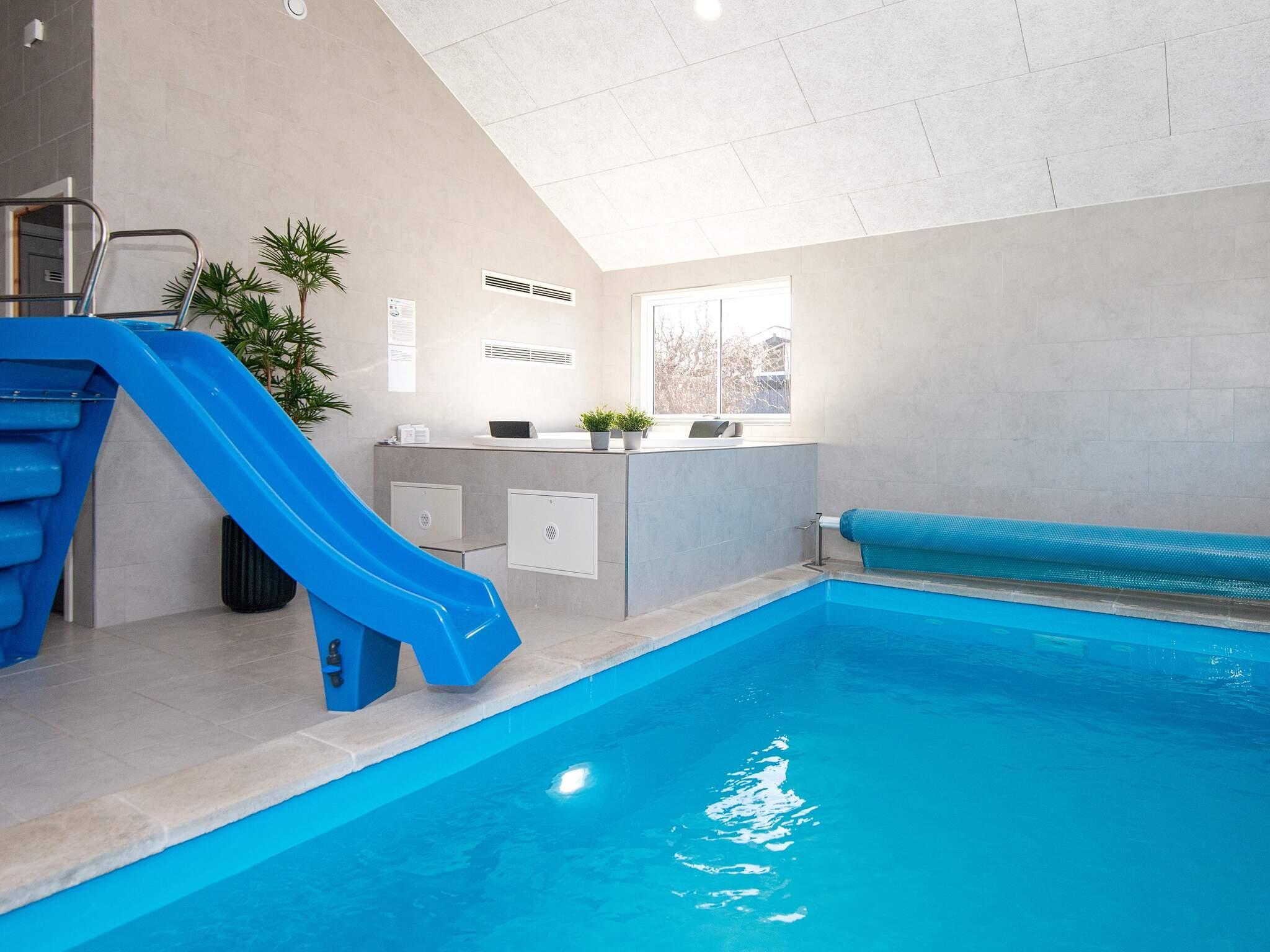 Dette velindrettede sommerhus tæt på stranden ved Juelsminde tilbyder 18 m² swimmingpool med rutschebane til børnene. Der er også svømmetræner, så hele ugen kan I forbedre konditionen med daglige svømmetag kombineret med ren afslapning i spabadet og saunaen, som befinder sig i poolrummet.