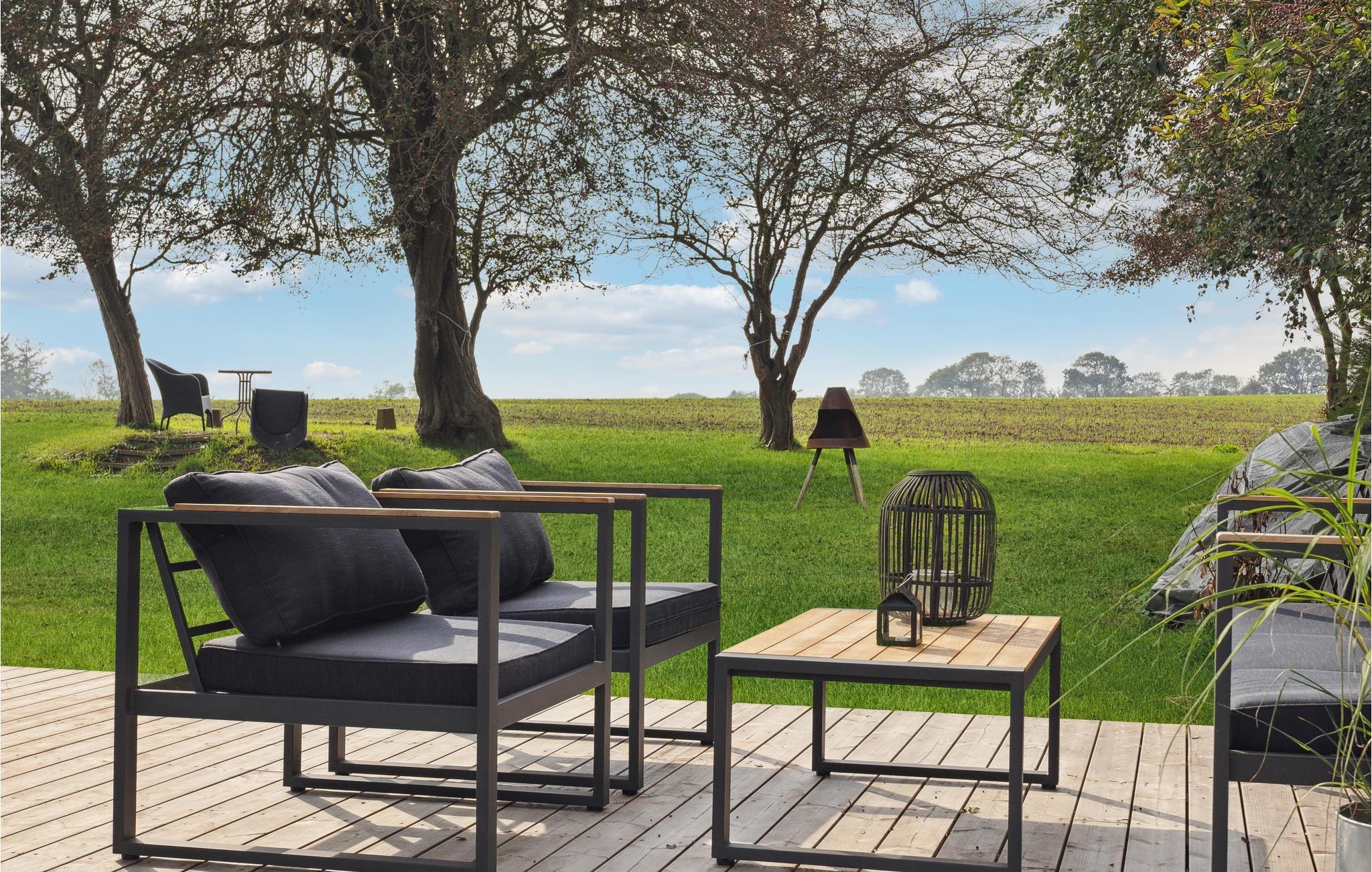 I kan også se frem til et dejligt udeliv på ferien. Rundt om huset er der en velholdt grund med gode forhold til, at børnene kan løbe og lege. På de lune sommerdage kan I gøre klar til dagens måltider på den læfyldte terrasse ved huset. I kan også finde jer til rette på den lille ekstraterrasse ud til markerne med en kop kaffe eller et glas vin sidst på dagen.