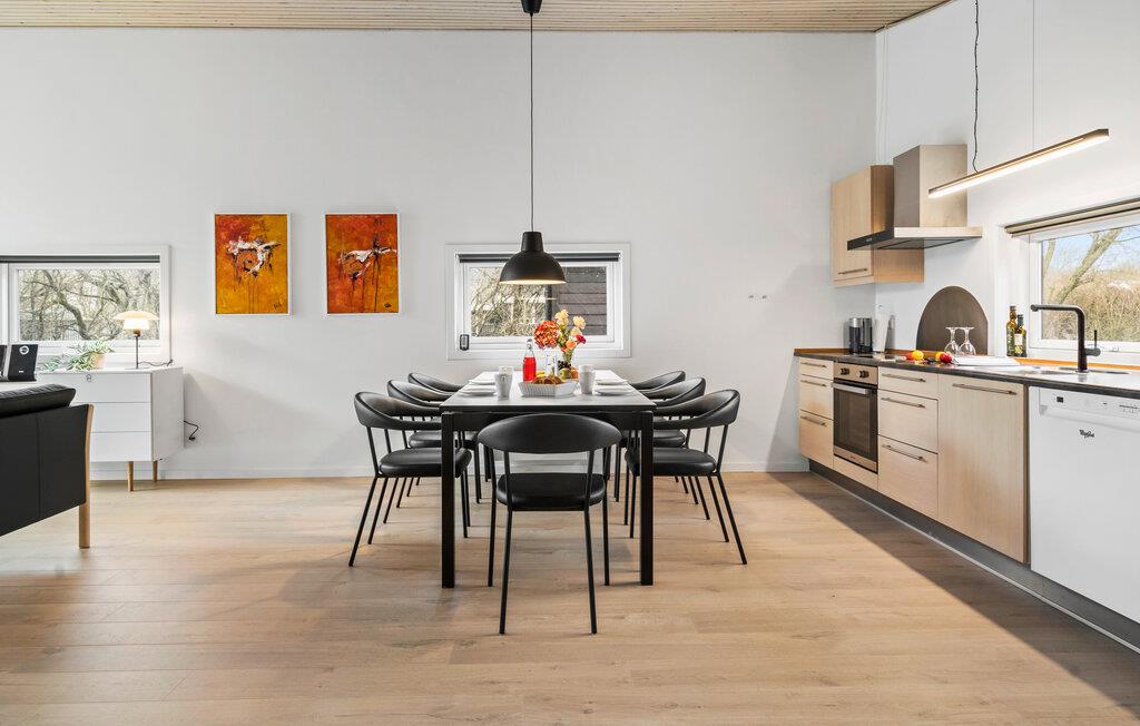 Dette attraktive smagfuldt indrettede feriehus ligger i skønne naturomgivelser i det rolige sommerhusområde Kærgården, ikke langt fra fjorden, og indbyder til en dejlig ferie spækket med oplevelser. Store gulv-til-loft-vinduer oplyser ikke kun køkken-alrummet med et naturligt lys, men giver også en skøn visuel og fysisk kontakt mellem ude og inde. Her er der udsigt for alle pengene! Hyg jer med fælles madlavning og kæmp imod hinanden i brætspilsdyster. Efter en dejlig dag på stranden kan I forkæle jer selv i spabadet. Flyt alle måltiderne udenfor på varme dage. På den åbne terrasse, smukt omfavnet af grønne buske, kan I tilbringe mange hyggelige timer under åben himmel. Stranden når I let til fods. I området er der stier, der fører til den hyggelige lille by, Vestervig.