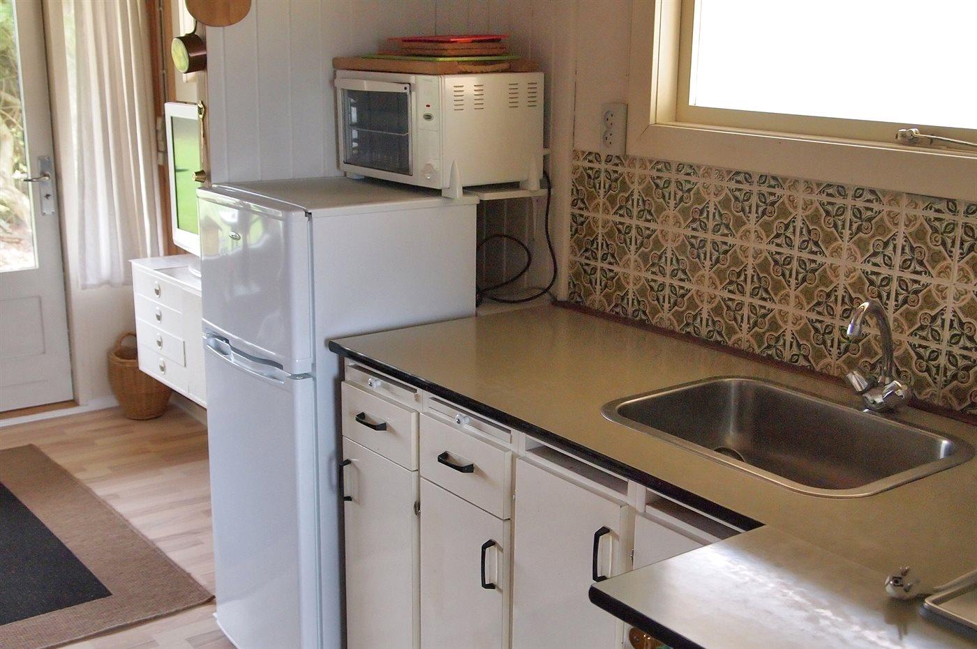 Køkkenet er udstyret med 1 køleskab. Der er 2 elkogeplader, bageovn.