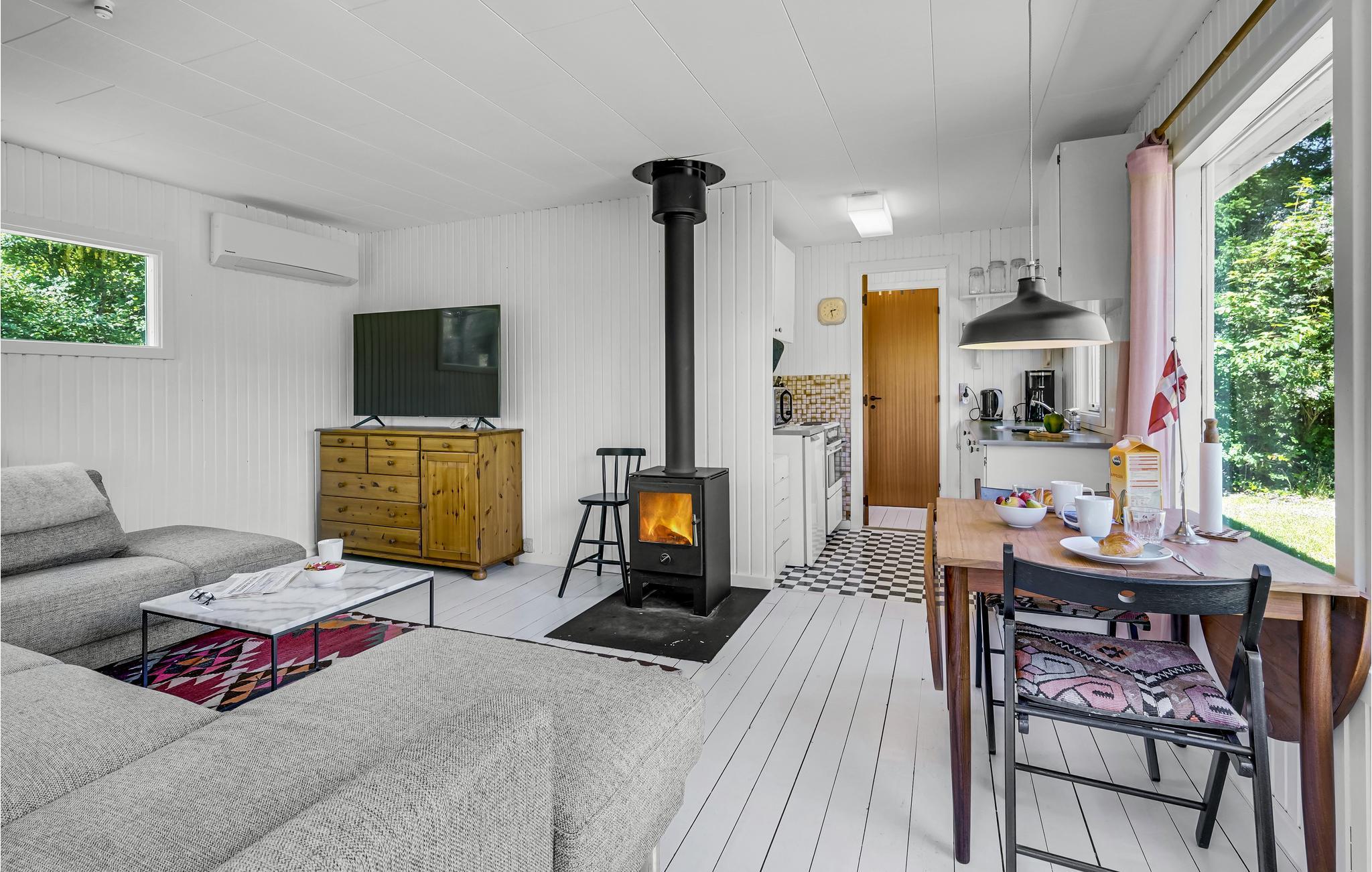 Glæd jer til dette søde lille sommerhus, som er perfekt til et par, venner eller den lille familie. Mellem træerne kan I slappe af, nyde naturens lyde og den friske luft, mens I slapper af i solen. Terrassen byder også på skyggefulde pletter, og brændeovnen i stuen skaber en hyggelig atmosfære om aftenen.