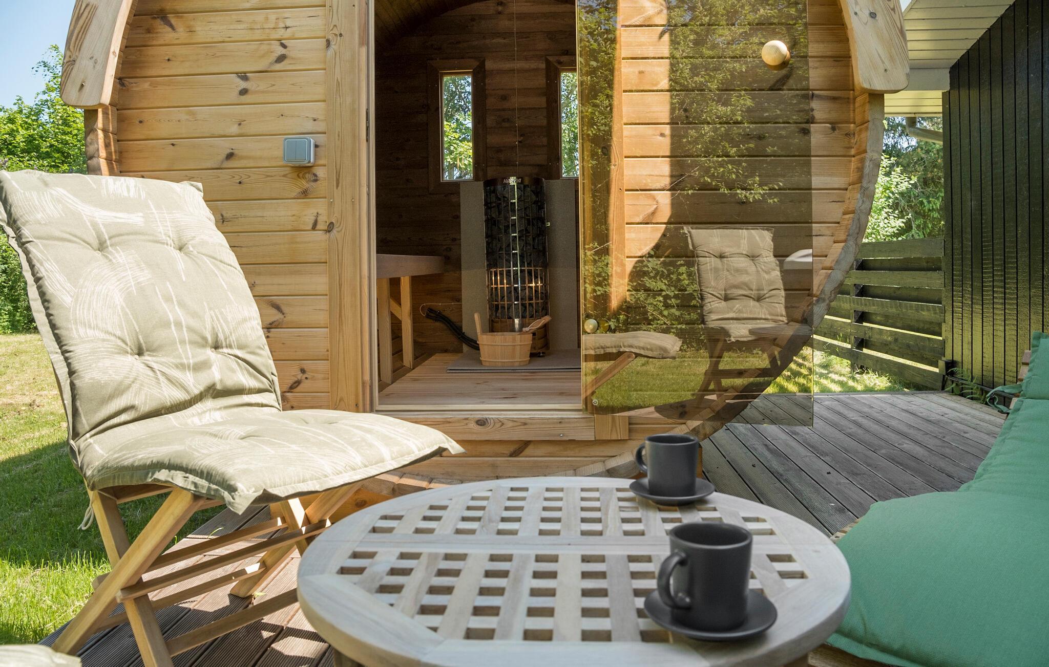 På de varme dage kan I nyde solen lige fra morgenstunden på terrassen med en god kop kaffe, inden I tager på tur. Her kan I også vende hjem efter dagens udflugter, dase i liggestolene og tænde op i grillen til et lækkert aftensmåltid under aftensolen. Og måske I skal forkæle jer selv med lidt lækker wellness i tøndesaunaen eller det udendørs spabad?