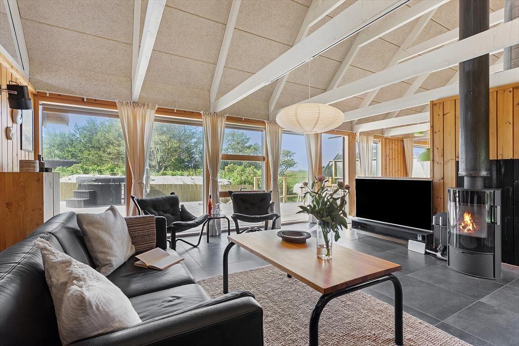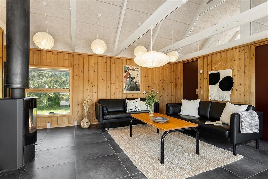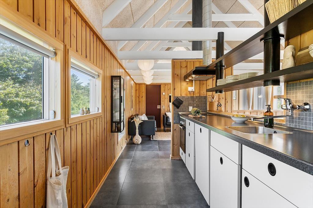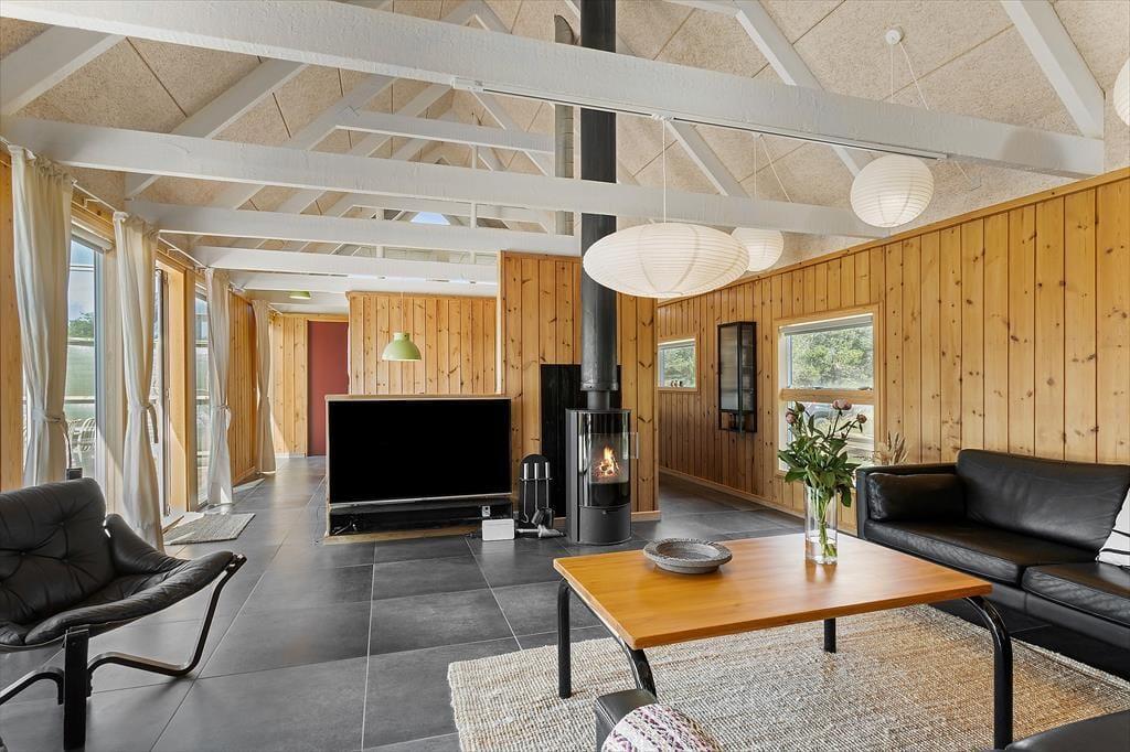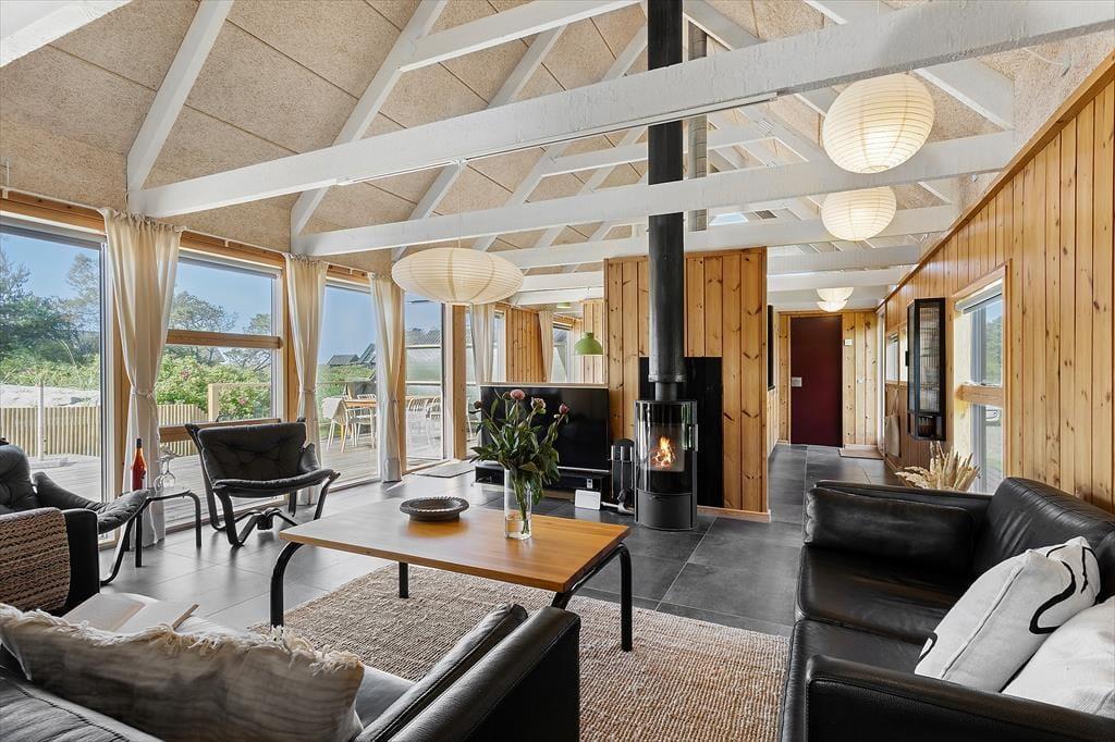 Når du træder indenfor, bliver du mødt af en lys og indbydende atmosfære, hvor sommerhusets charmerende detaljer skaber den perfekte ramme for en afslappende ferie. De åbne opholdsrum med loft til kip og store vinduespartier gør, at lyset strømmer ind, og naturens farver bliver en del af indretningen. I stuen kan du samle familie og venner omkring brændeovnen på kølige aftener eller nyde en god bog i sofaen med en varm kop kaffe i hånden. Det rummelige køkken er veludstyret, så du nemt kan tilberede lækre feriemåltider, mens feriestemningen breder sig i huset.